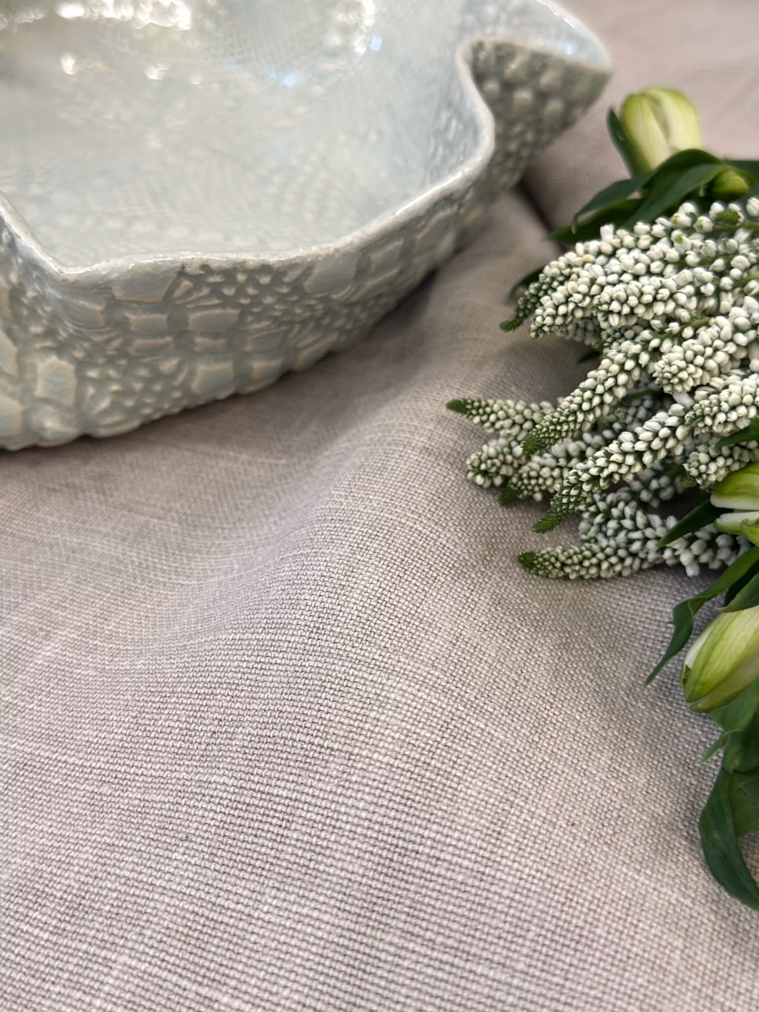 Et medium størrelse fat med høy kant med avtrykk fra en hekleduk inni. Utenpå er avtrykket fra et gammelt sengeteppe.