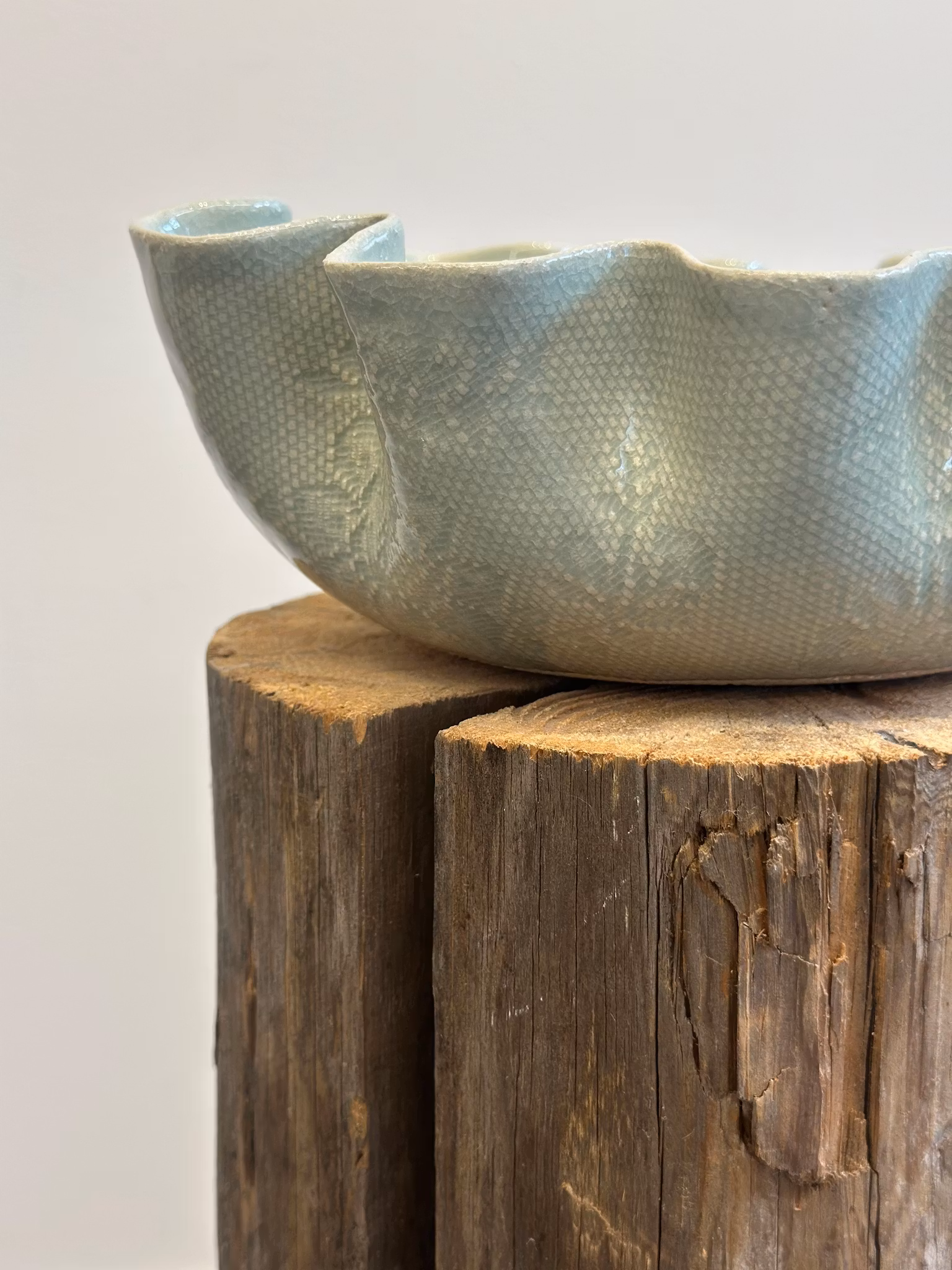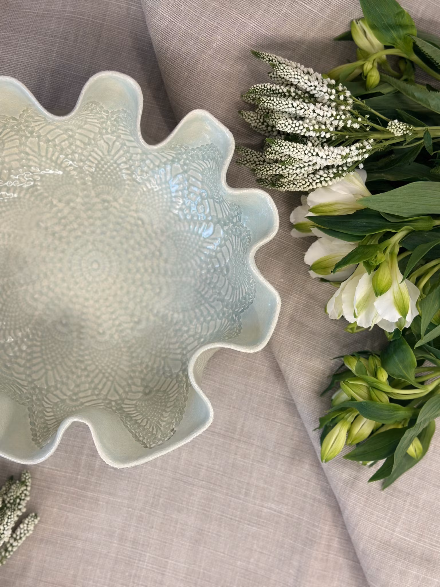En bolle med høy kant og et nydelig avtrykk fra en heklet duk hvor du ser hele duken. Derfor også leirekant øverst. Utenpå er det mønster fra en gammel duk.