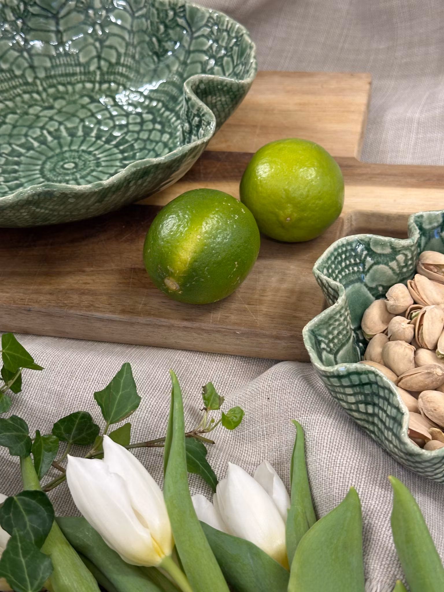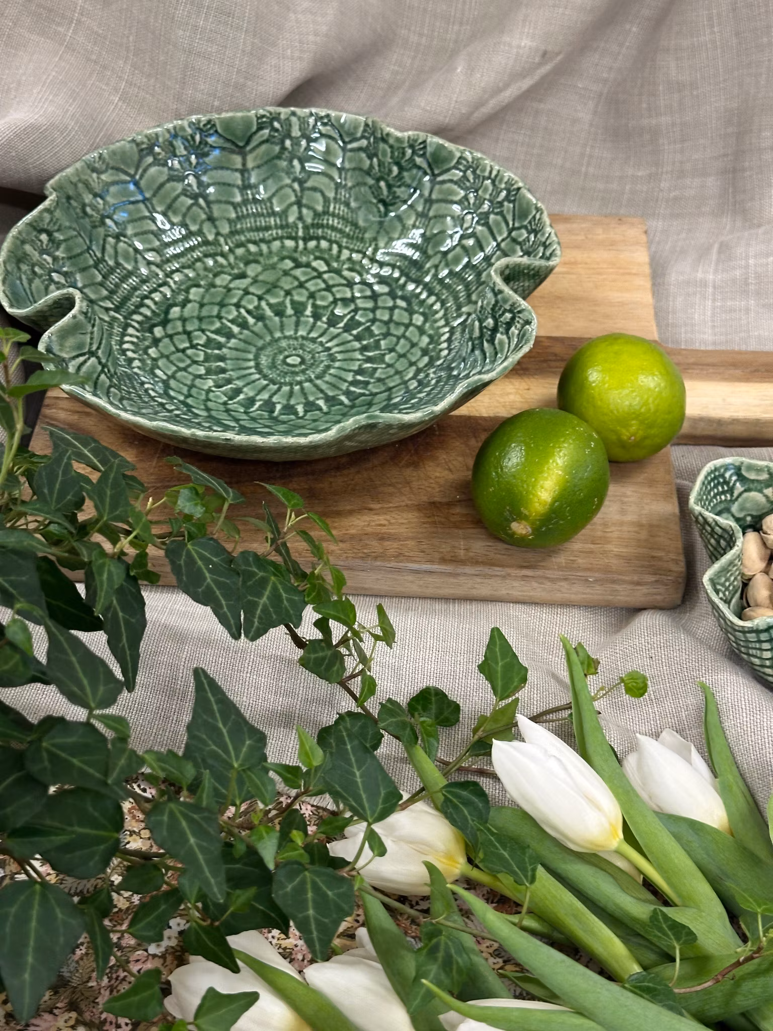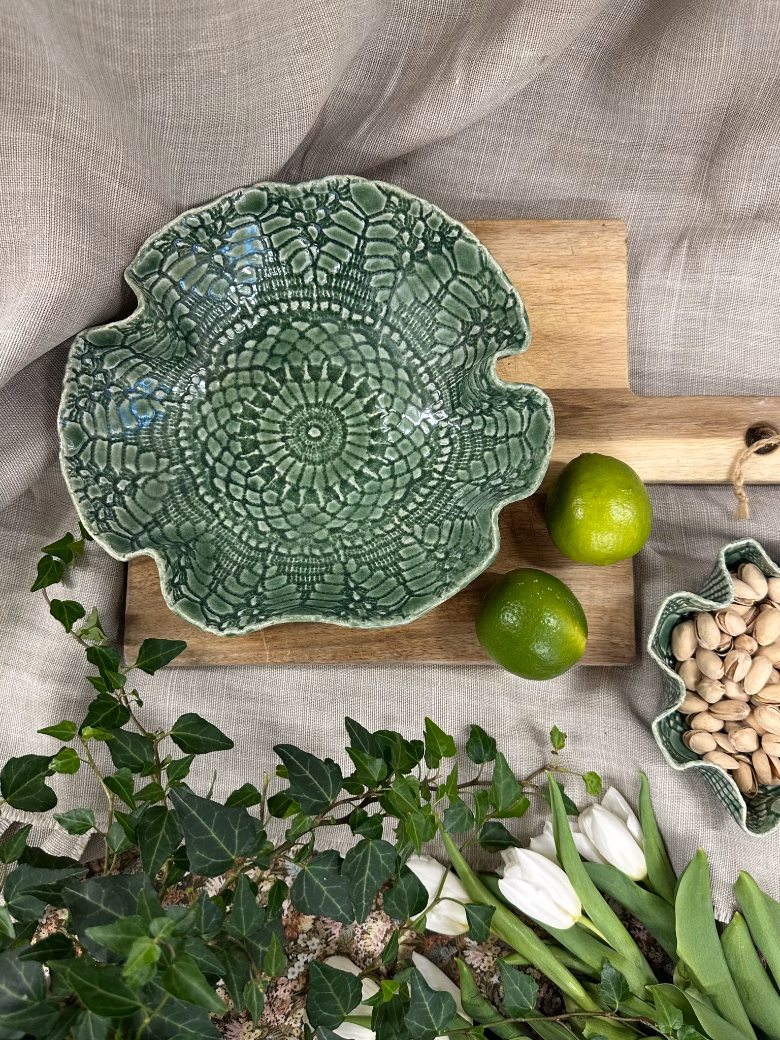 Jadegrønn skål med avtrykk av en mindre heklet duk inni. Sart avtrykk på utsiden.