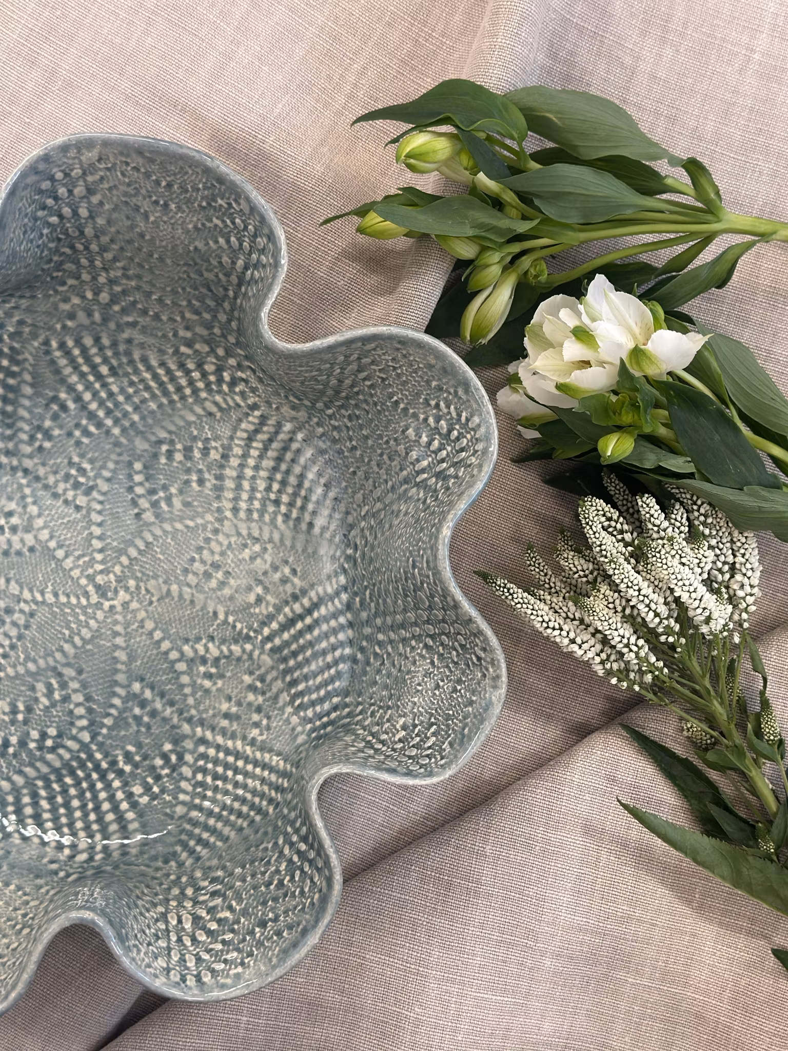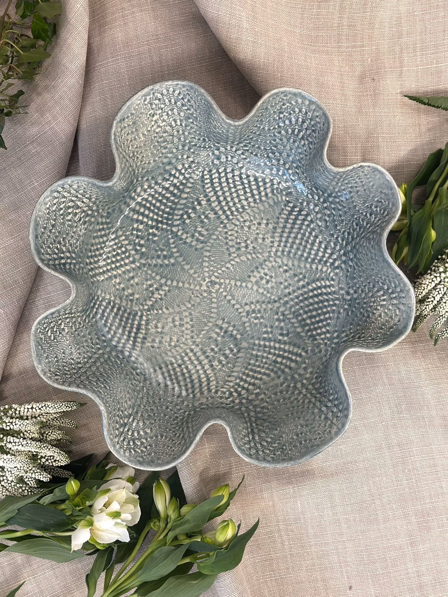 Et medium ++ størrelse fat med høy kant med avtrykk fra en mindre hekleduk inni. Utenpå er avtrykket fra en gammel gardin.
