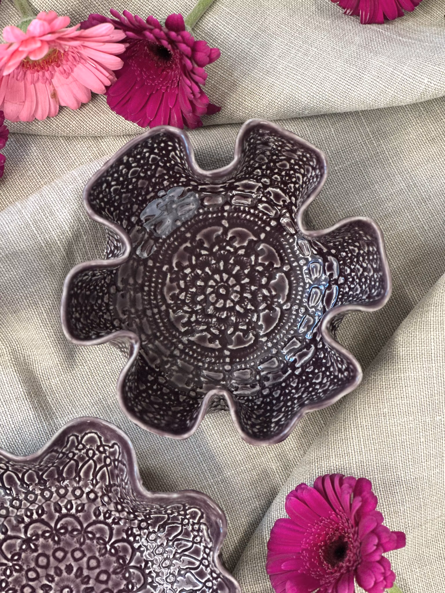 Liten skål med avtrykk fra hekleduk inni og utenpå. Nydelig til å bare stå på bordet, men perfekt til nøtter, sjokolade, salt, sauser eller dipper eller kanskje til smykkene dine på badet?