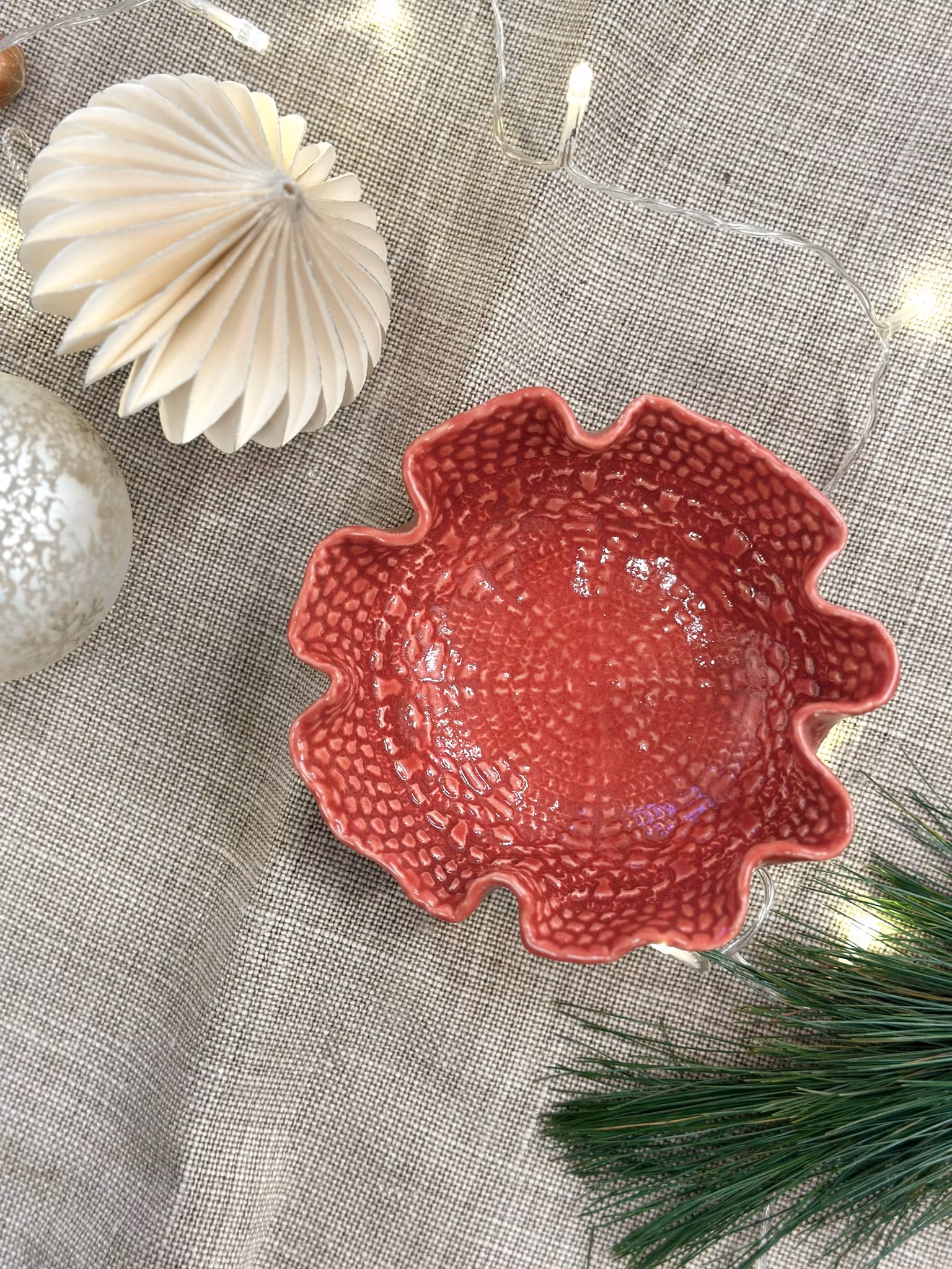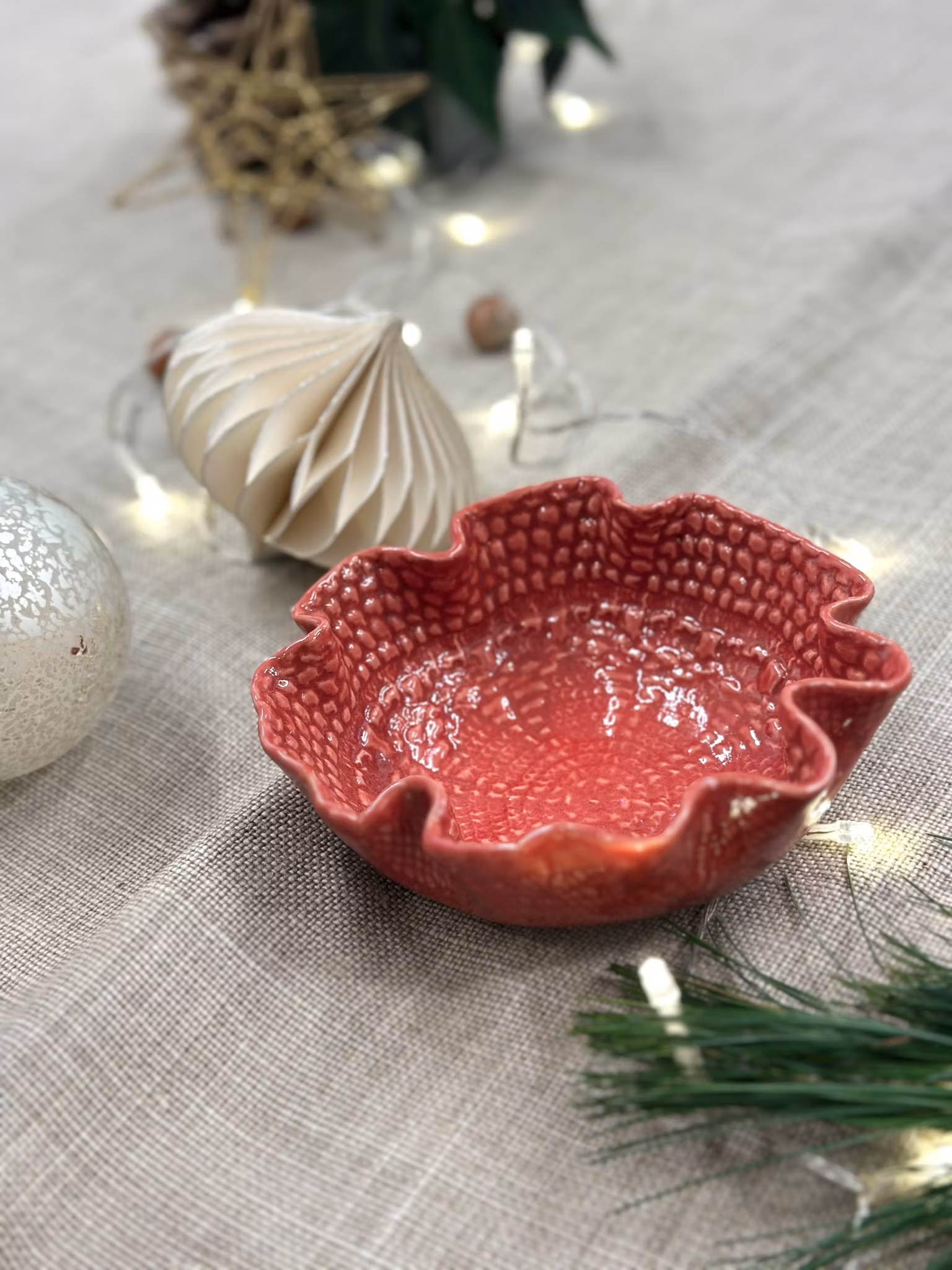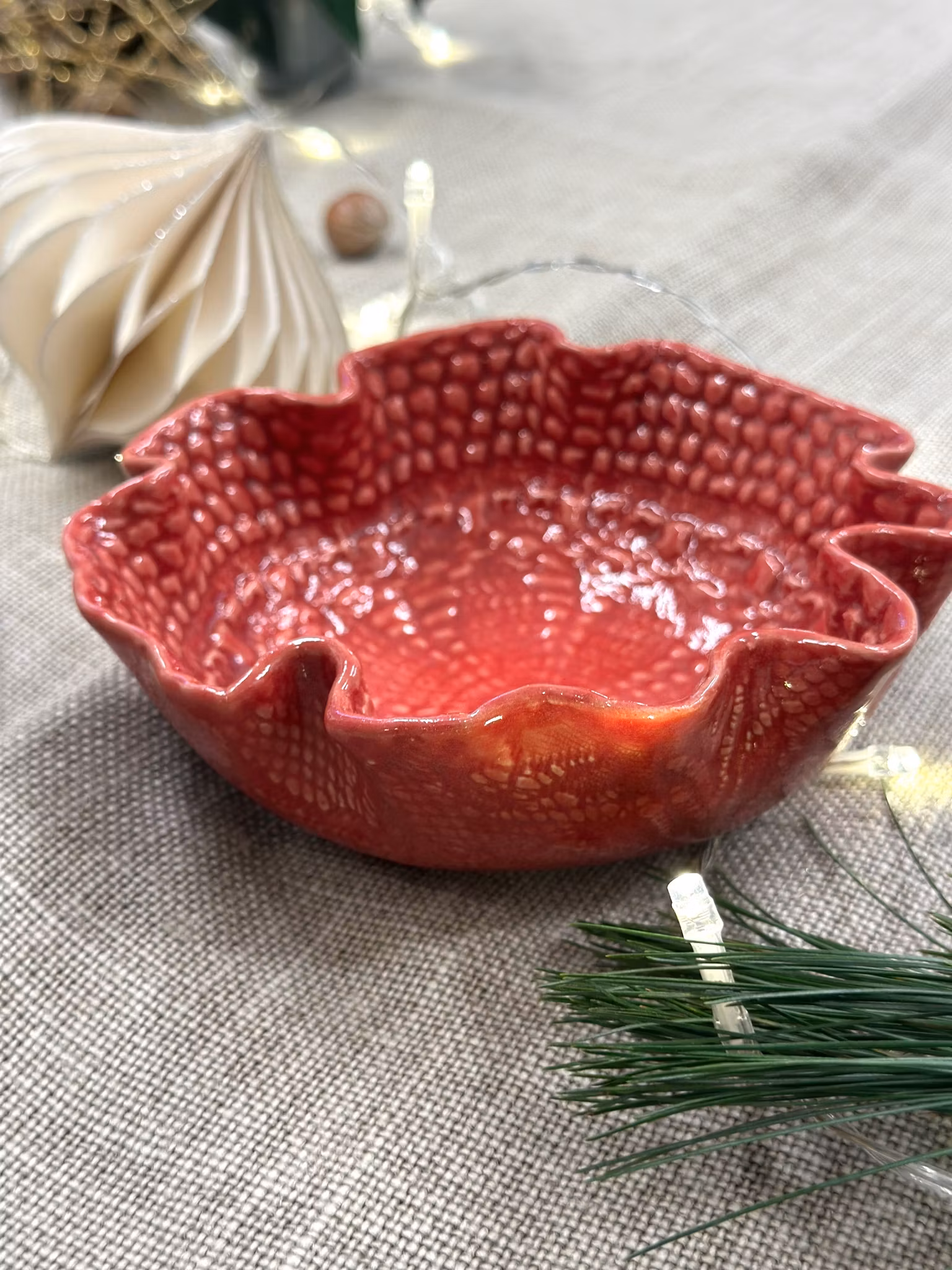 Liten skål med nydelig mønster med avtrykk av en liten heklet duk inni og en annen utenpå.
