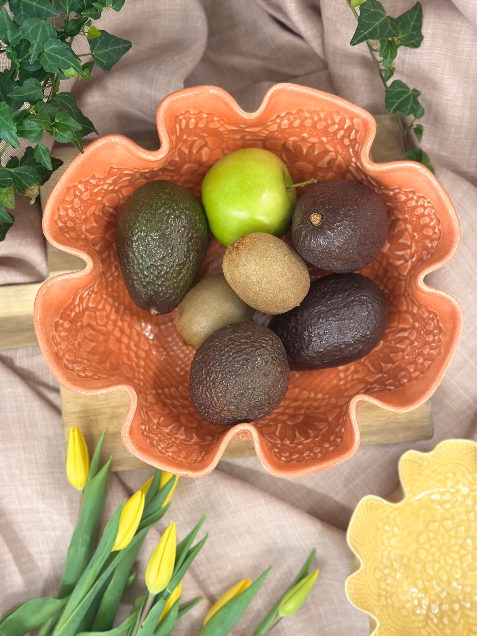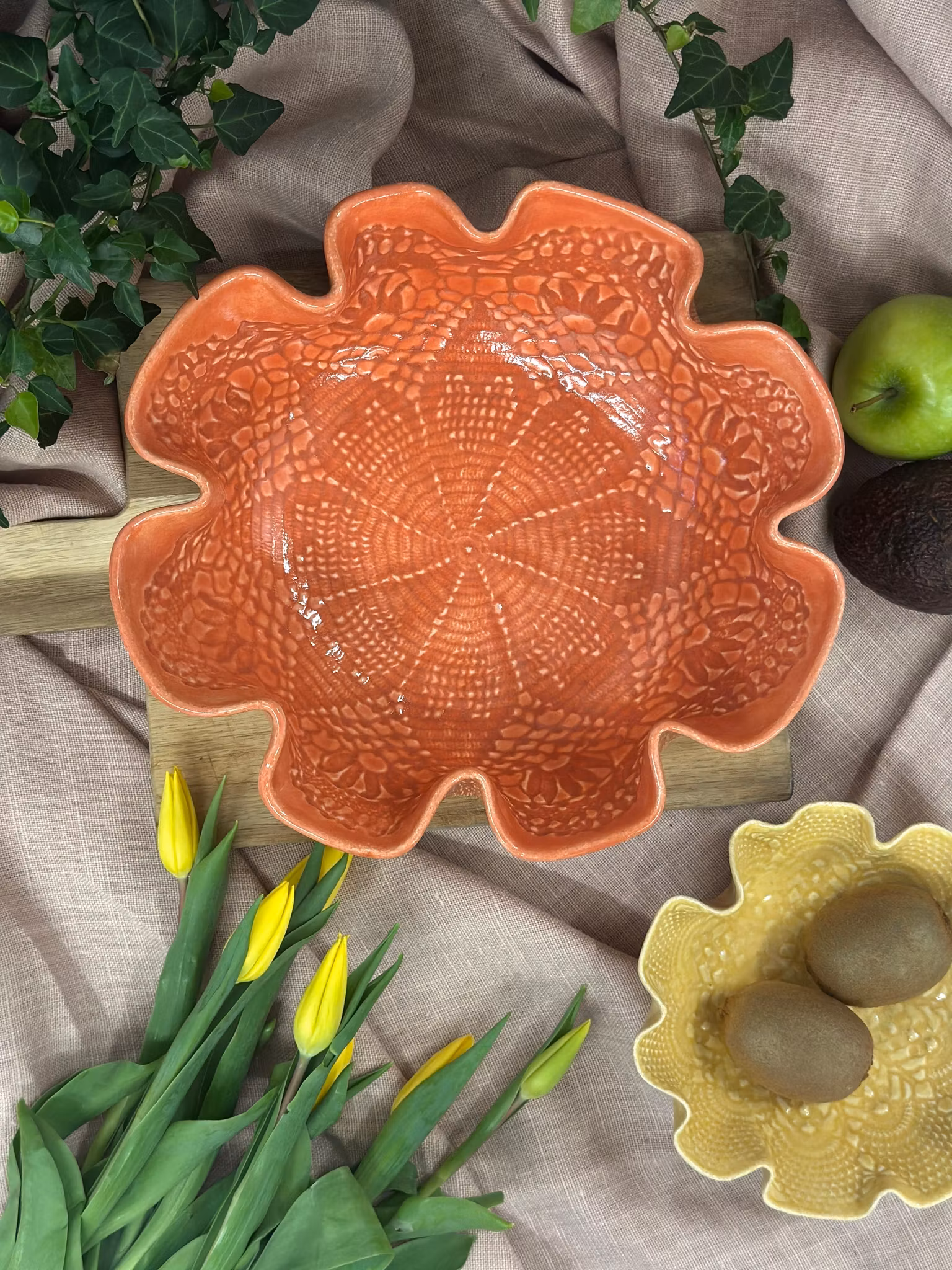 En nydelig sommerlig bolle med avtrykk av en hekleduk inni hvor du ser avslutningen og bølgende på duken. Derfor også den fine rene leirekanten øverst inni. Utenpå er det avtrykk fra en gammel gardin.
