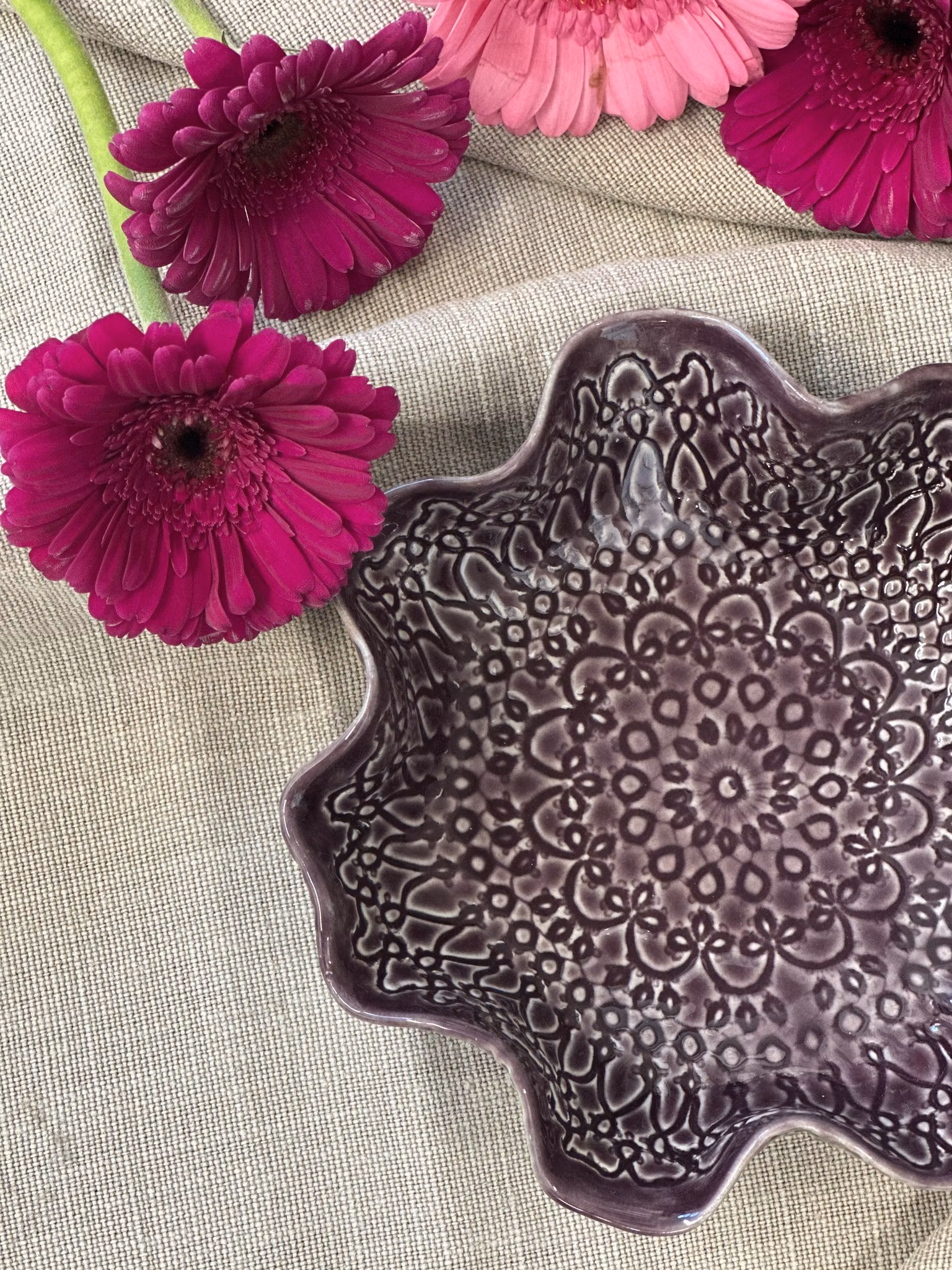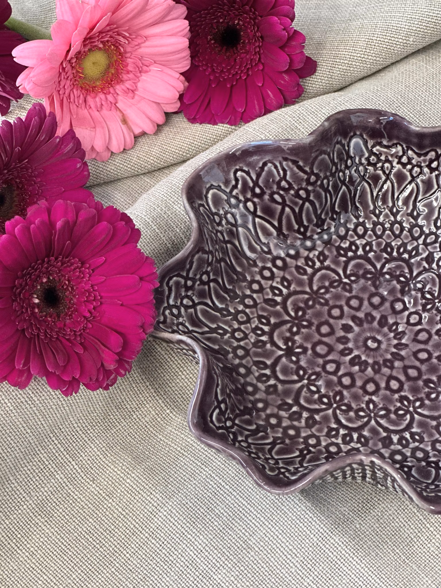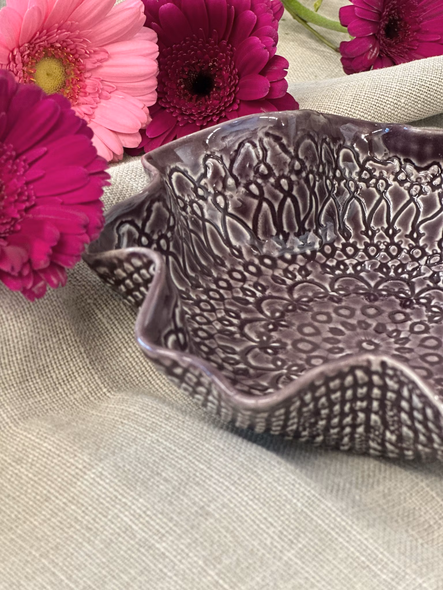 Liten skål med avtrykk fra hekleduk inni og utenpå. Nydelig til å bare stå på bordet, men perfekt til nøtter, sjokolade, salt, sauser eller dipper eller kanskje til smykkene dine på badet?