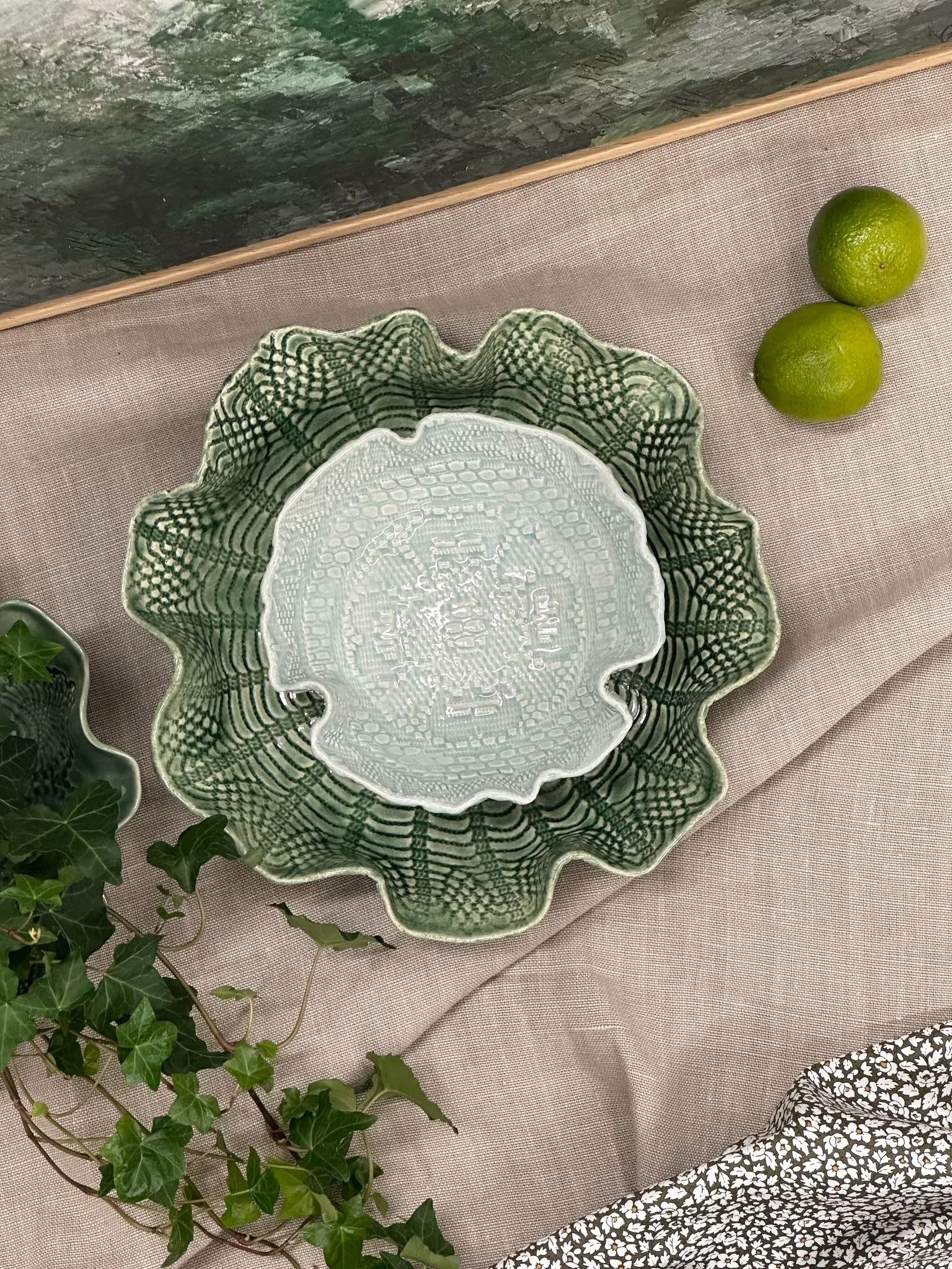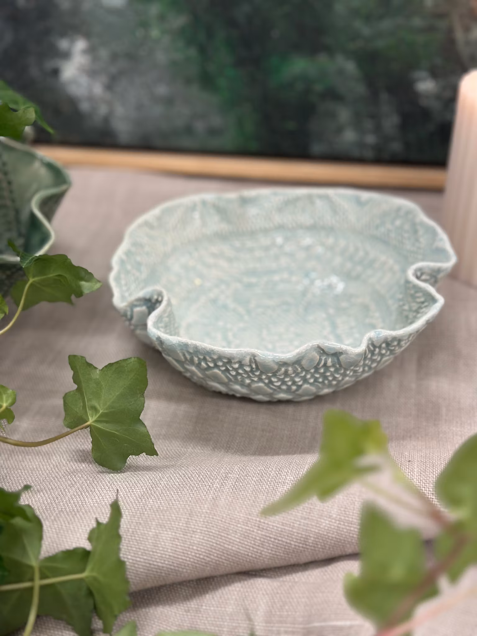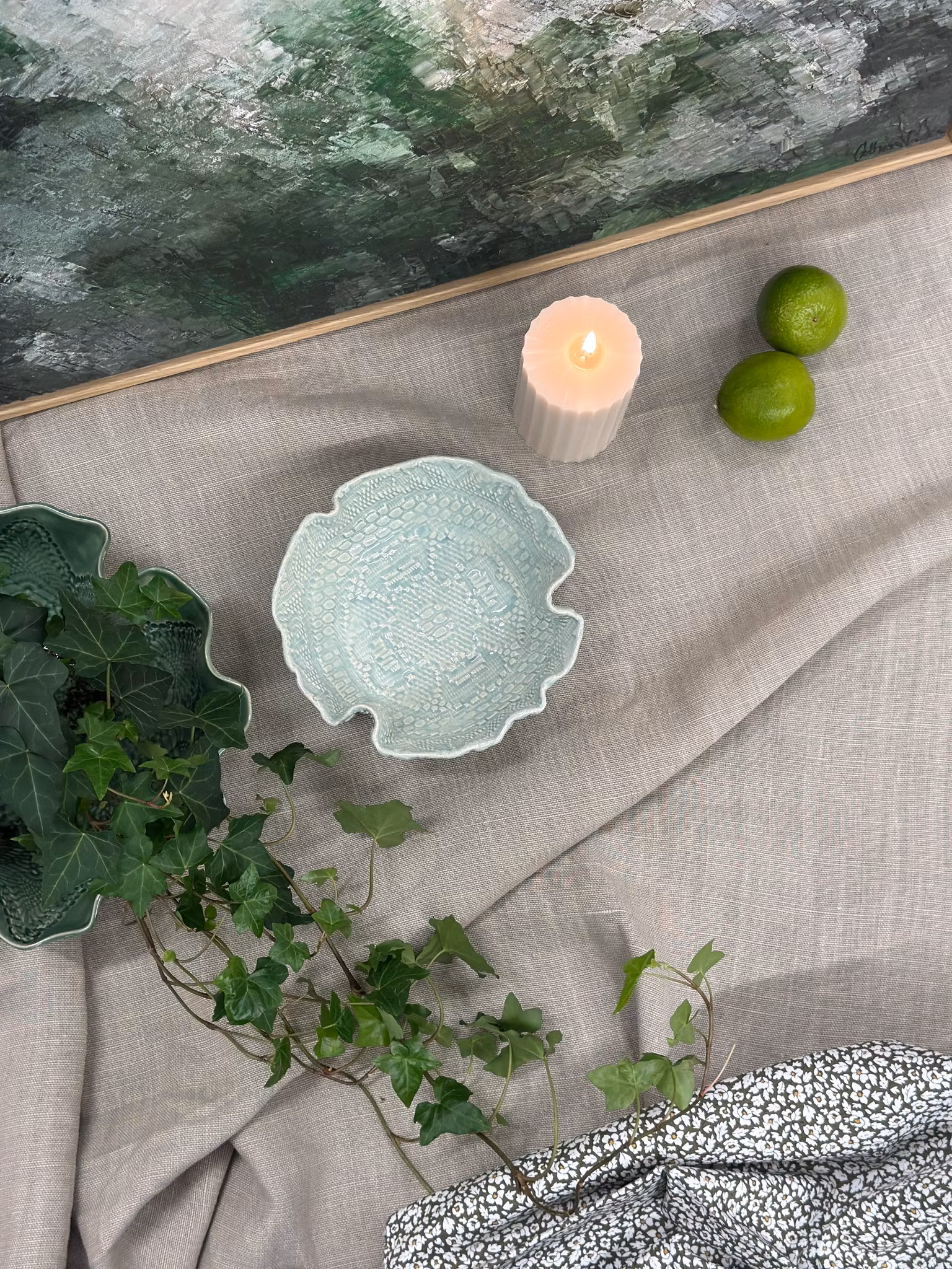 Liten skål med avtrykk av en ny duk med en sentrert blomst i midten. Utenpå mer struktur fra et sengeteppe.