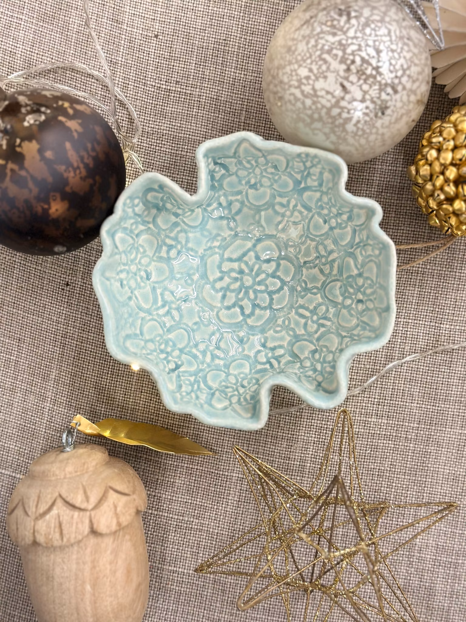 Liten skål med nydelig mønster med avtrykk av en liten heklet duk inni og en annen utenpå.