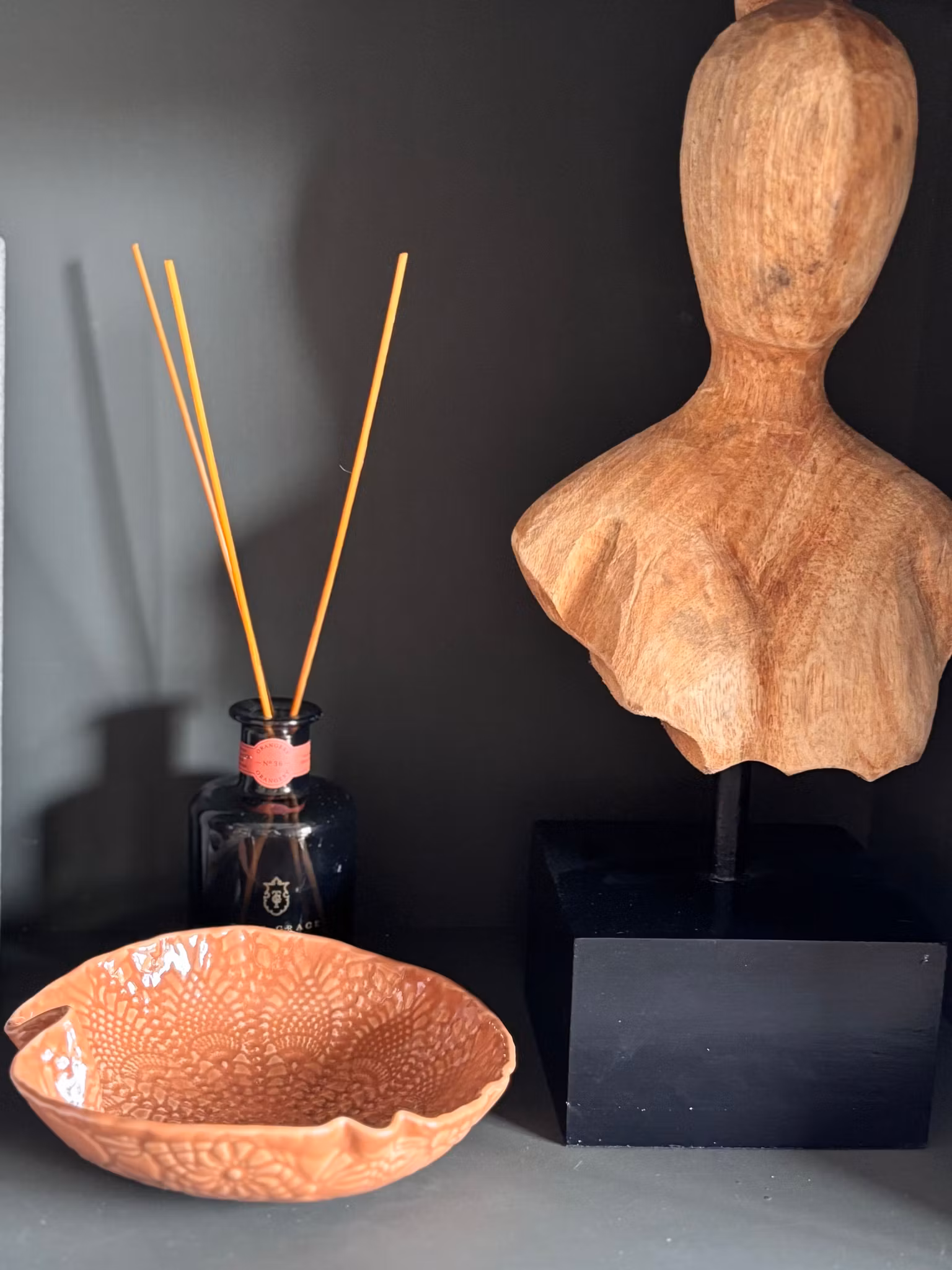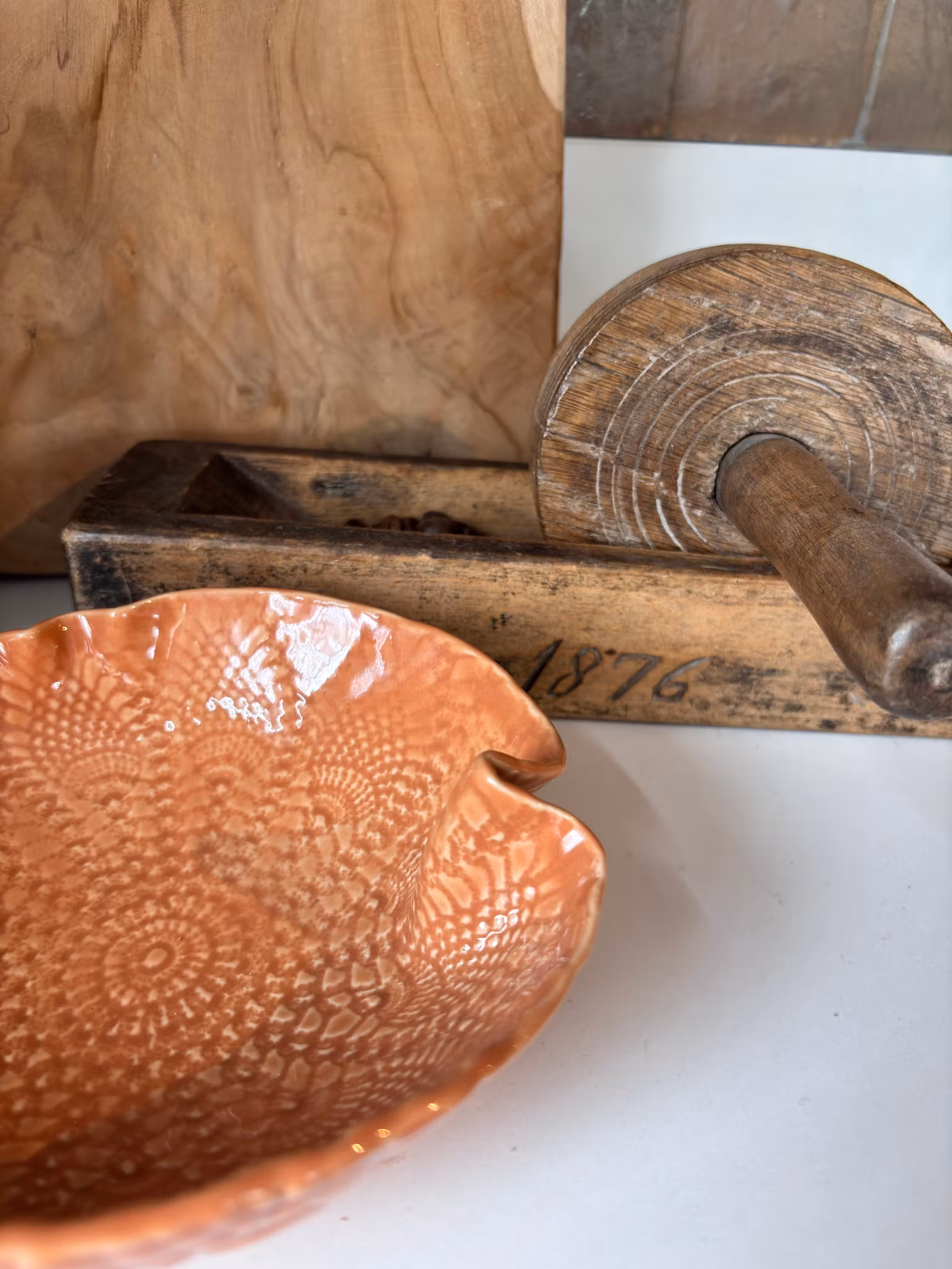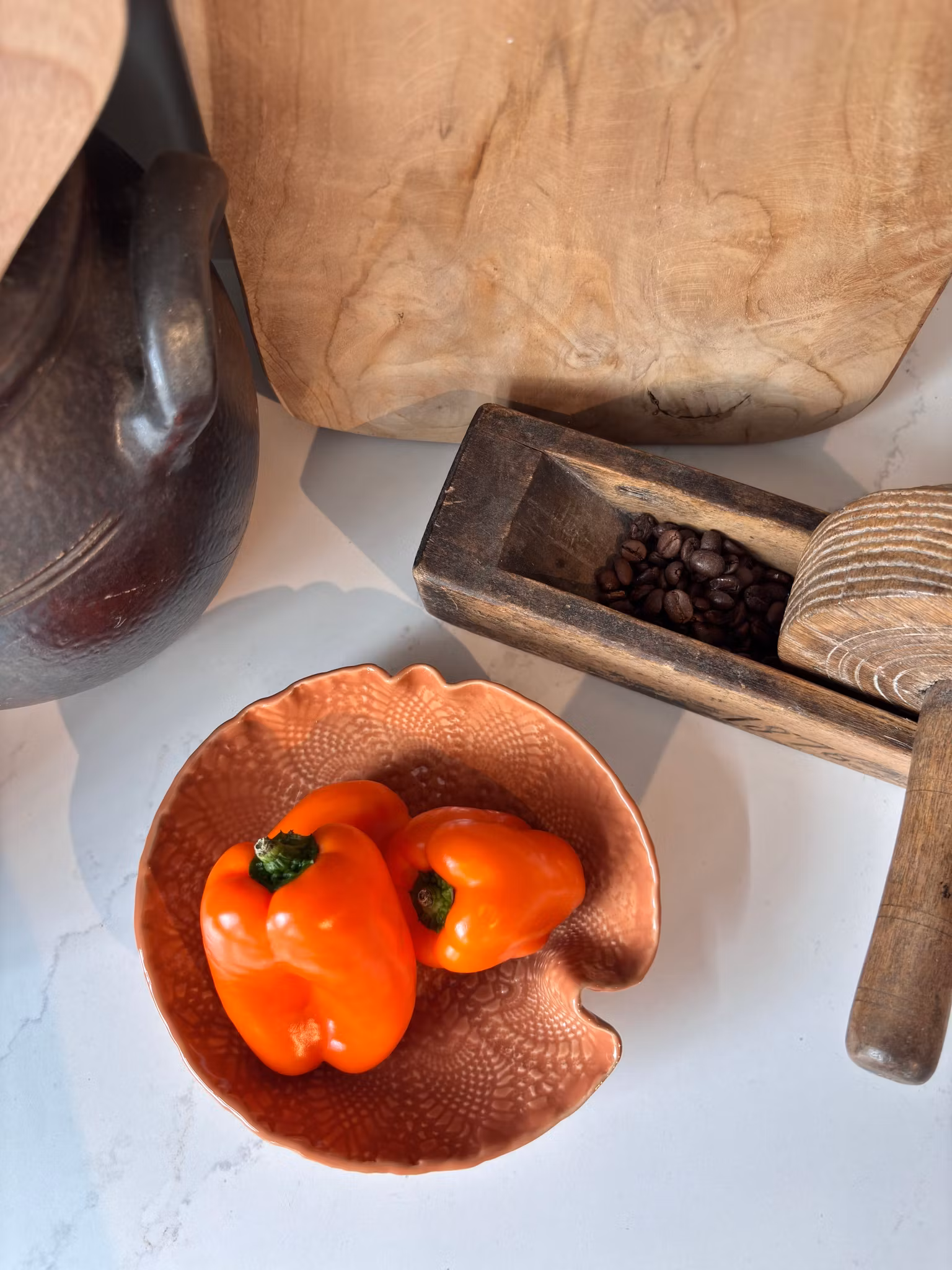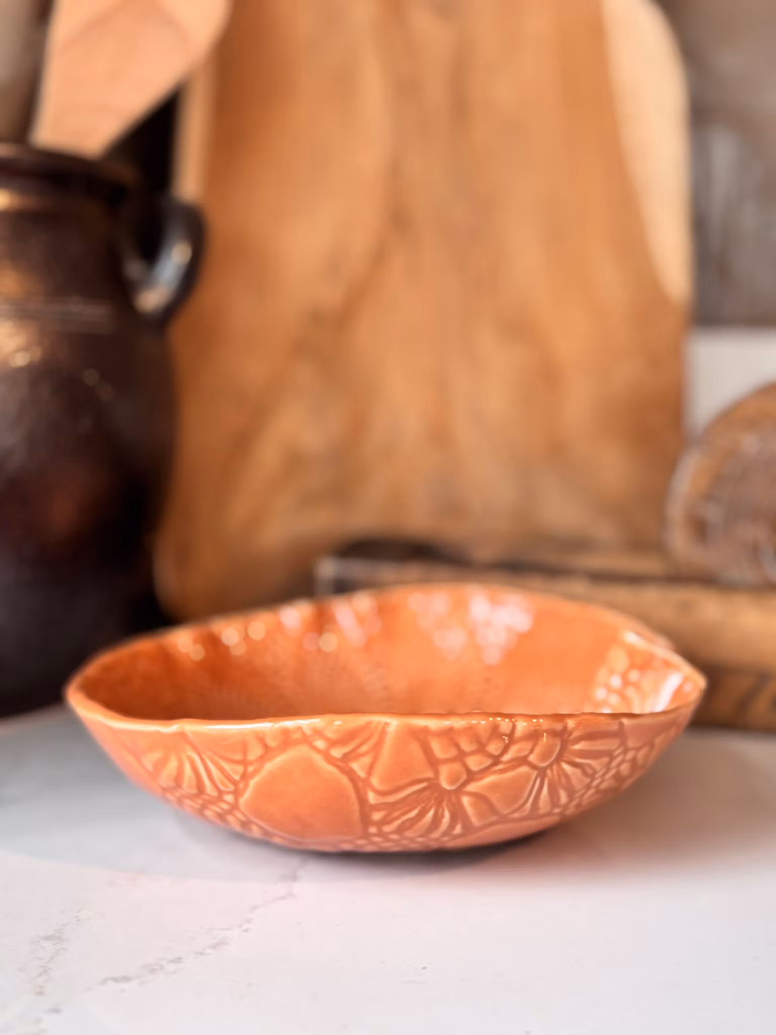 Nydelig liten brunoransje skål med avtrykk på innside og utside. Passer til servering av fingermat, snacks eller til smykker på nattbordet.