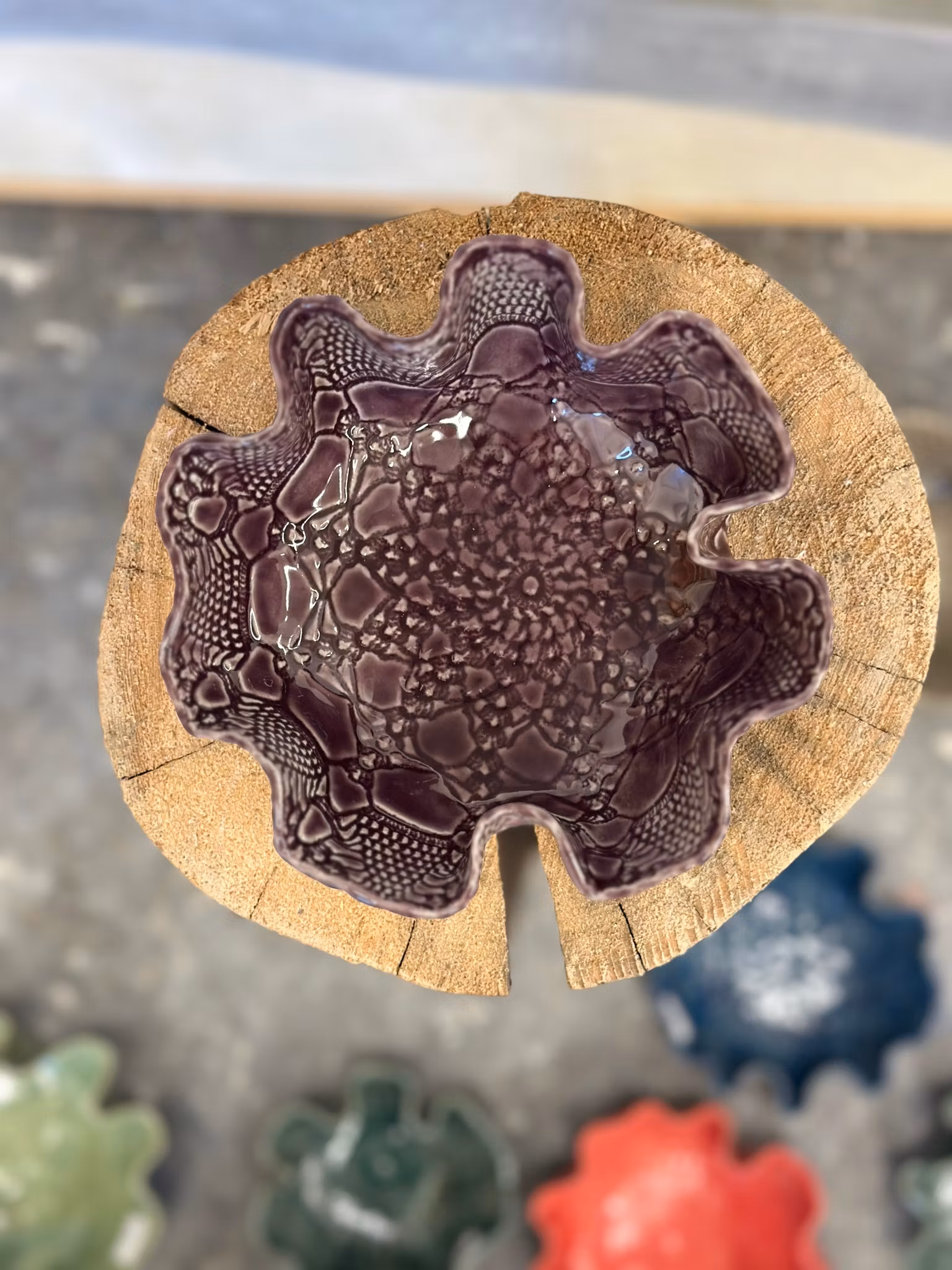 Liten skål med nydelig mønster  med avtrykk av en liten heklet duk inni og en annen utenpå. . Så fin som den er eller fyll med noe å kose deg med.