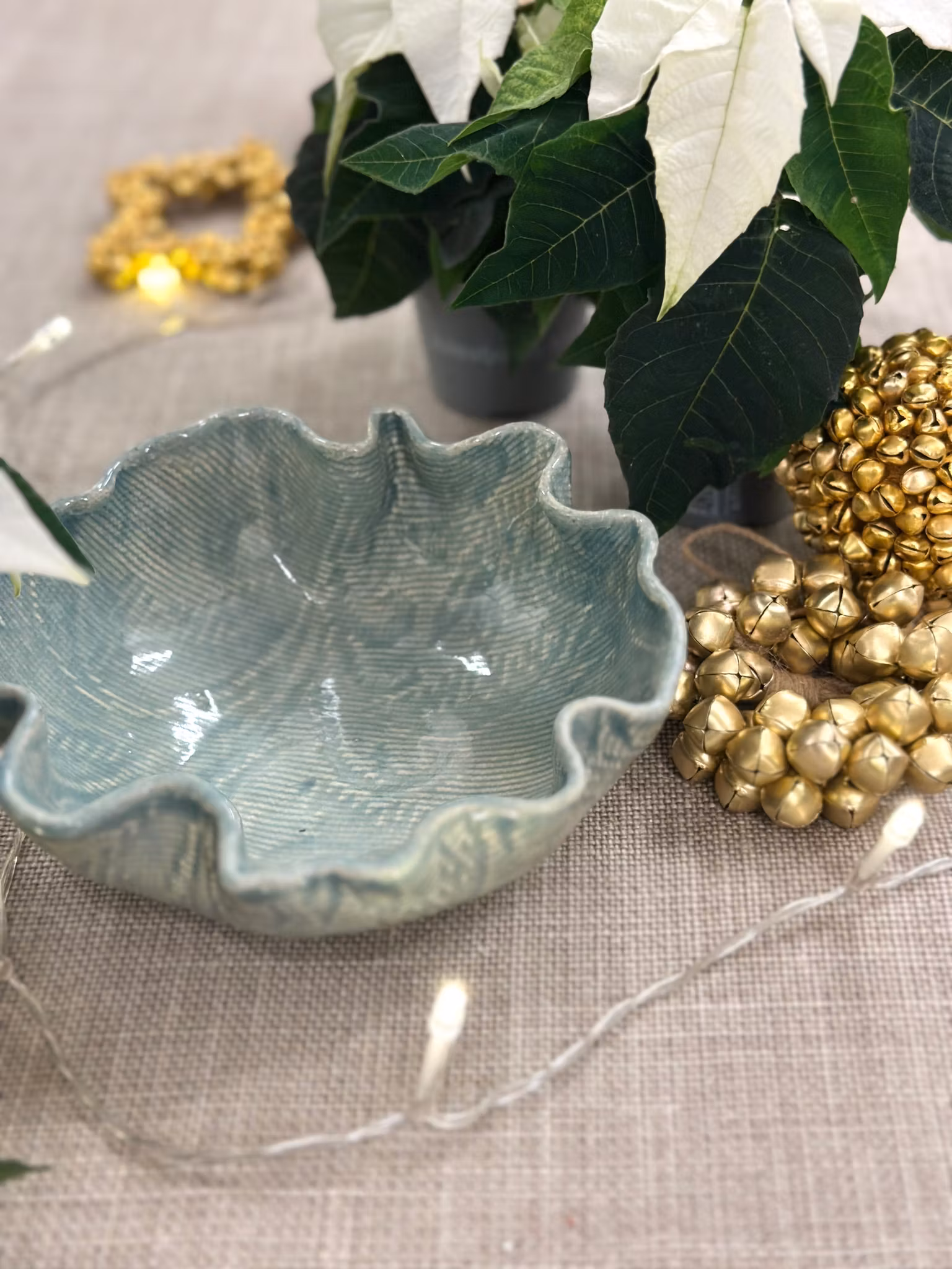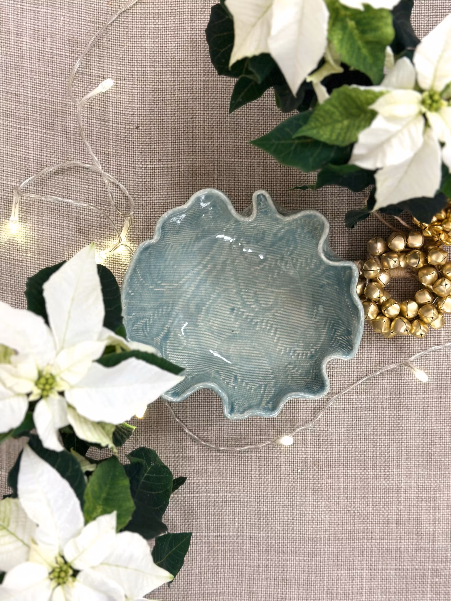 Liten skål med nydelig mønster med avtrykk av en liten heklet duk inni og en annen utenpå.