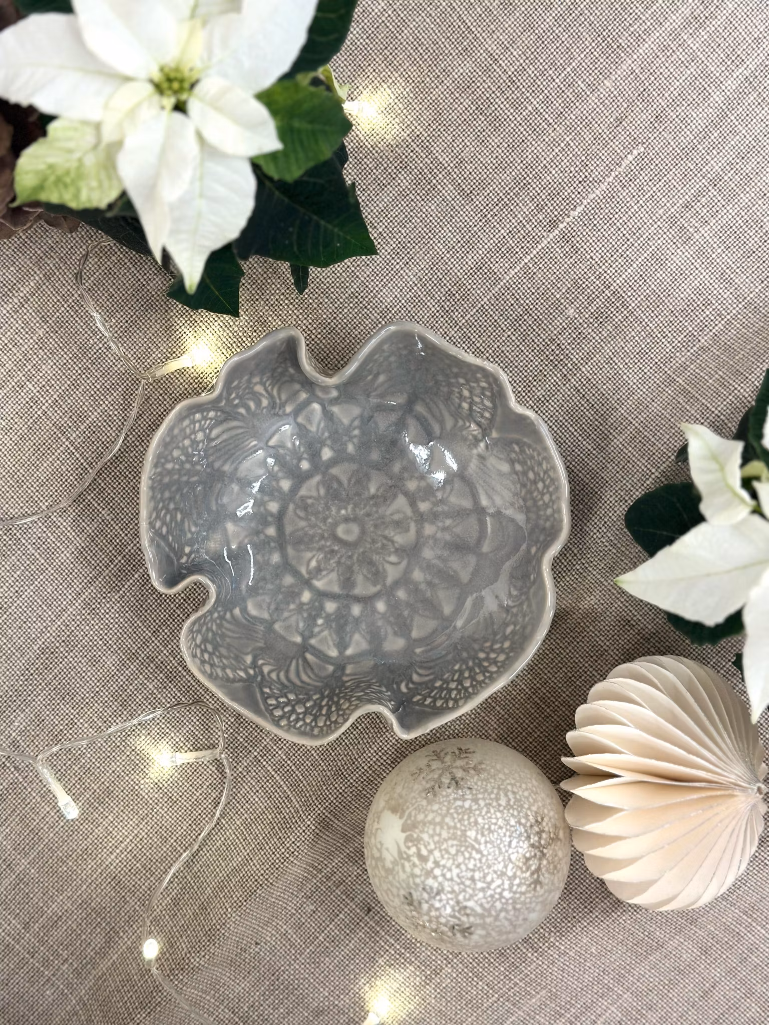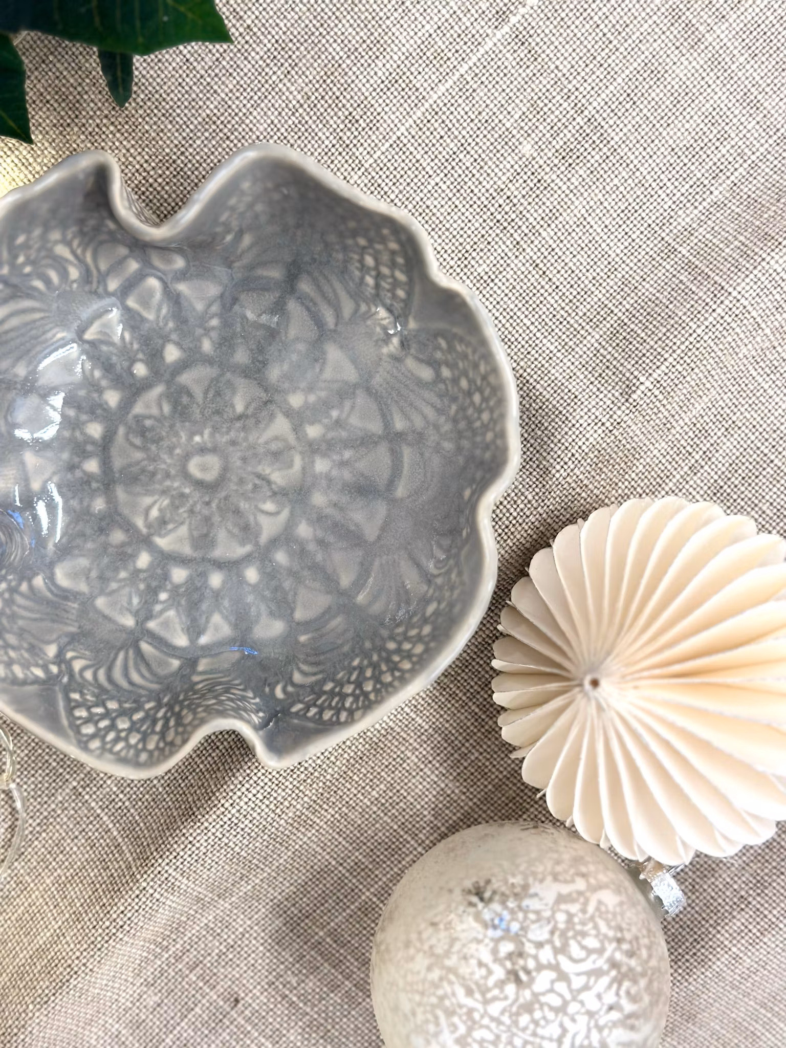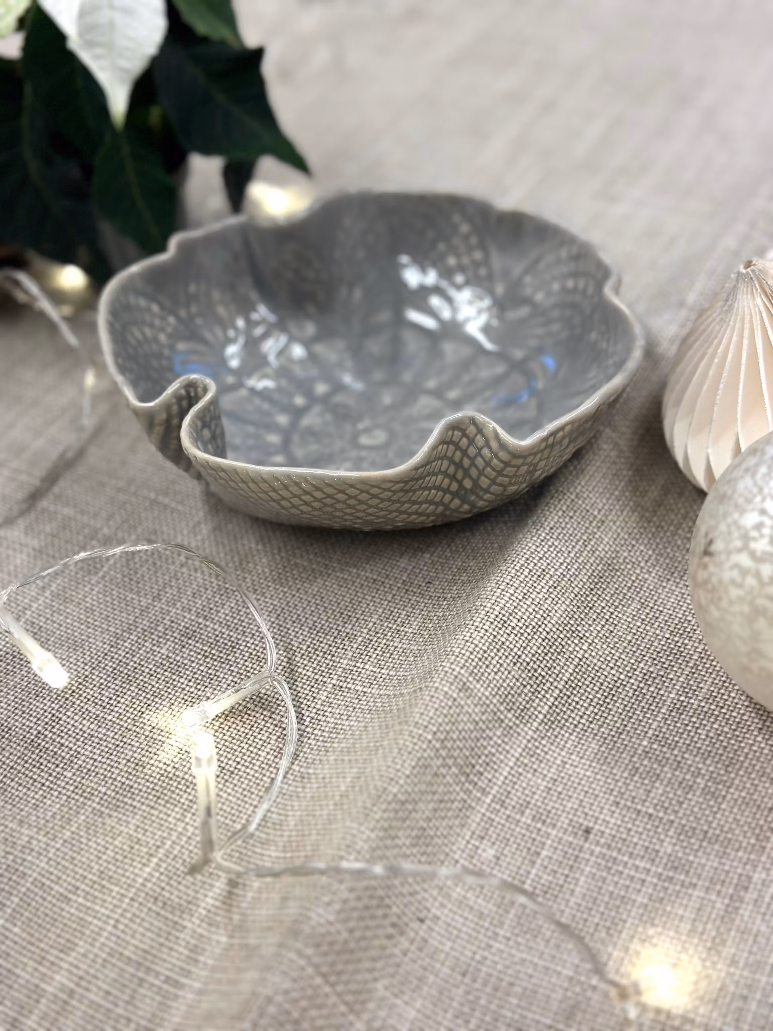 Liten skål med nydelig mønster med avtrykk av en liten heklet duk inni og en annen utenpå.