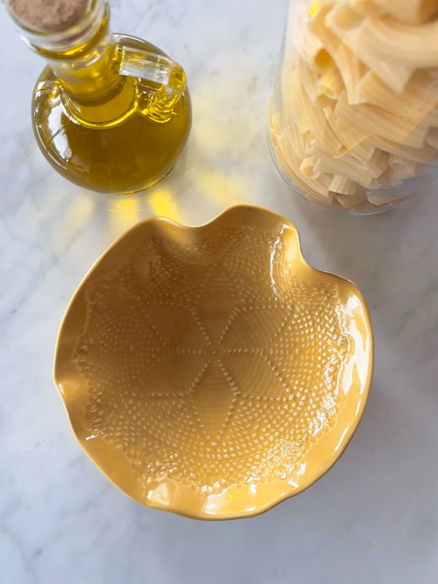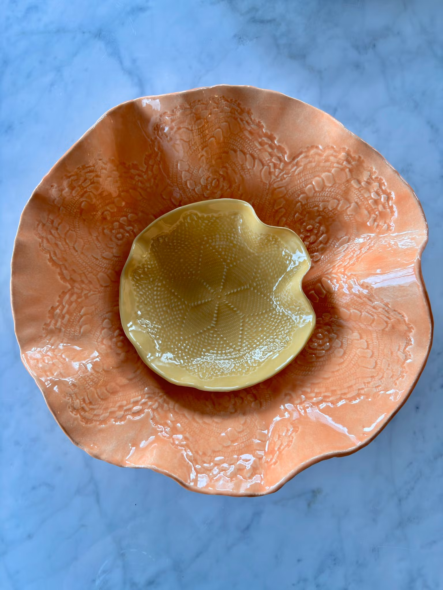 Søt liten skål i sterk gul farge med vakkert avtrykk av duk. Fin sommerfarge. Perfekt til pynt, smykker og til servering.