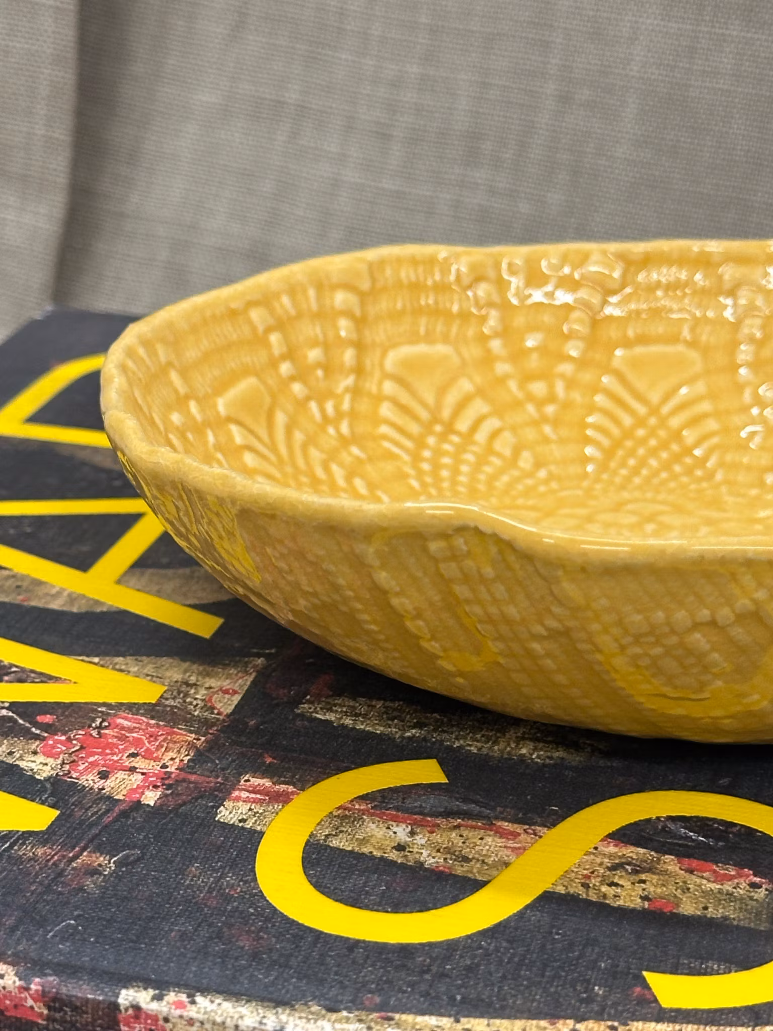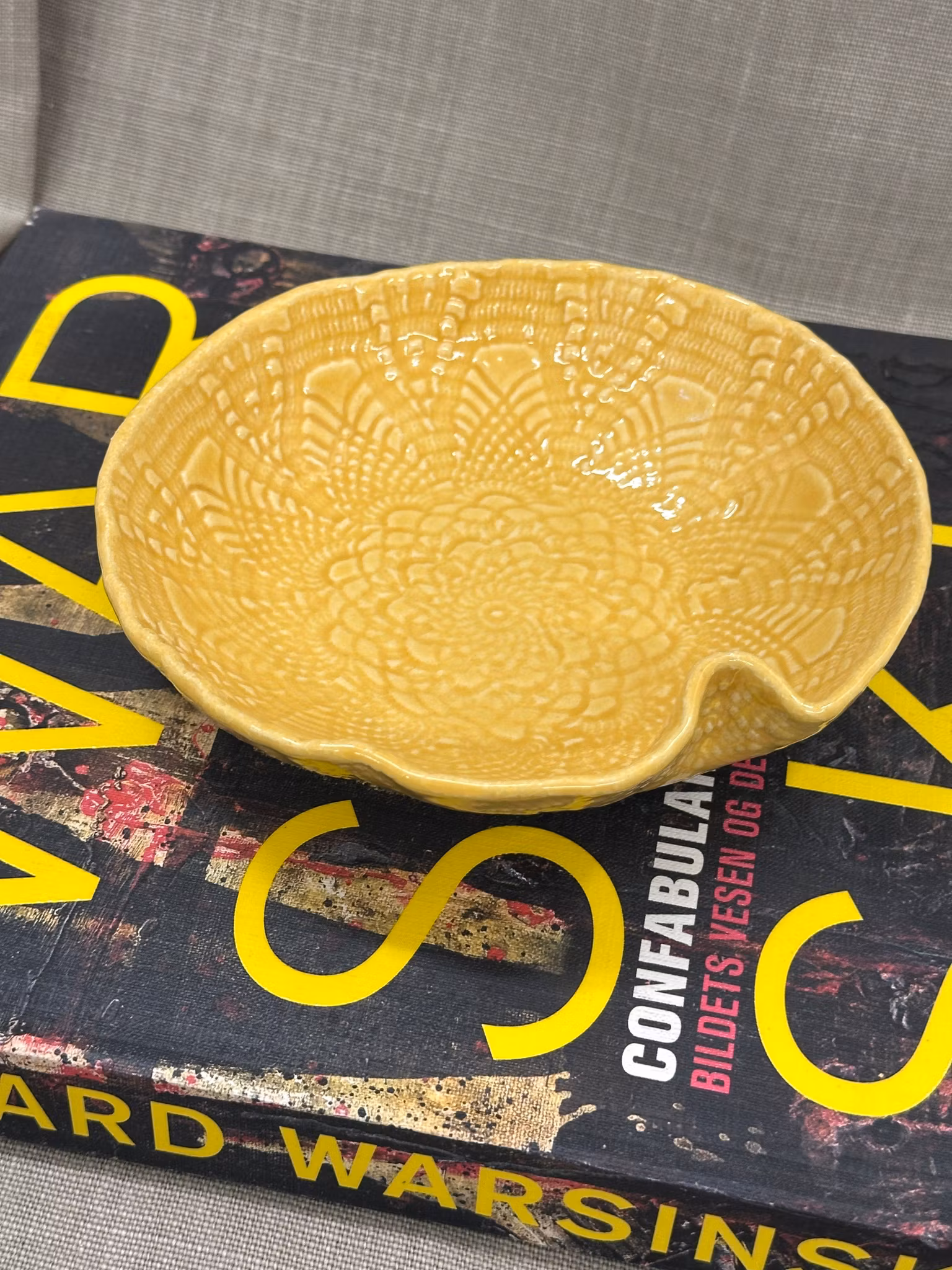 En liten skål med mønster fra en liten duk inni og et mønster fra en gardin på utsiden.