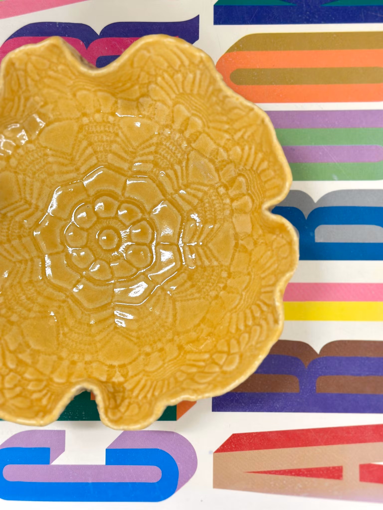 En liten skål med mønster fra en liten duk inni og en annen liten heklet duk utenpå.