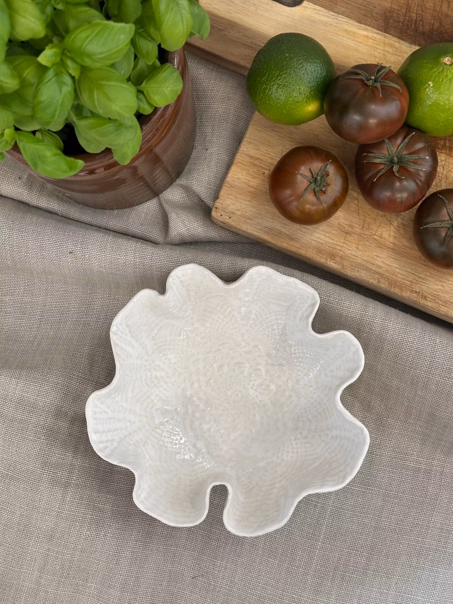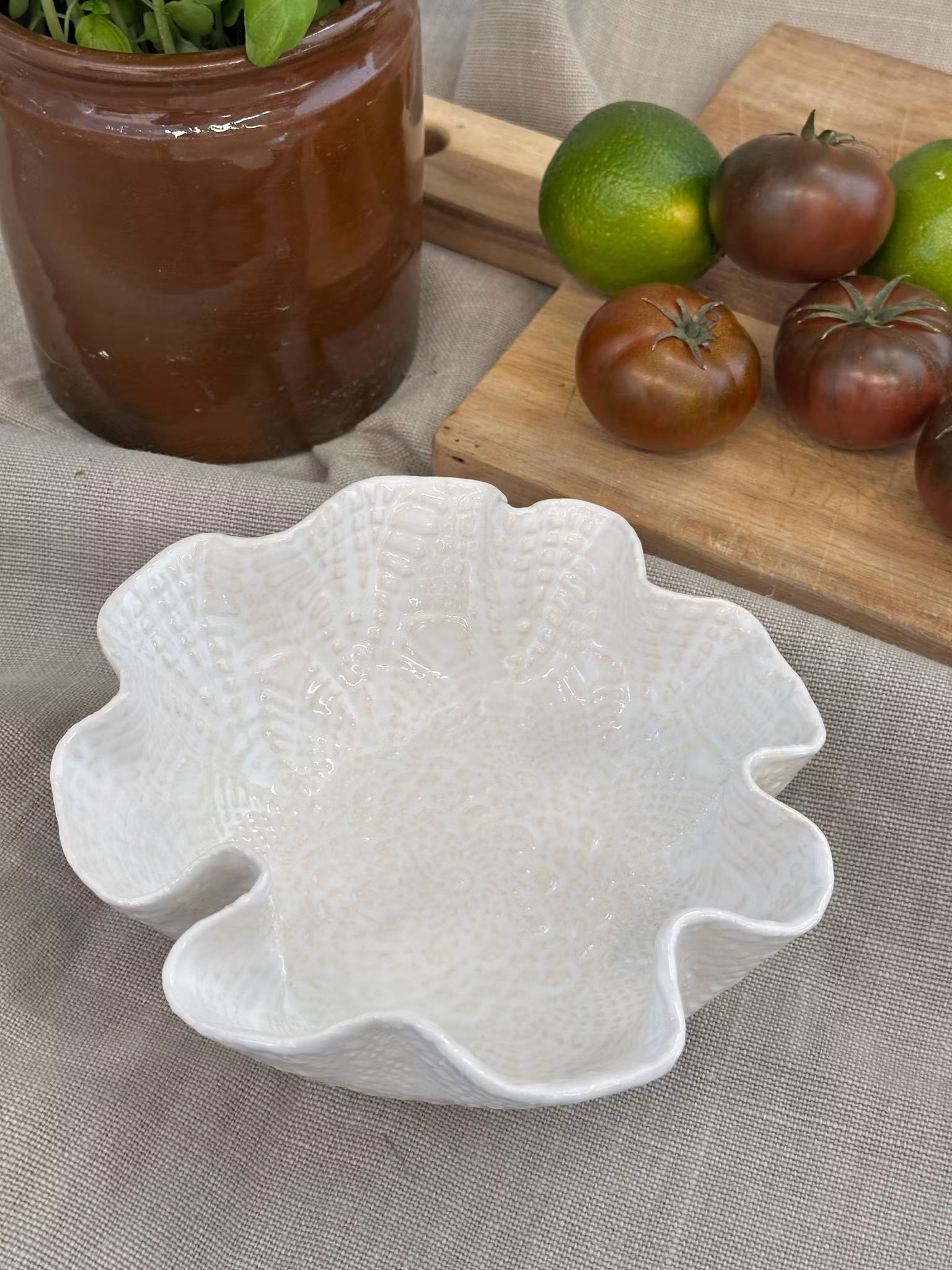 Liten skål med avtrykk fra hekleduk inni og utenpå. Nydelig til å bare stå på bordet, men perfekt til nøtter, sjokolade, salt, sauser eller dipper eller kanskje til smykkene dine på badet?