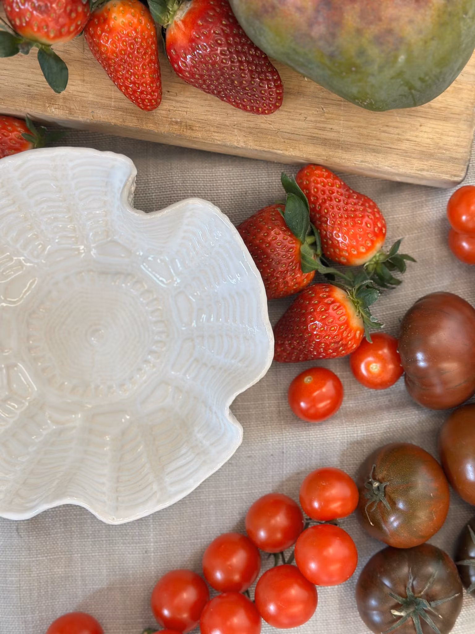 Liten skål med avtrykk fra hekleduk inni og utenpå. Nydelig til å bare stå på bordet, men perfekt til nøtter, sjokolade, salt, sauser eller dipper eller kanskje til smykkene dine på badet?