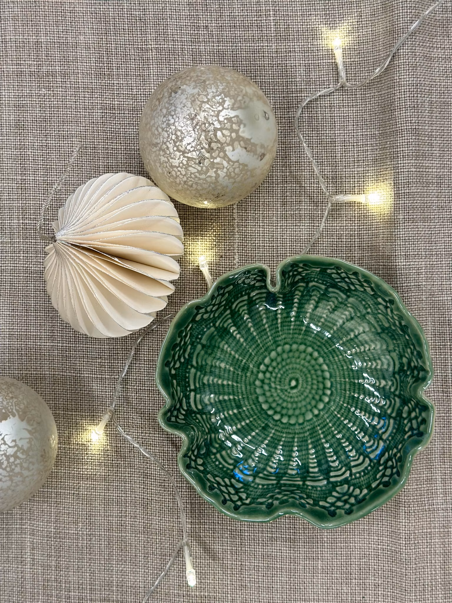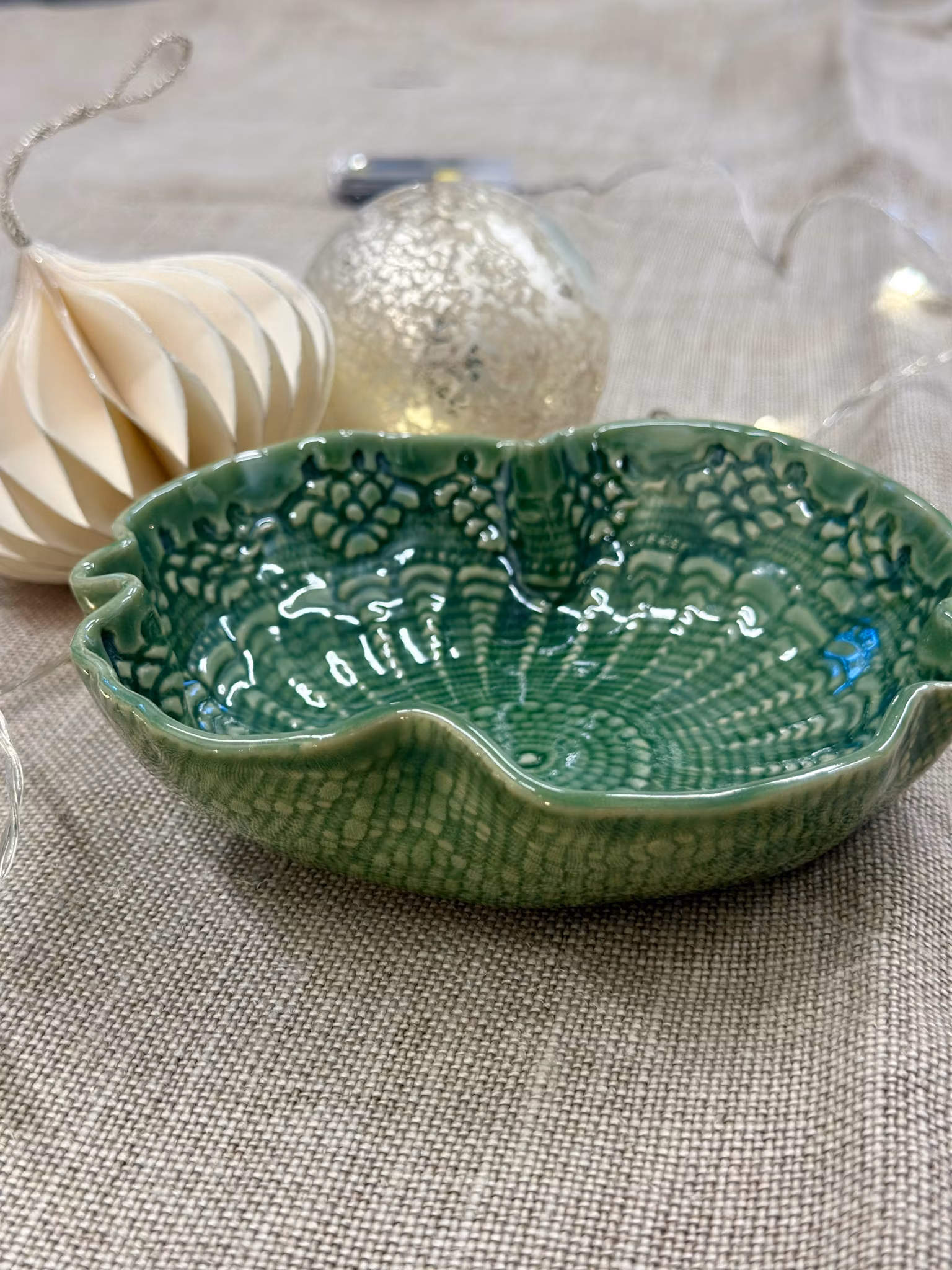 Liten skål med nydelig mønster med avtrykk av en liten heklet duk inni og en annen utenpå.