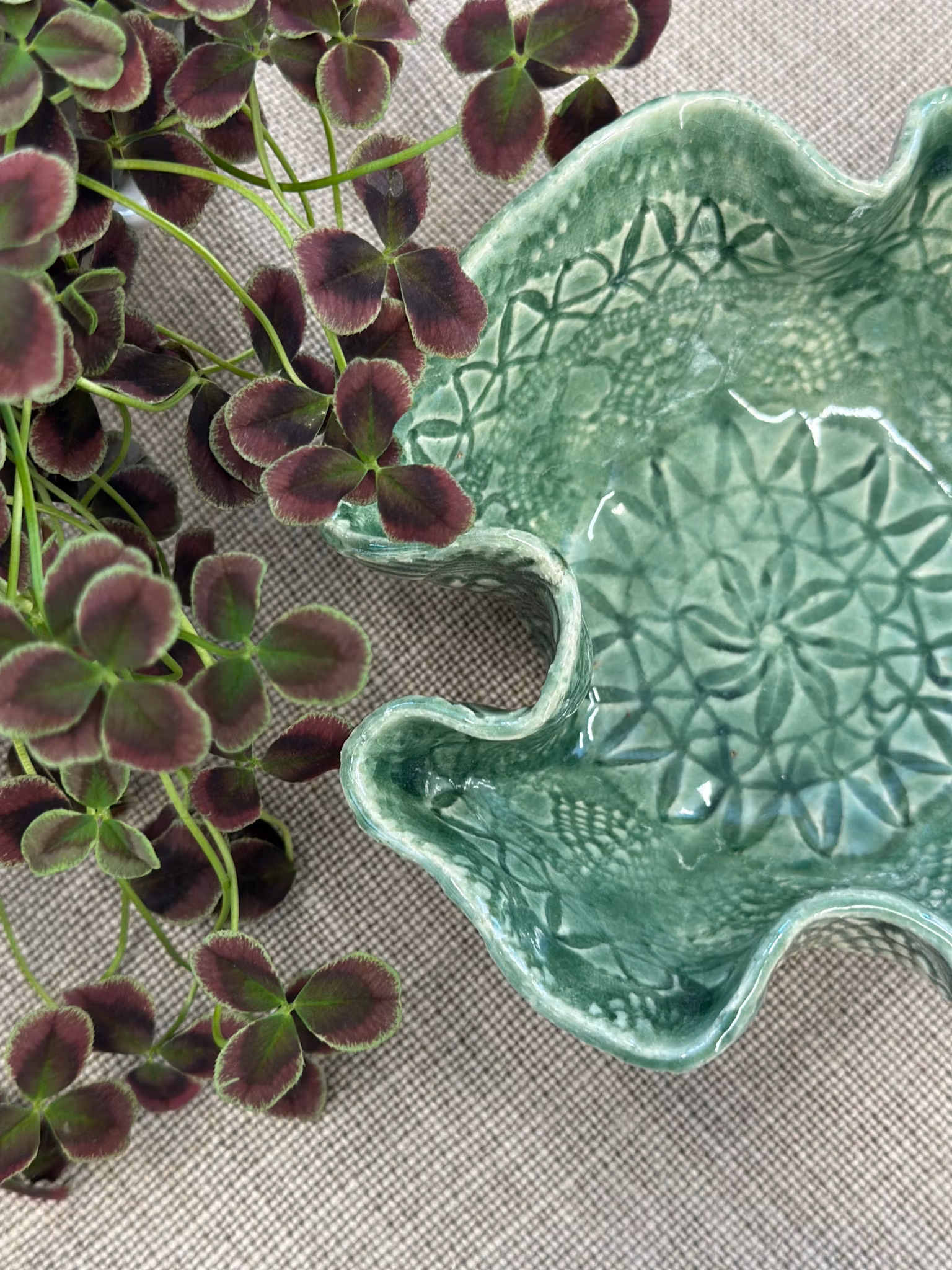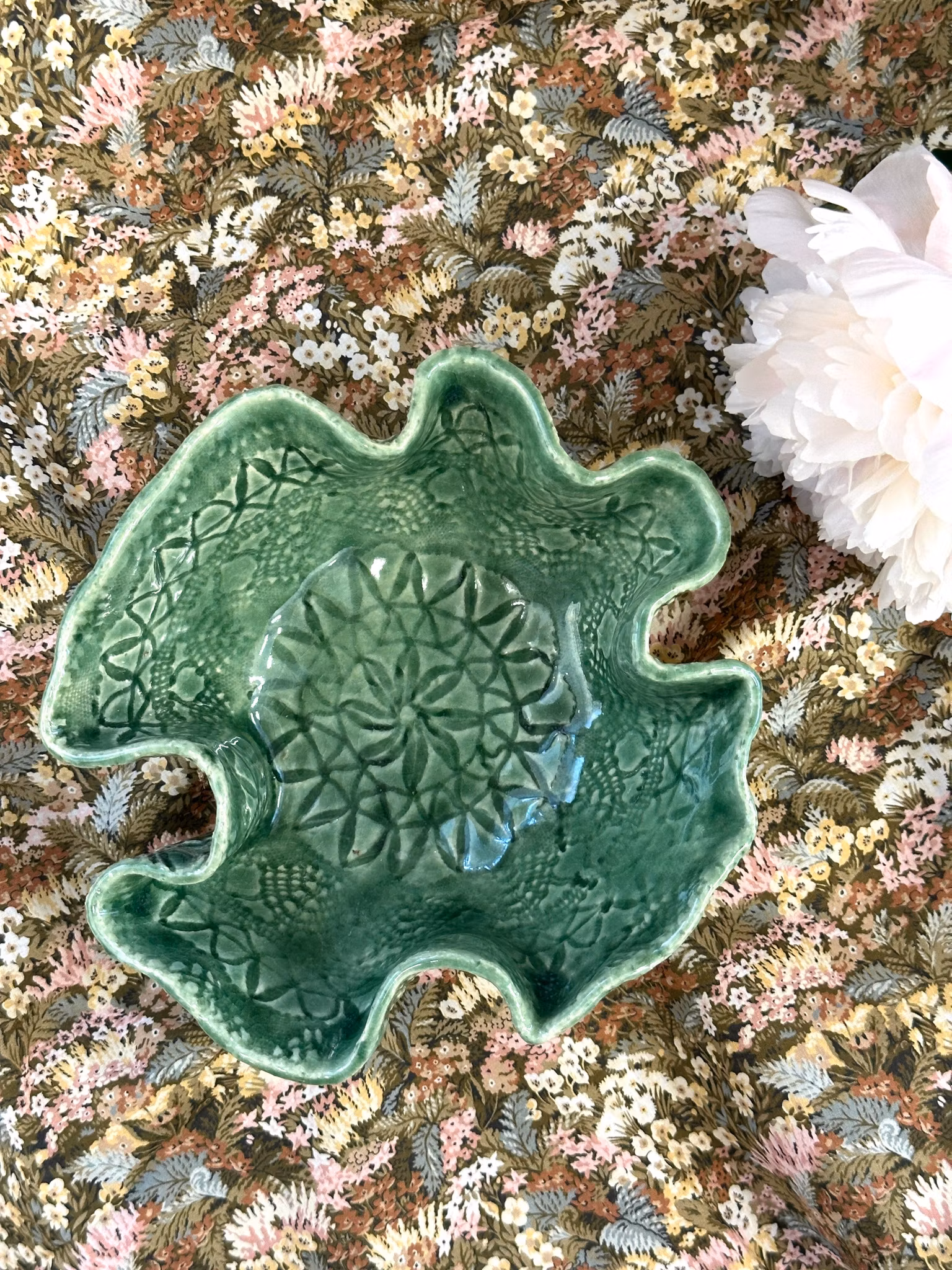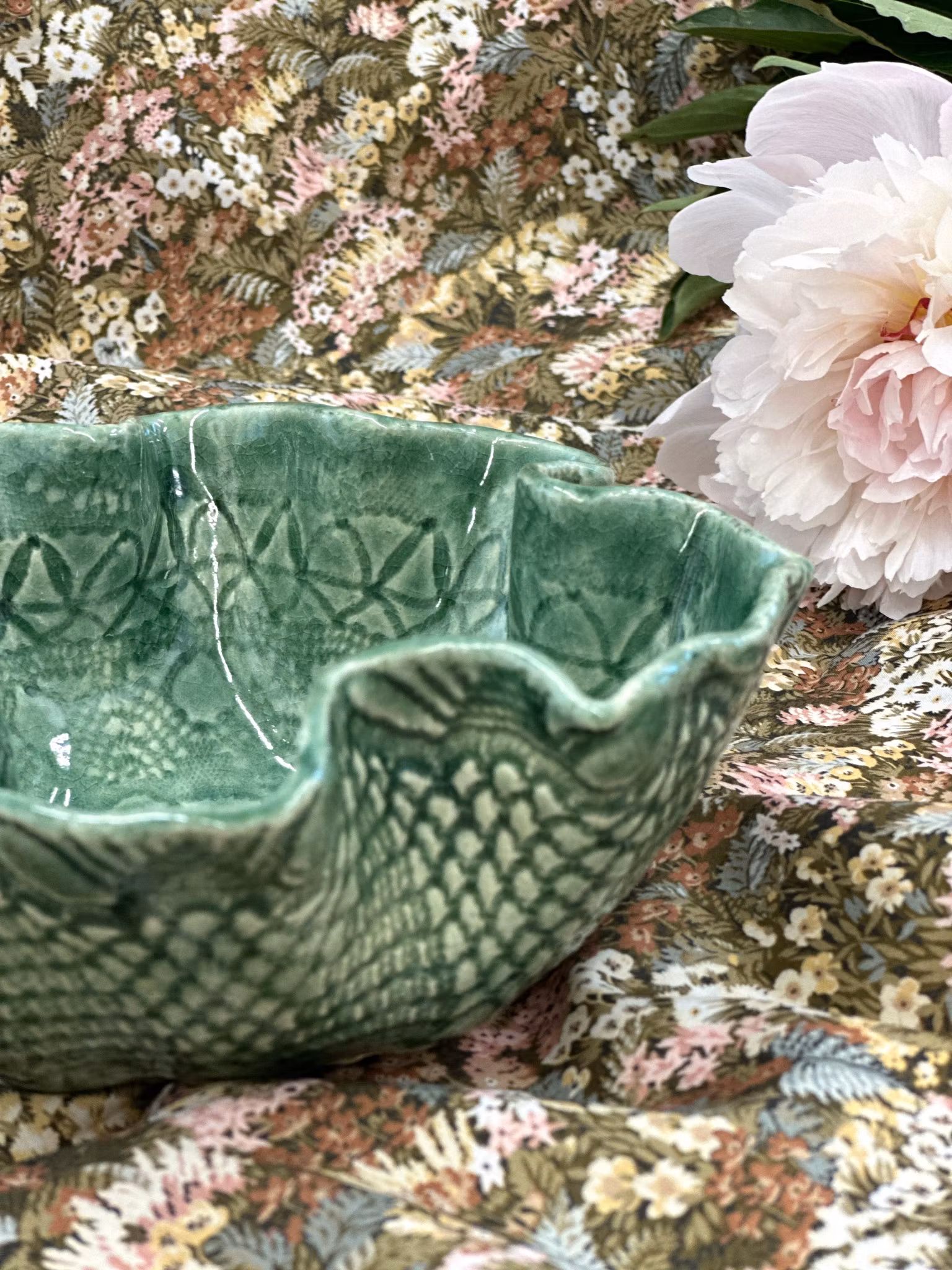 Liten skål med høy kant med sentrert mønster inni av en liten heklet gammel duk. Mønster også utenpå.