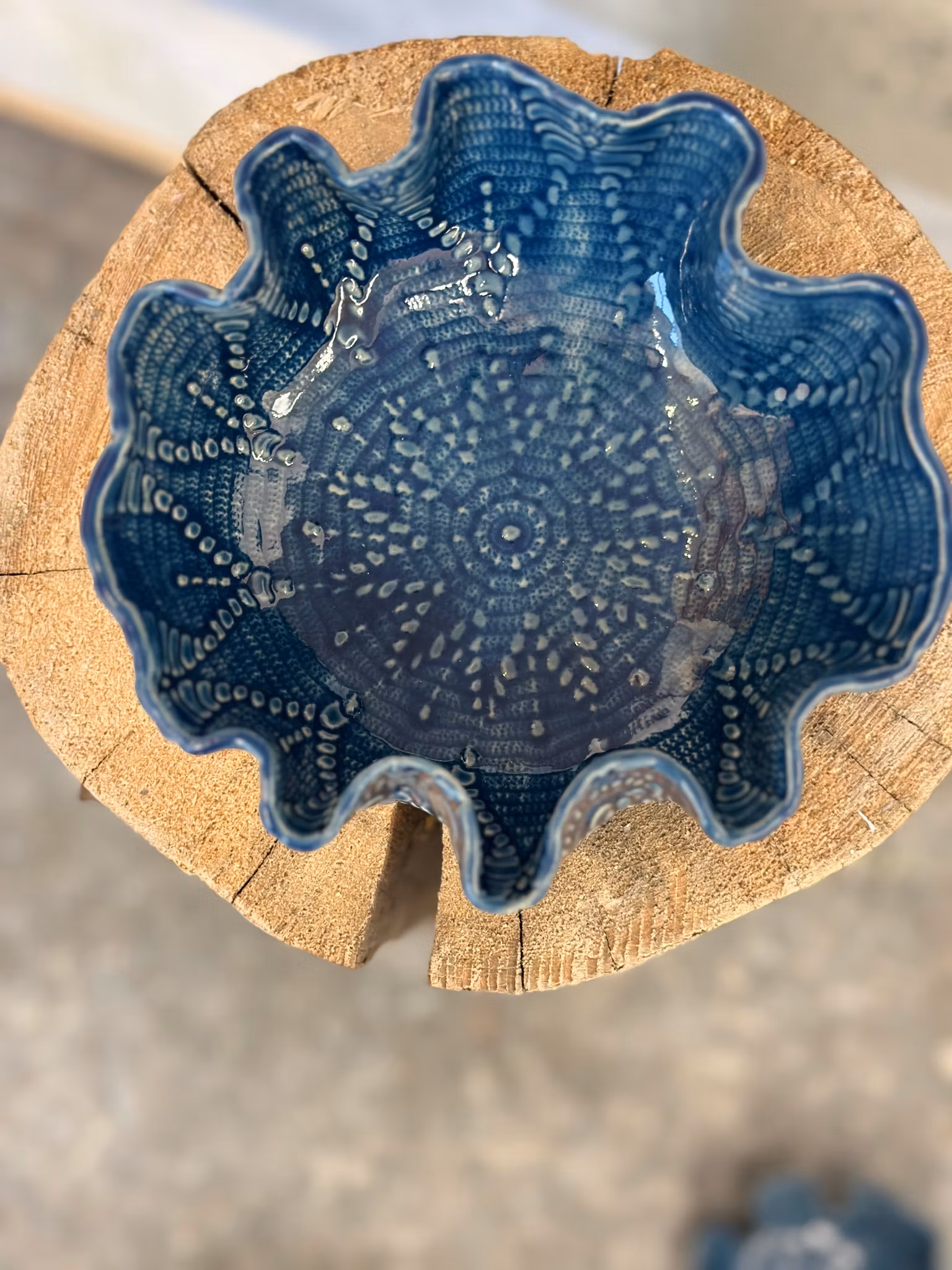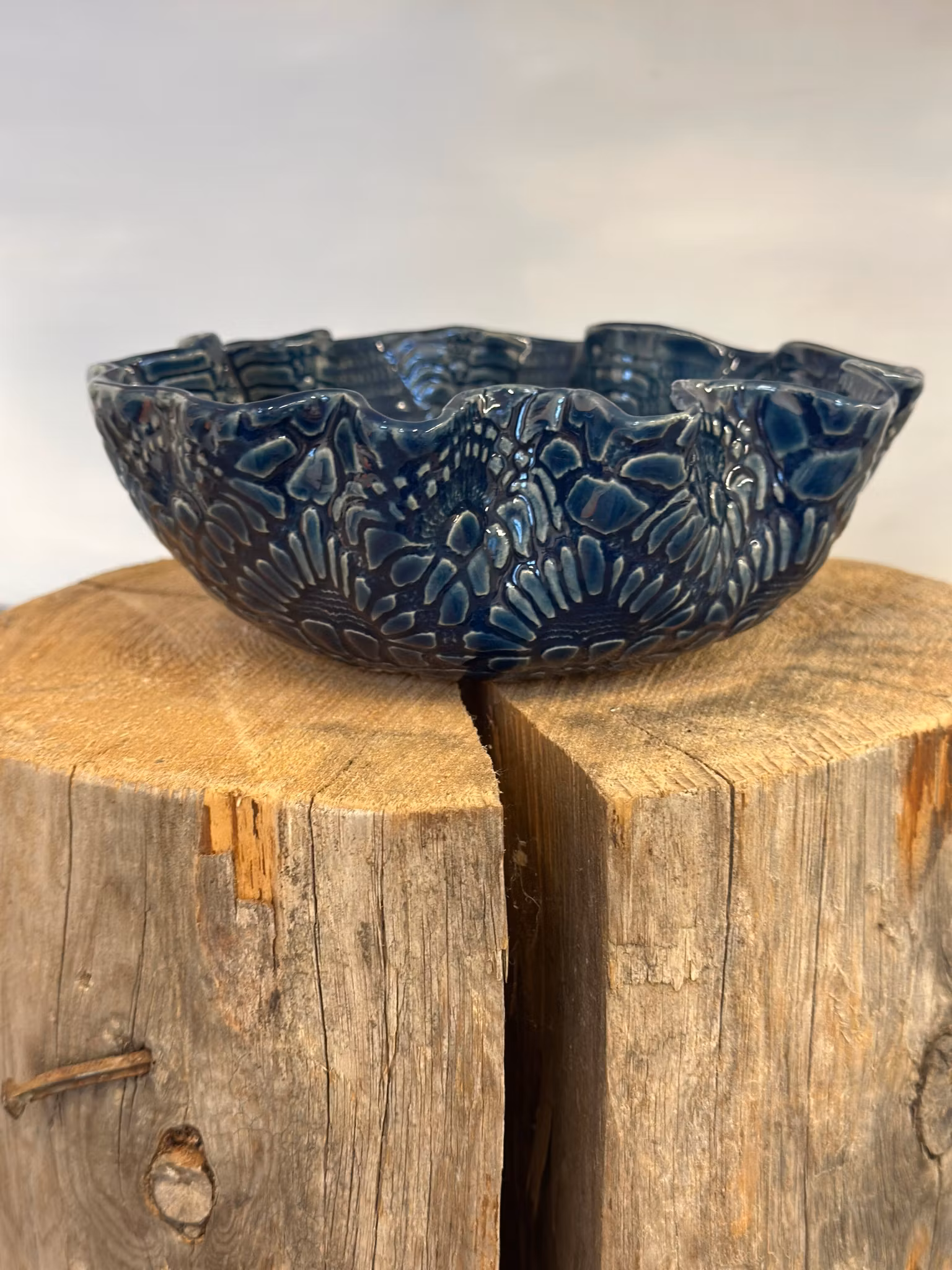 Liten skål med nydelig mønster med avtrykk av en liten heklet duk inni og en annen utenpå. . Så fin som den er eller fyll med noe å kose deg med.