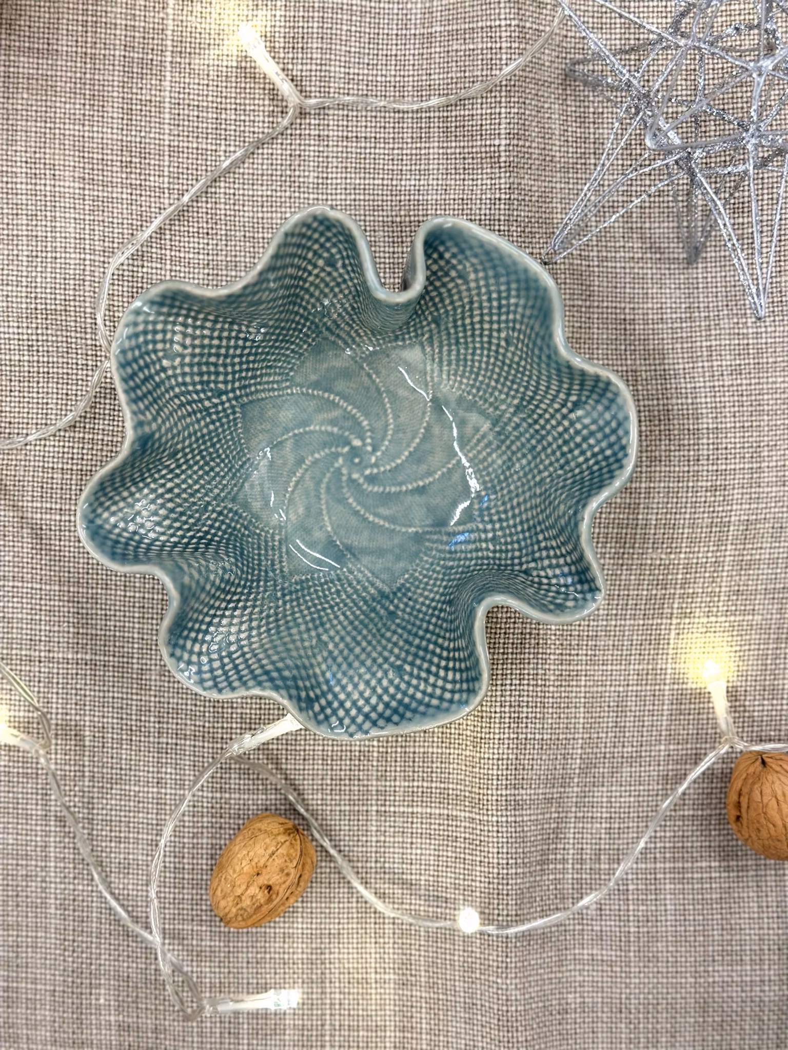 Liten skål med nydelig mønster med avtrykk av en liten heklet duk inni og en annen utenpå.