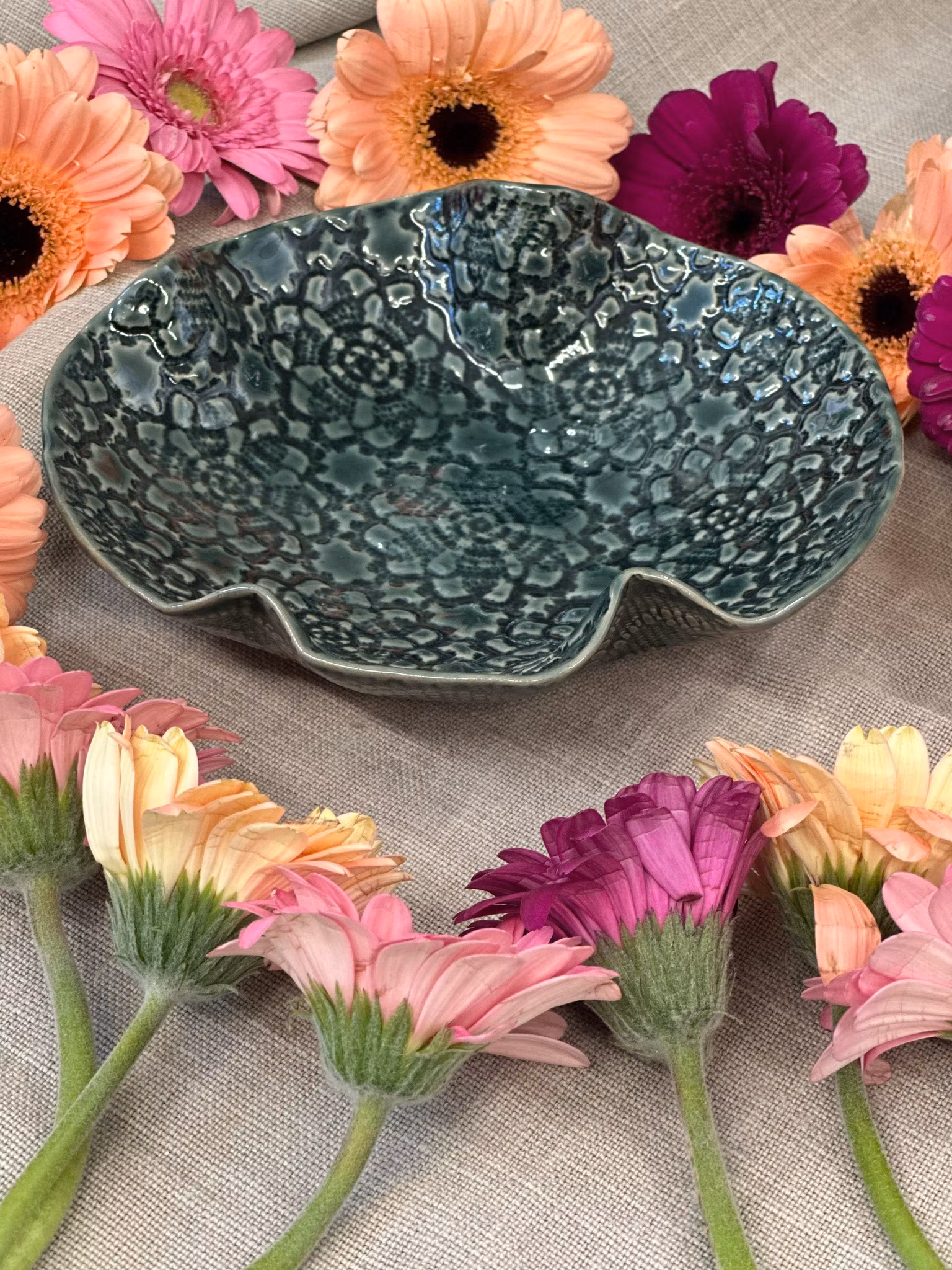 Liten skål med avtrykk fra hekleduk inni og utenpå. Nydelig til å bare stå på bordet, men perfekt til nøtter, sjokolade, salt, sauser eller dipper eller kanskje til smykkene dine på badet?