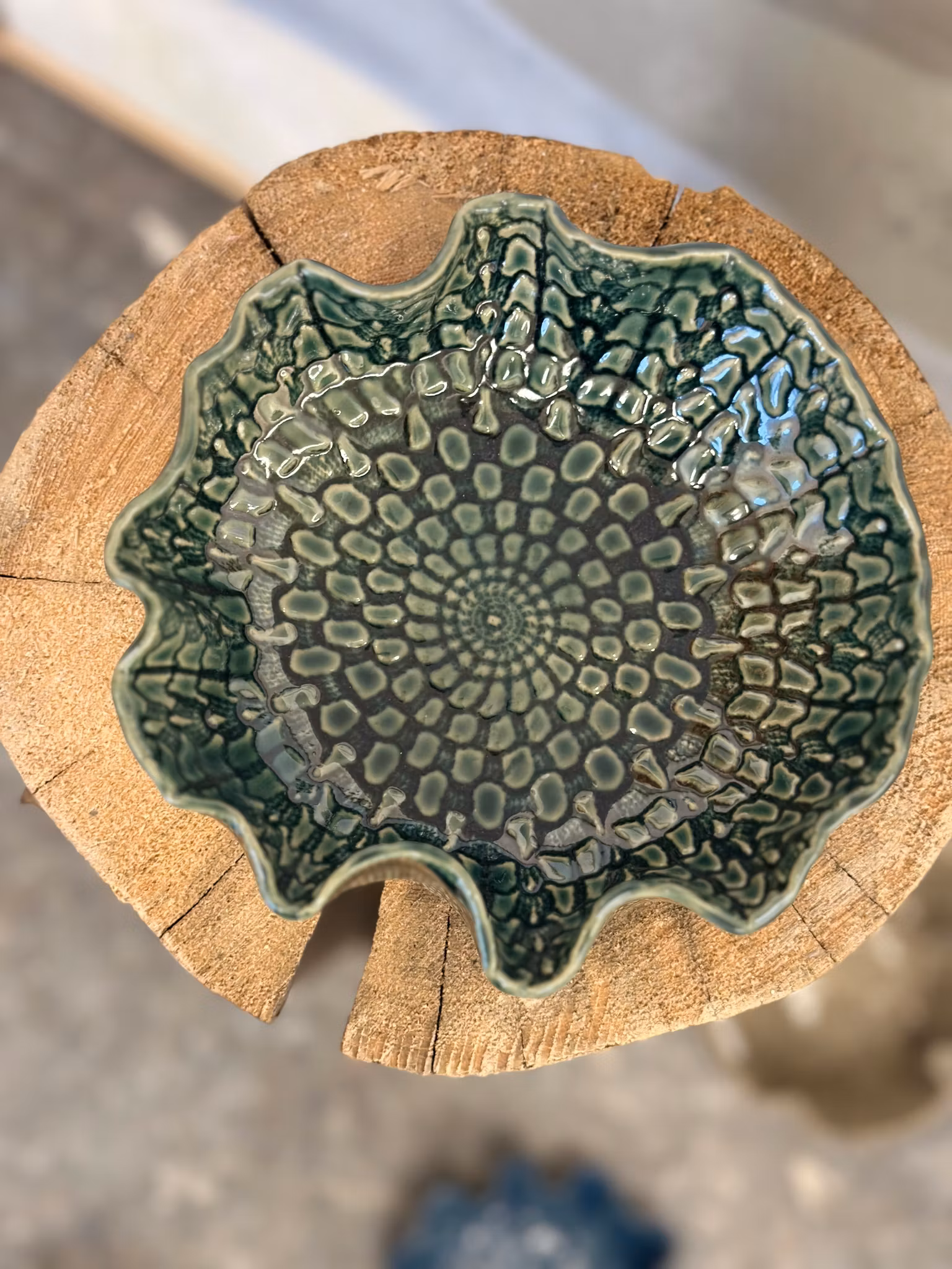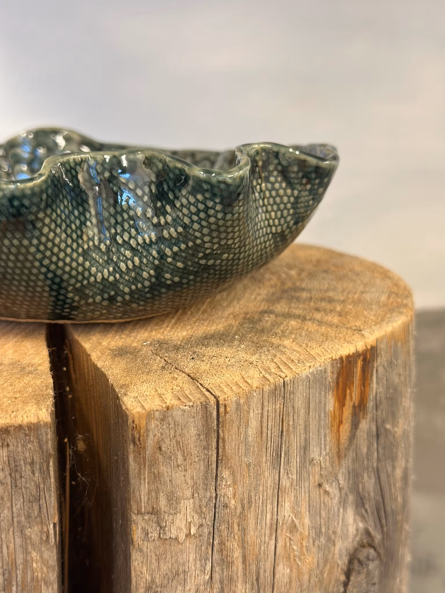 Liten skål med nydelig mønster med avtrykk av en liten heklet duk inni og en annen utenpå. . Så fin som den er eller fyll med noe å kose deg med.