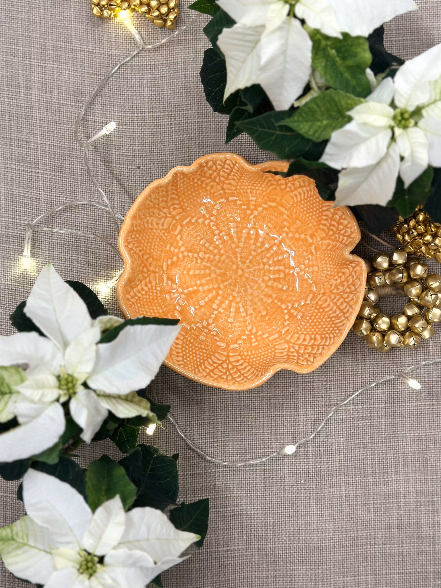 Liten skål med nydelig mønster med avtrykk av en liten heklet duk inni og en annen utenpå.