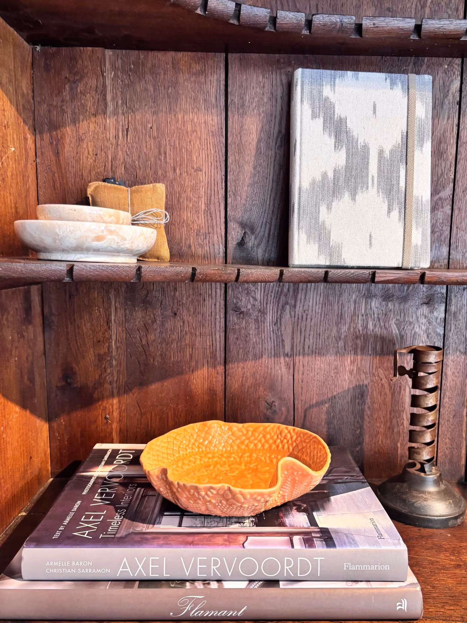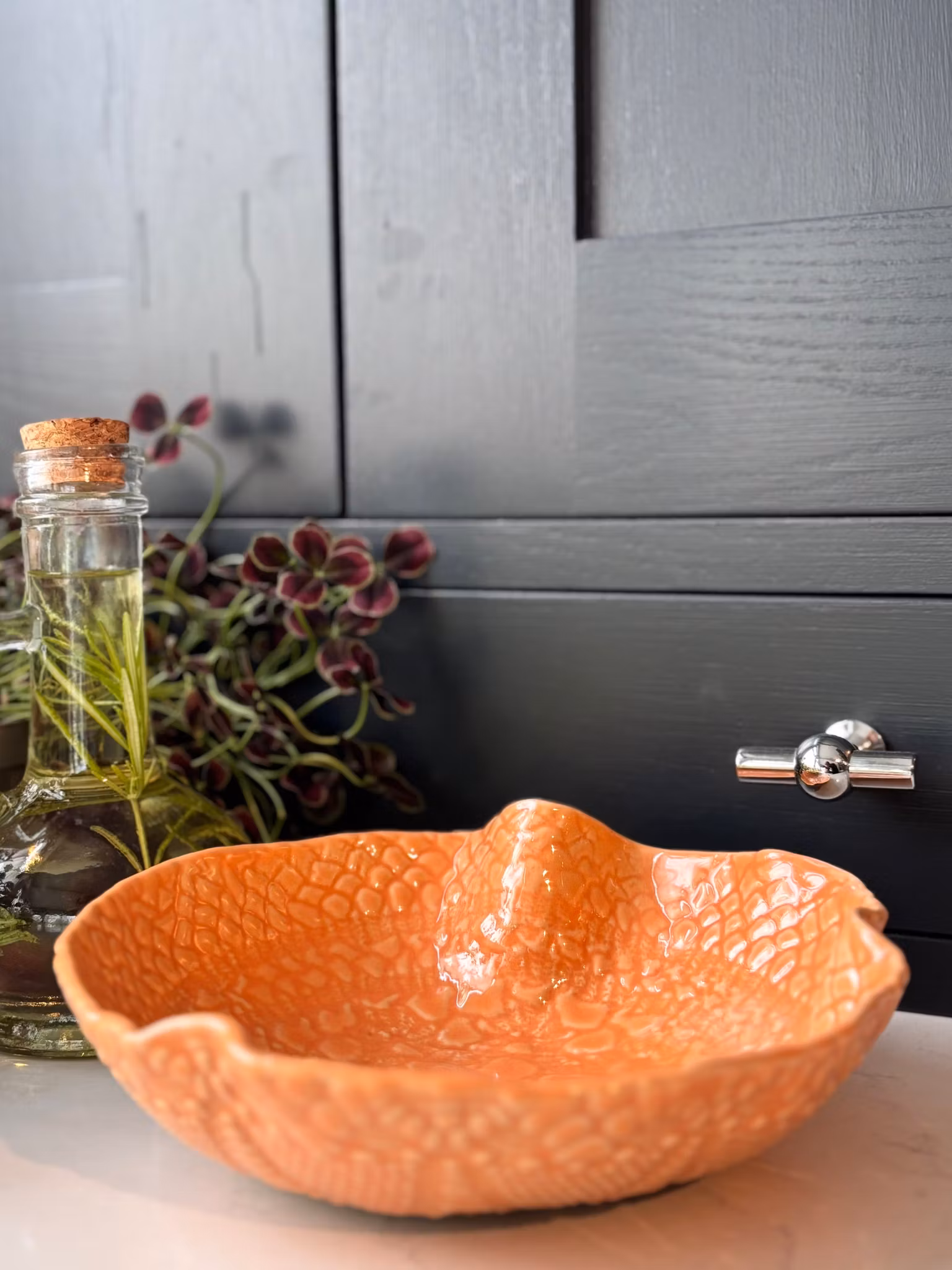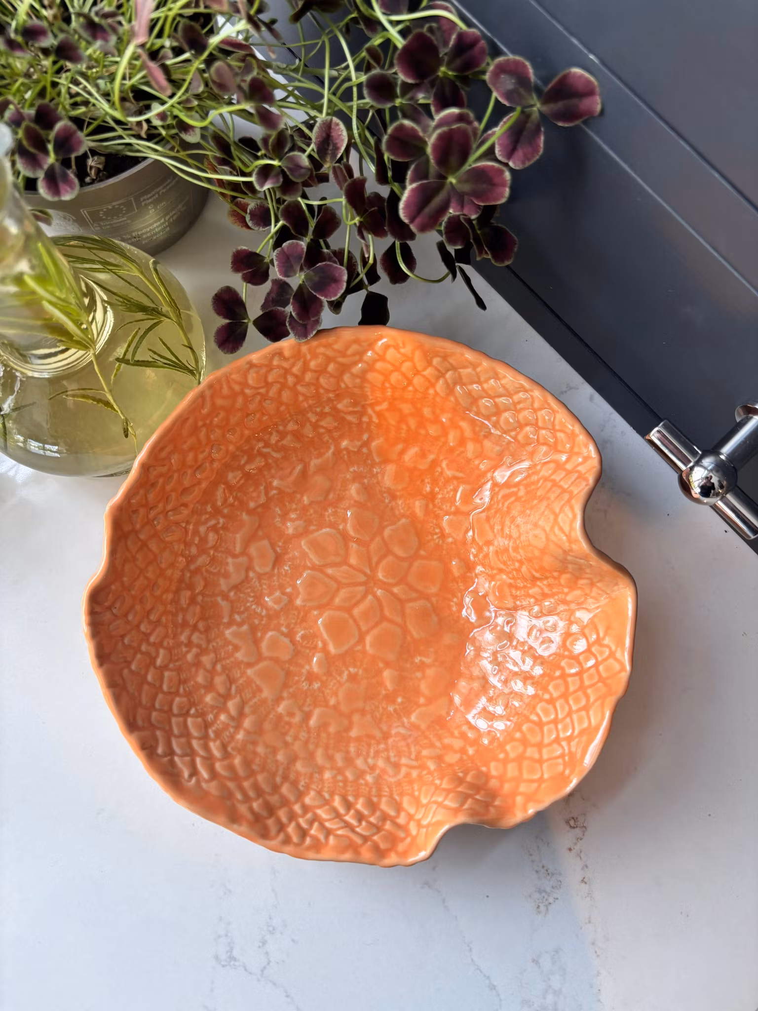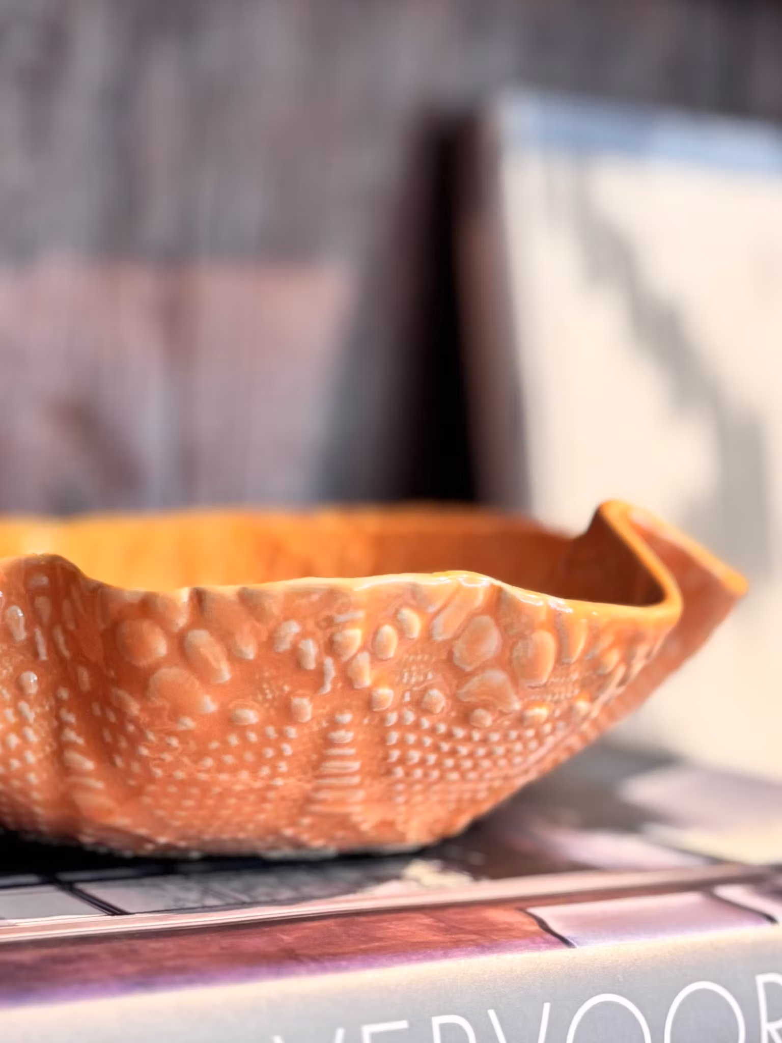 Liten oransje skål med tydelig mønster fra duk på innside og utside. Passer til smykker, mat og dekor.
