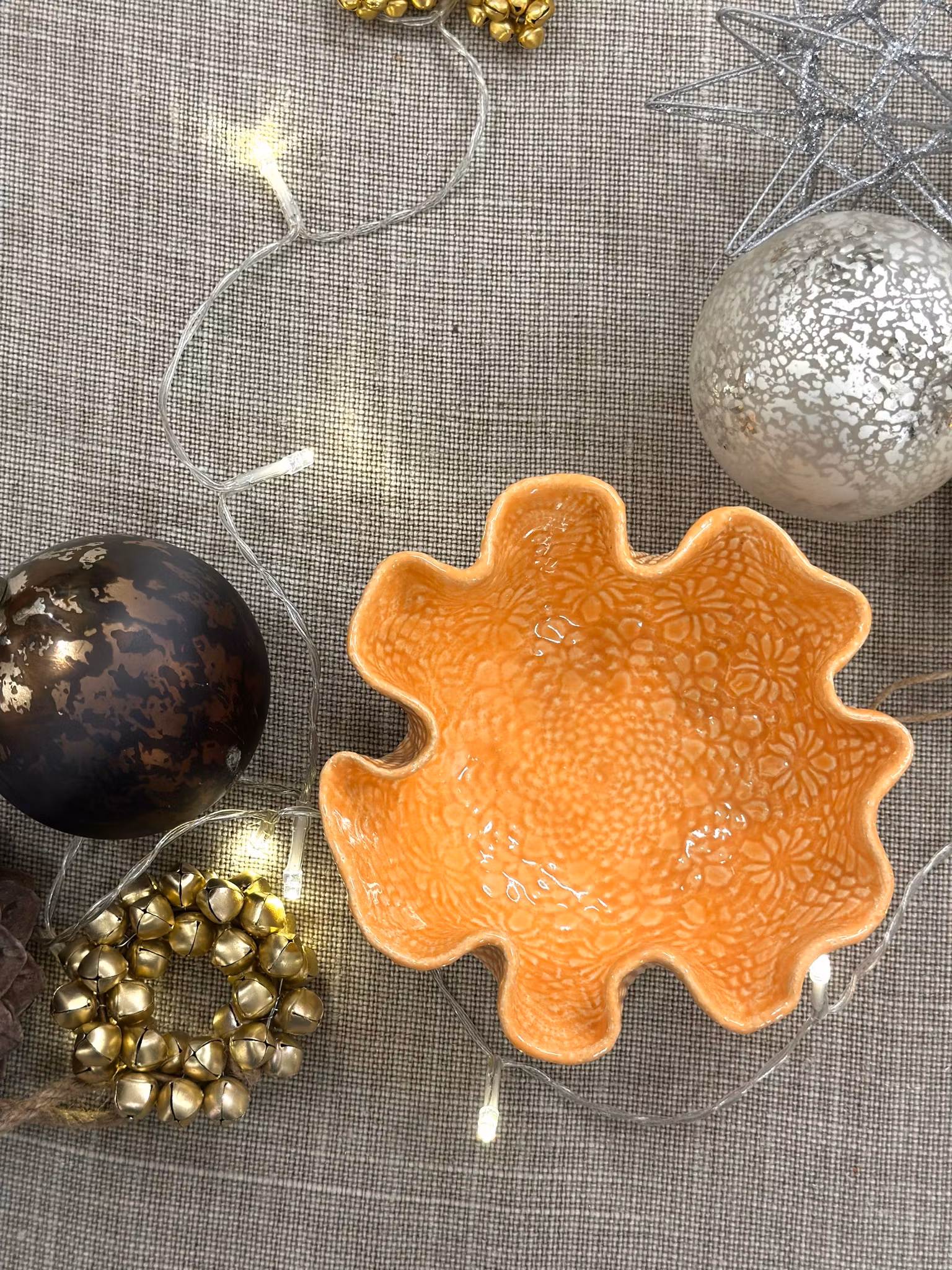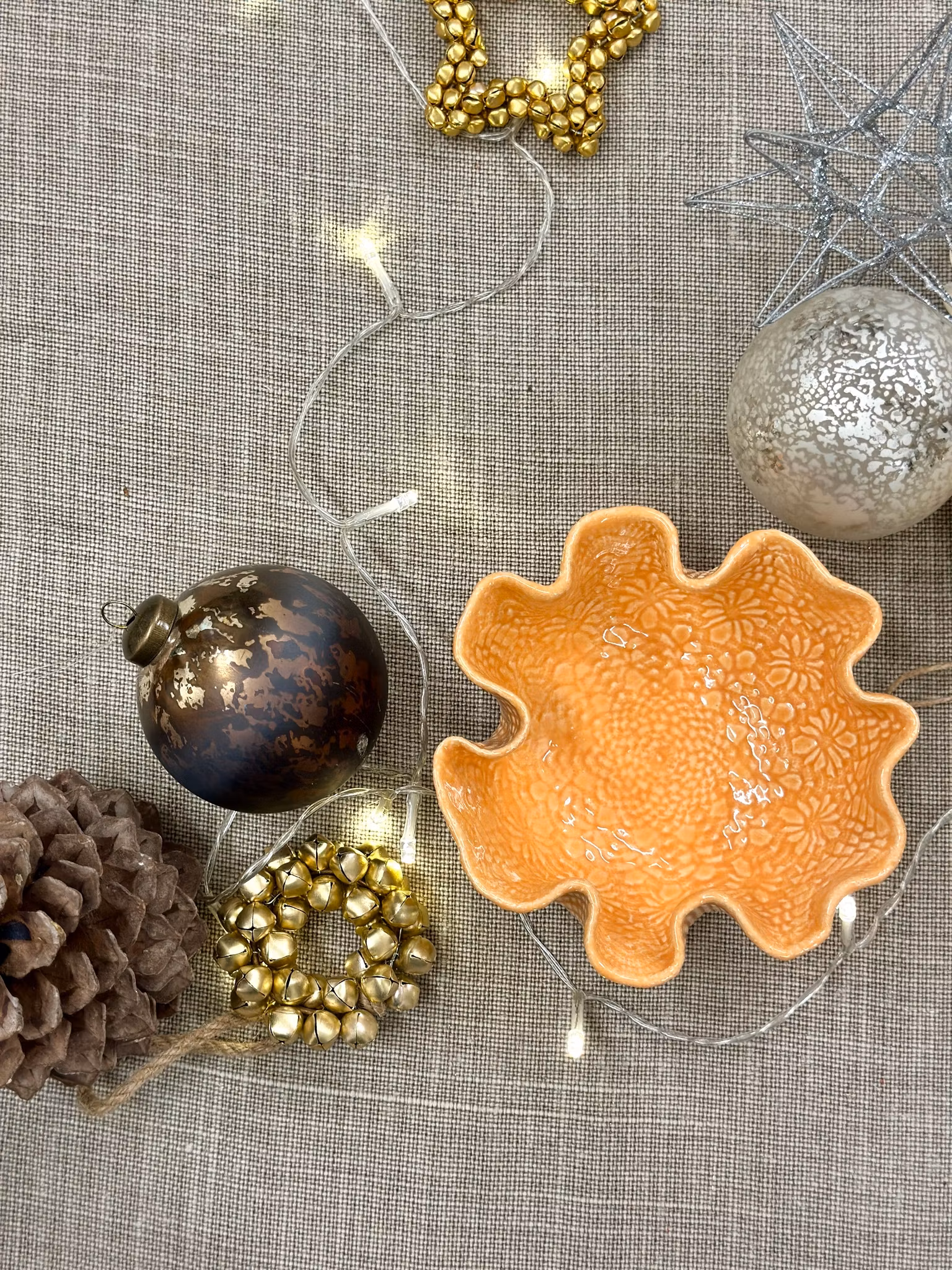 Liten skål med nydelig mønster med avtrykk av en liten heklet duk inni og en annen utenpå.