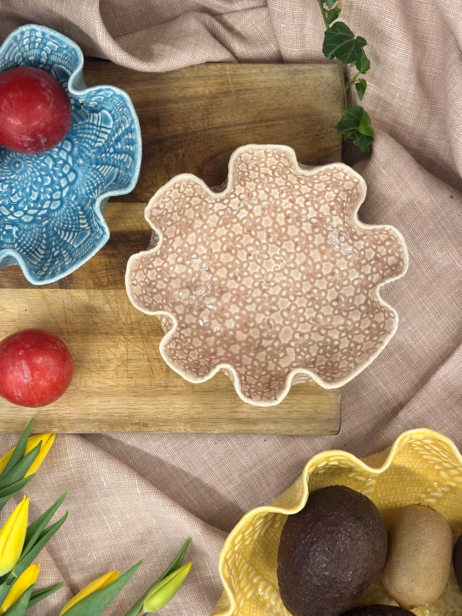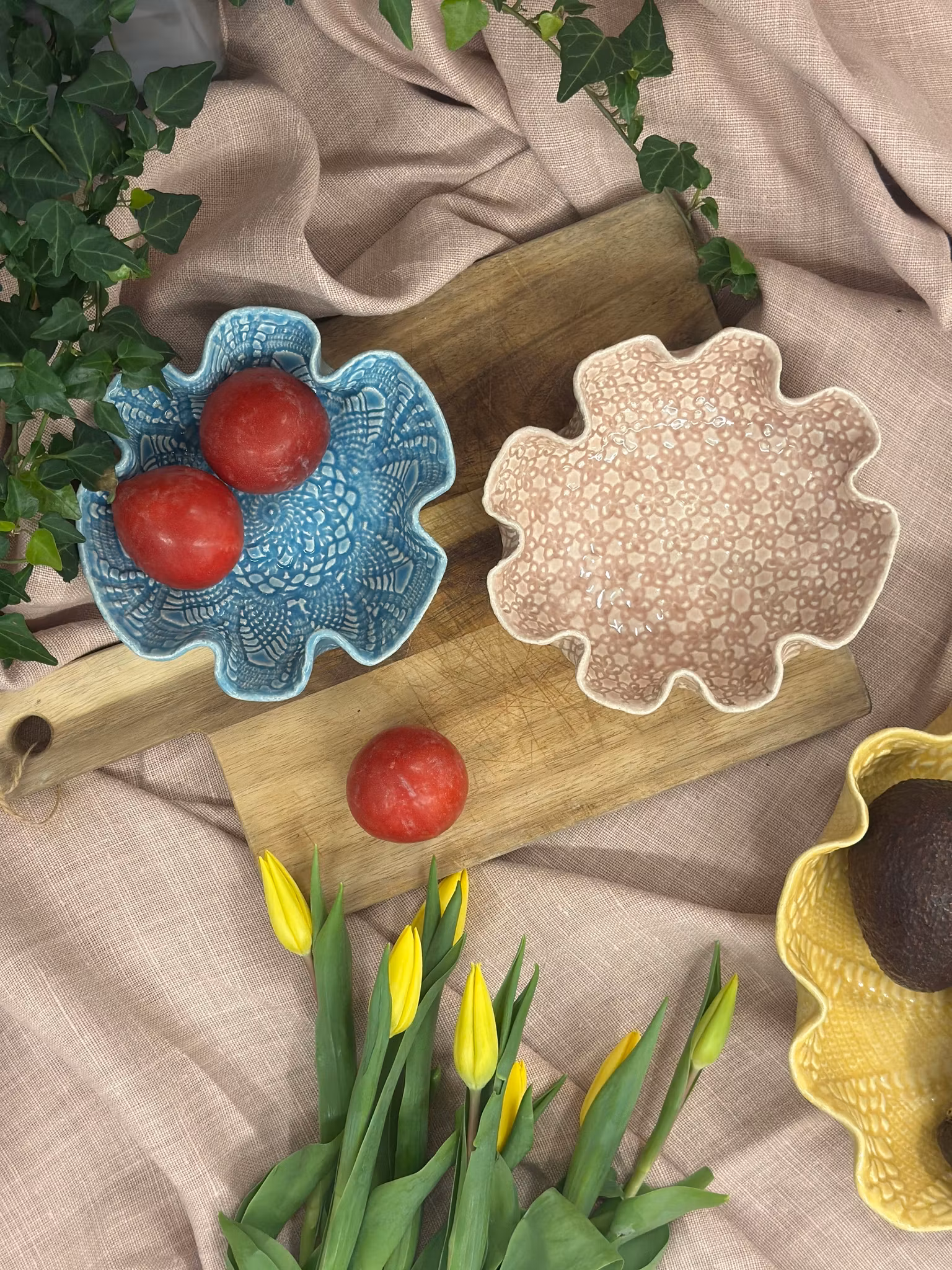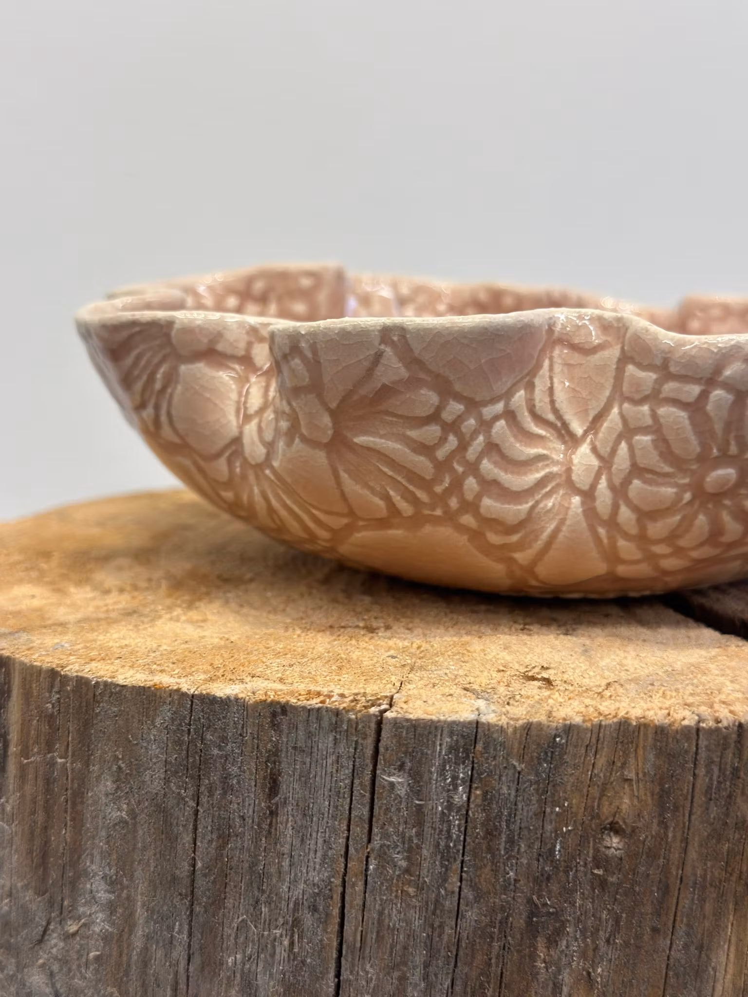 Liten skål med avtrykk fra hekleduk inni og utenpå. Nydelig til å bare stå på bordet, men perfekt til nøtter, sjokolade, salt, sauser eller dipper eller kanskje til smykkene dine på badet?