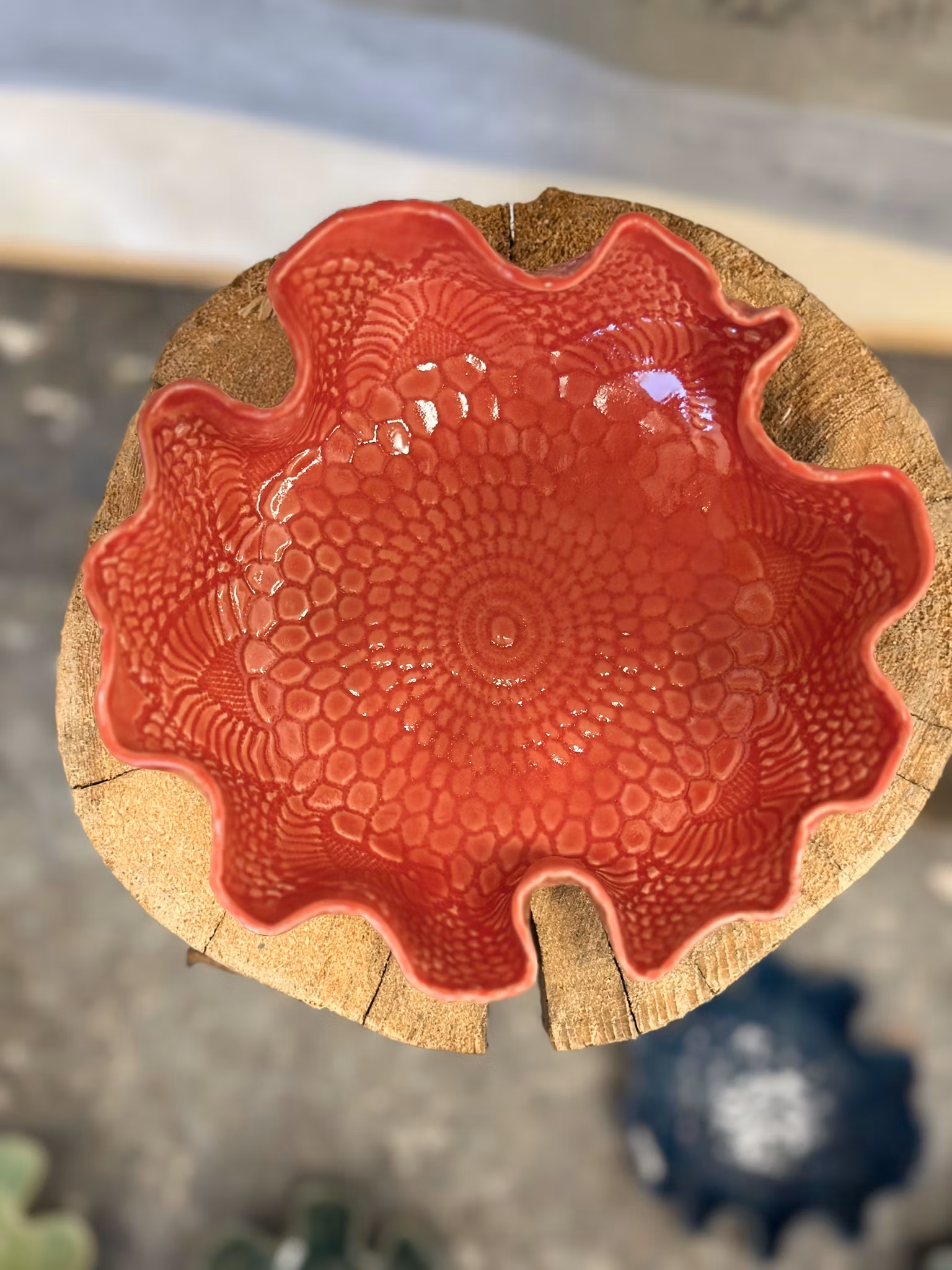 Liten skål med nydelig mønster med avtrykk av en liten heklet duk inni og en annen utenpå. . Så fin som den er eller fyll med noe å kose deg med.