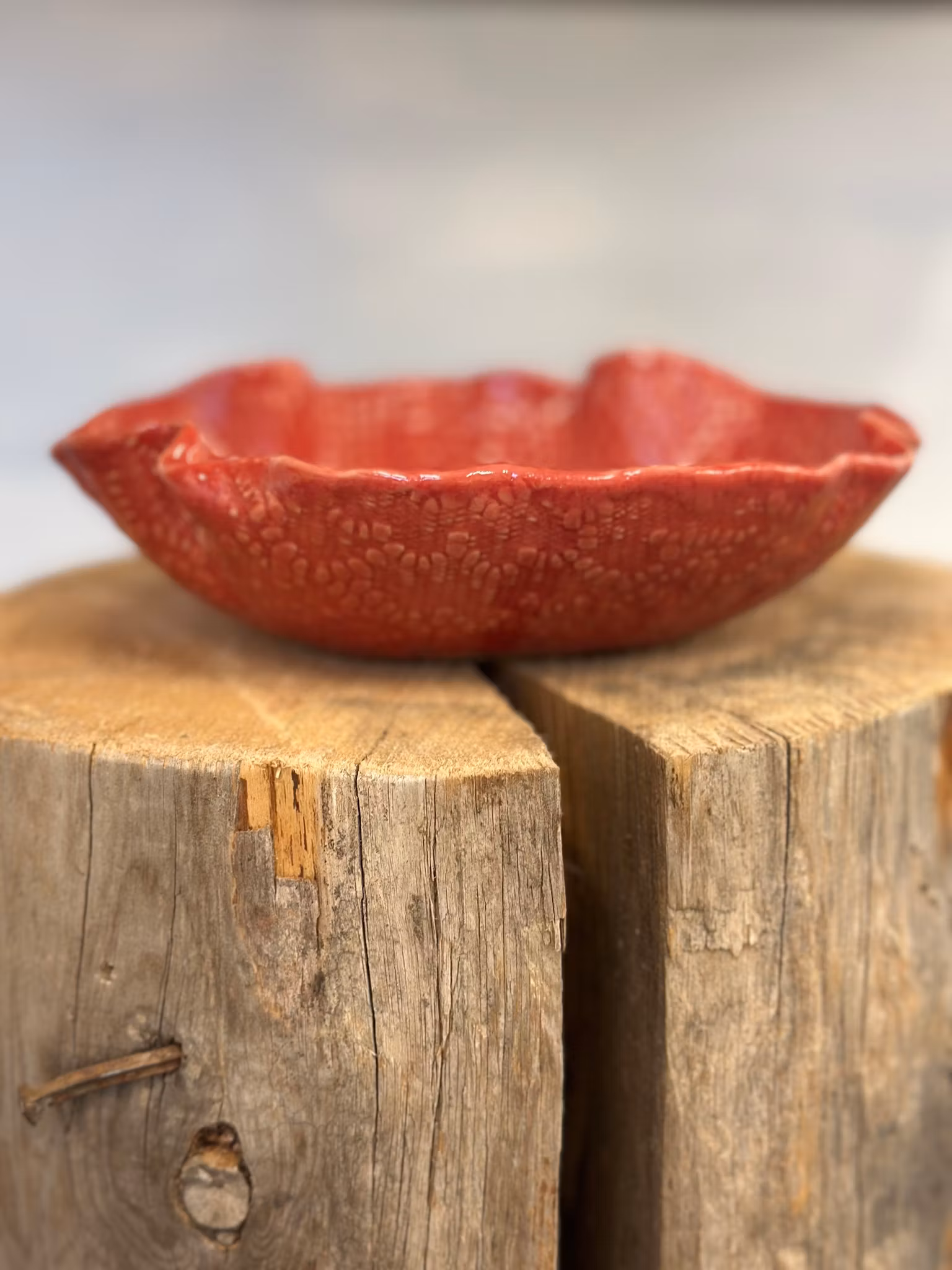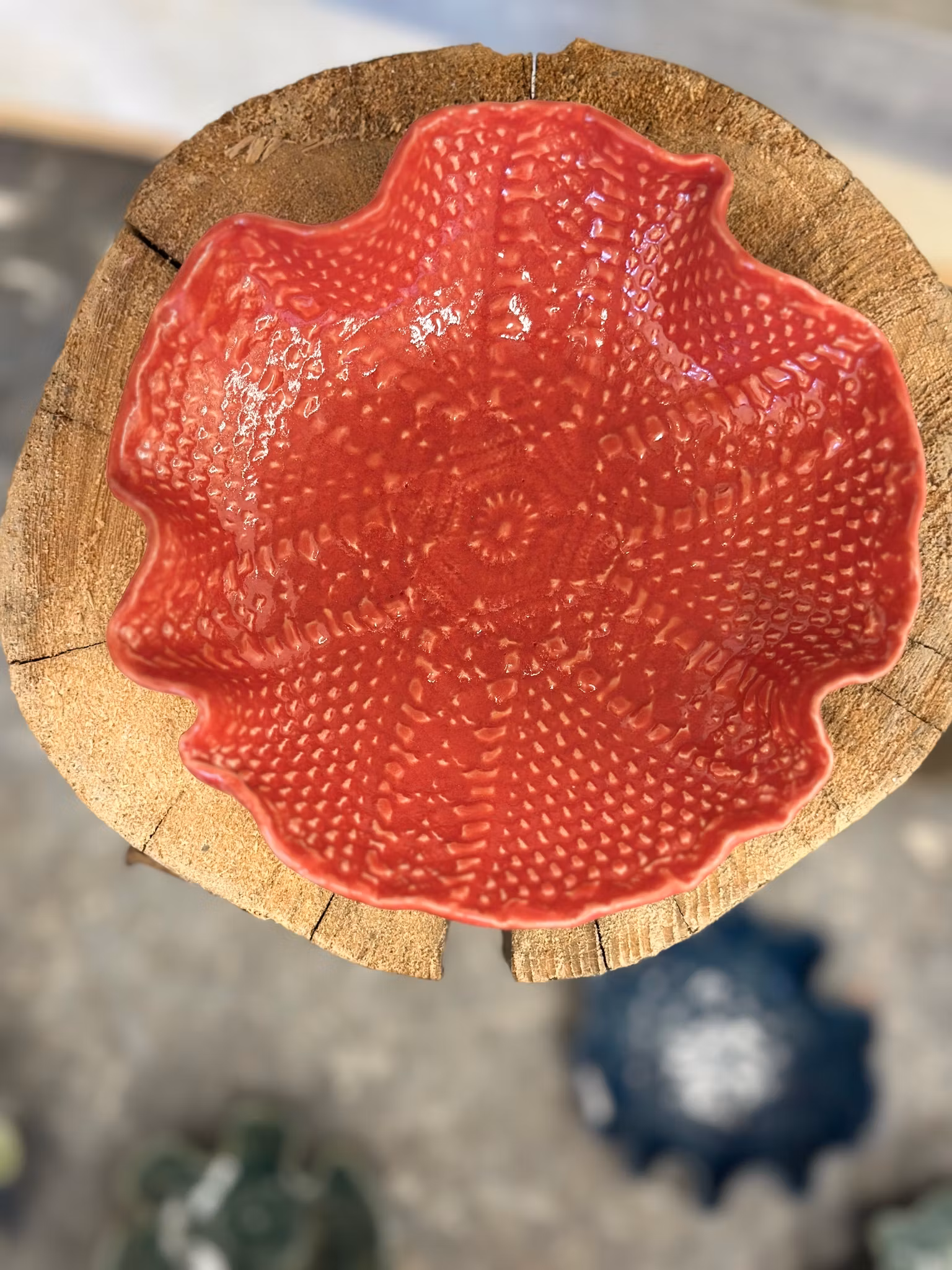 Liten skål med nydelig mønster med avtrykk av en liten heklet duk inni og en annen utenpå. . Så fin som den er eller fyll med noe å kose deg med.