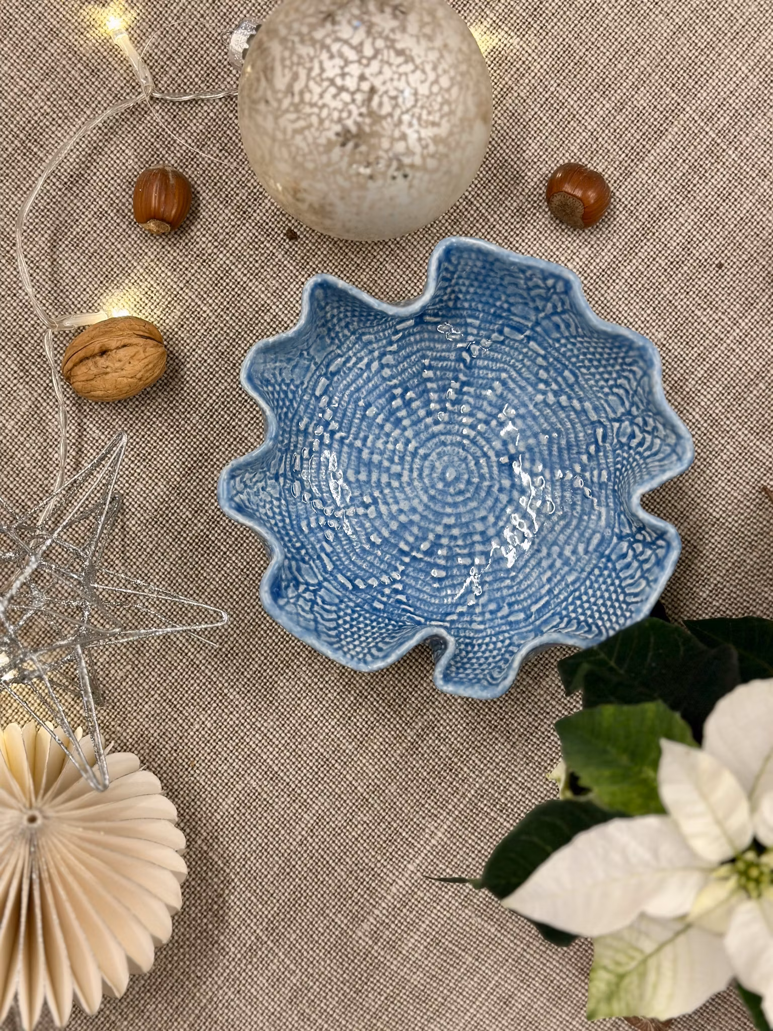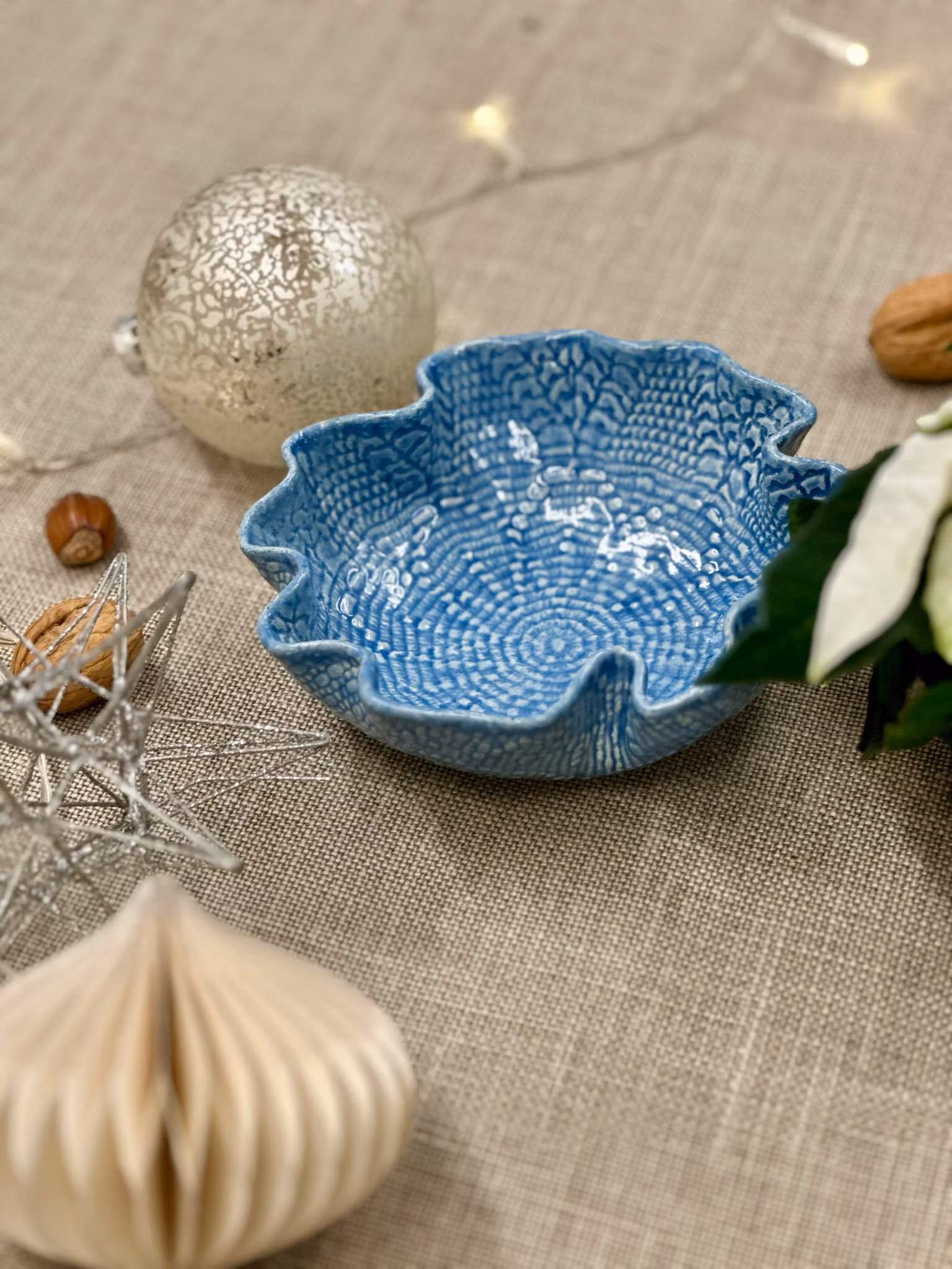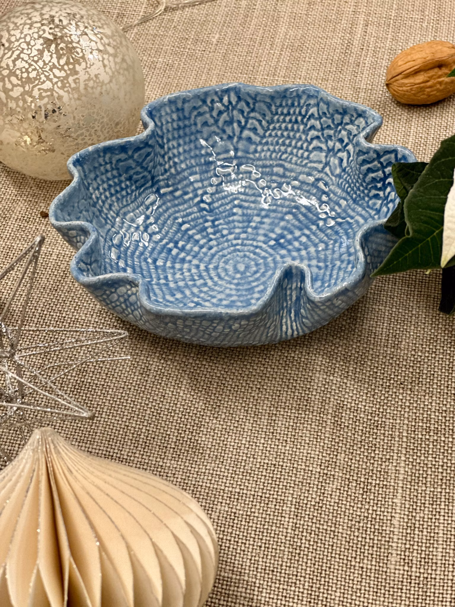 Liten skål med nydelig mønster med avtrykk av en liten heklet duk inni og en annen utenpå.