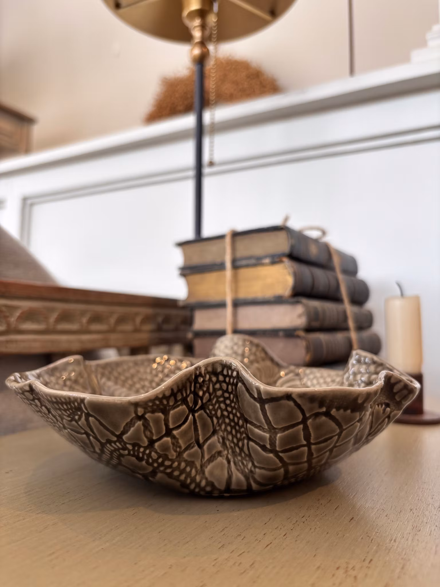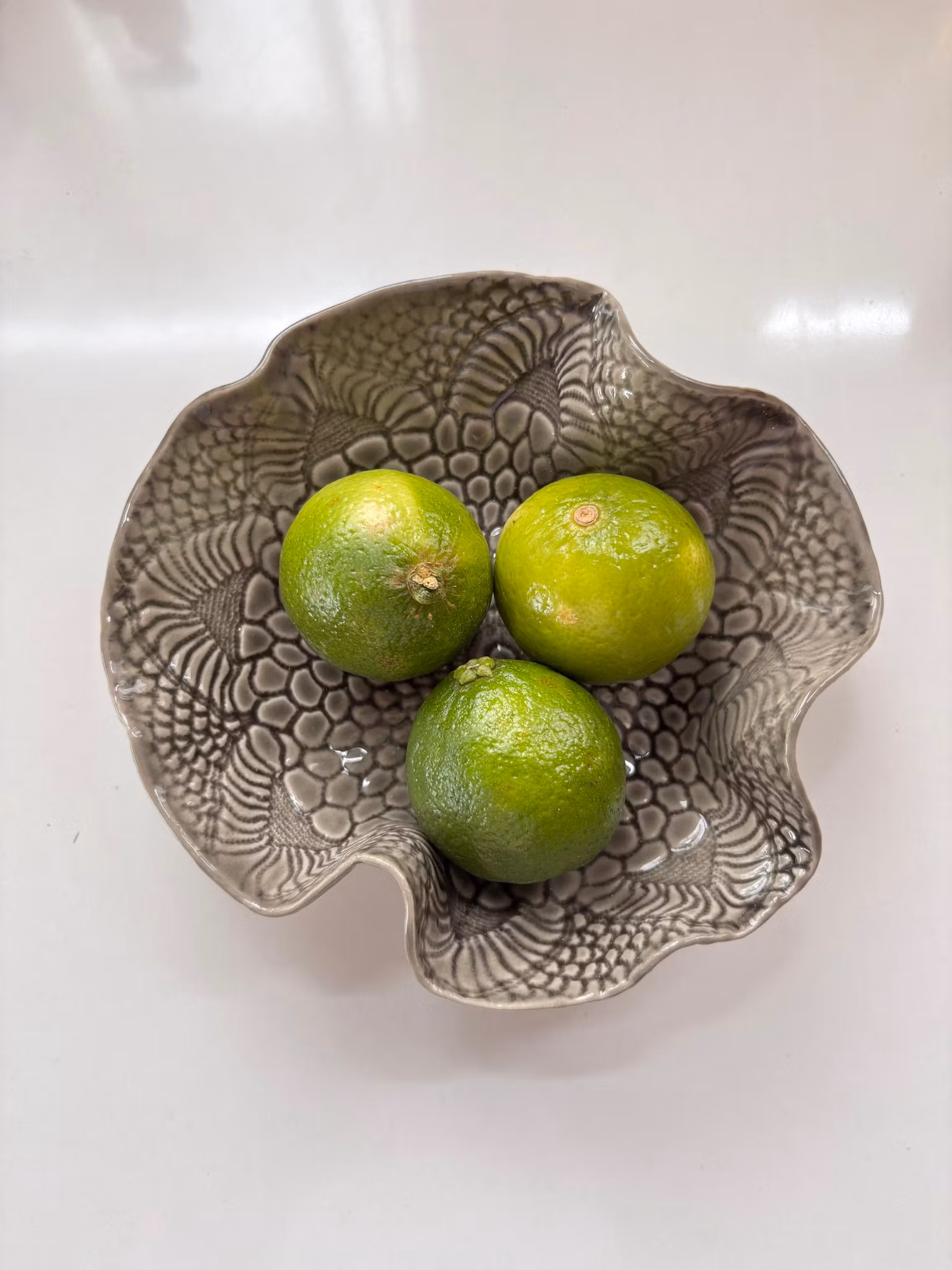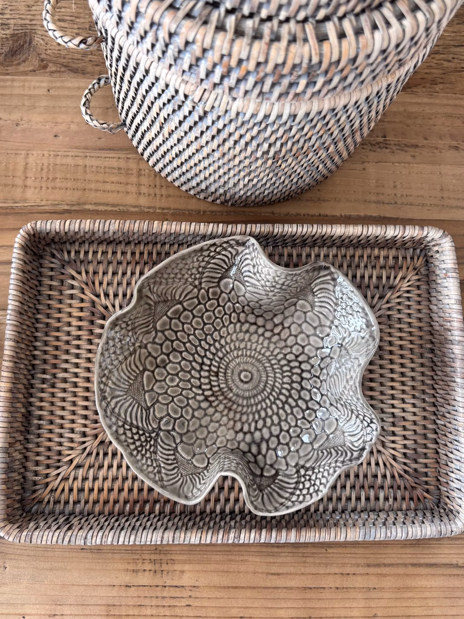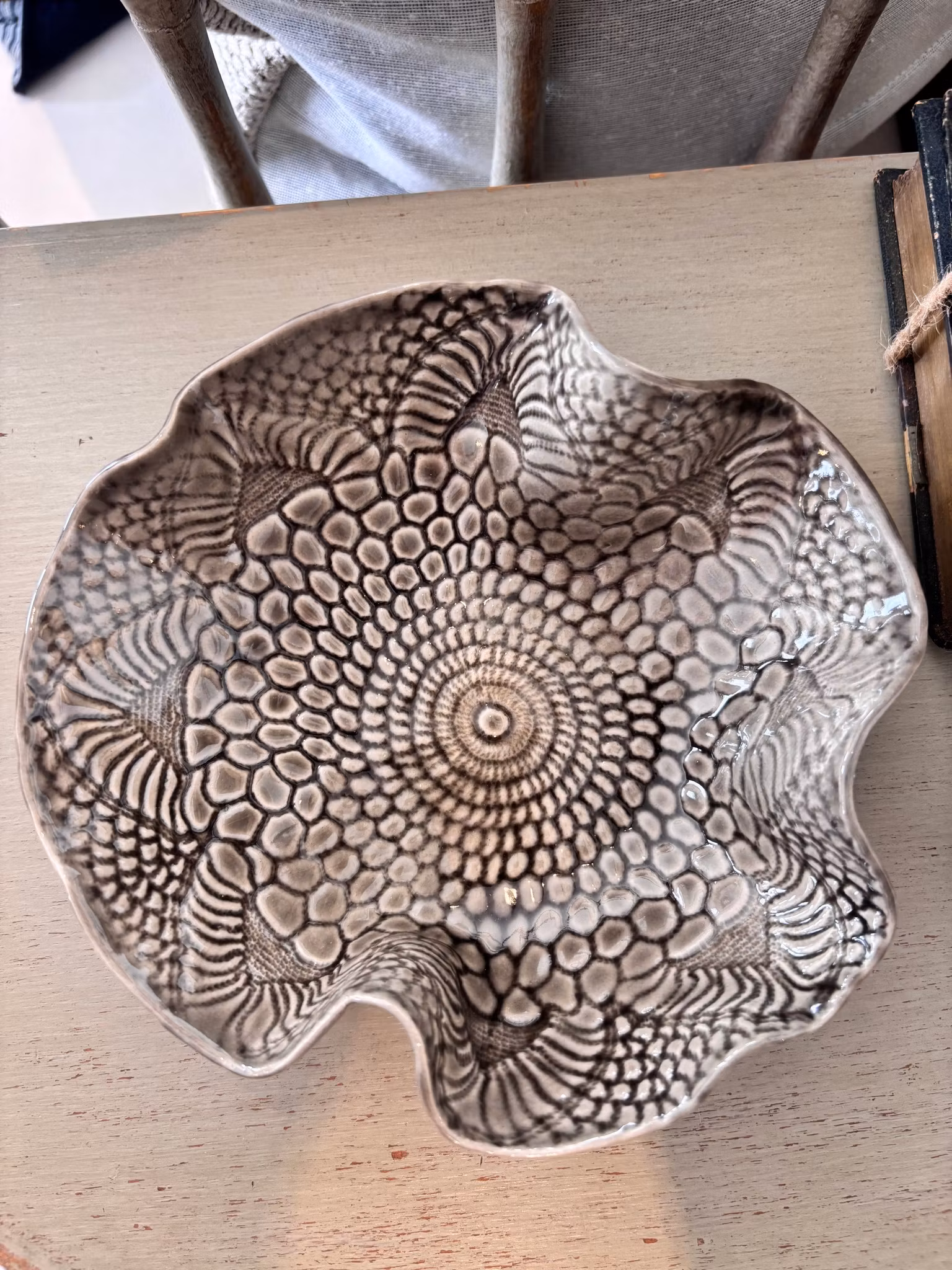 Fin liten skål med lekkert avtrykk fra åkle. Pen som dekor og til å servere i.
