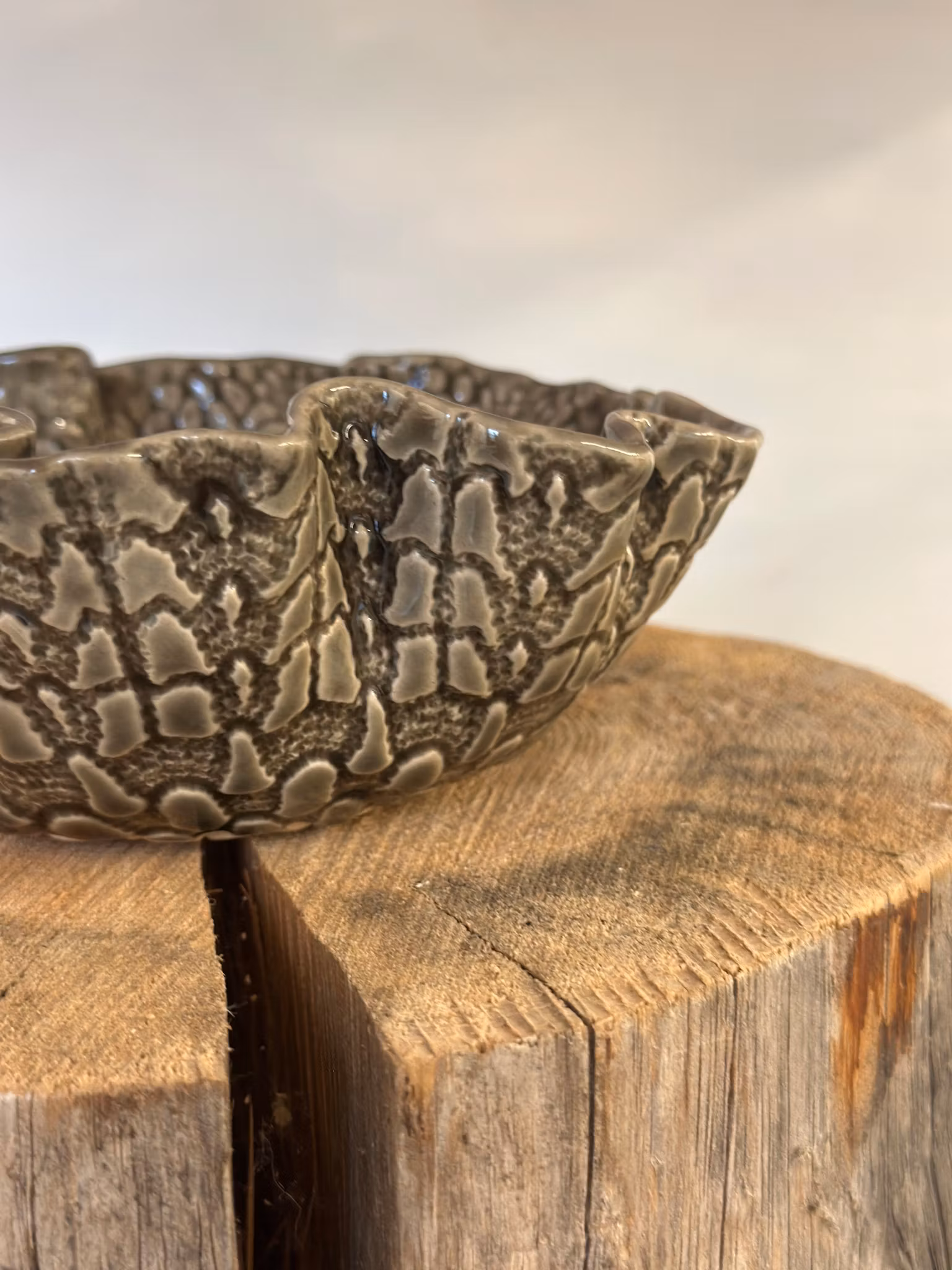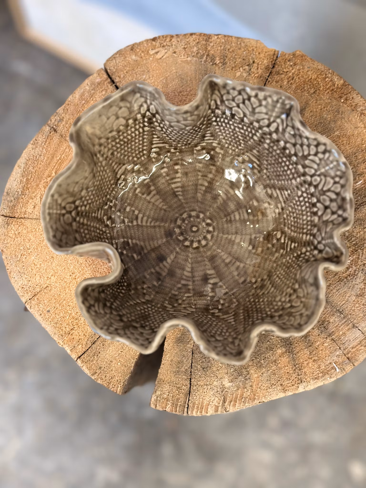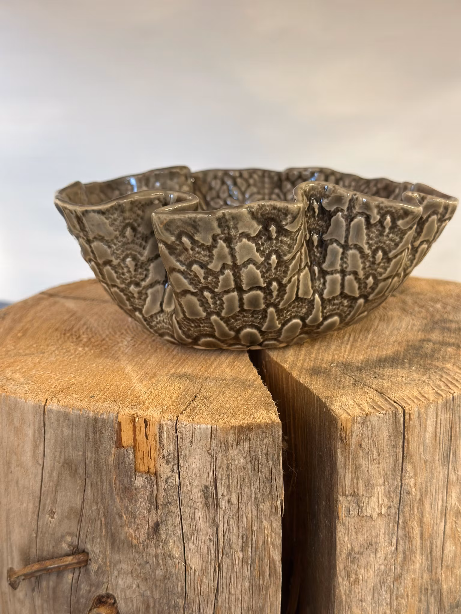 Liten skål med nydelig mønster med avtrykk av en liten heklet duk inni og en annen utenpå. . Så fin som den er eller fyll med noe å kose deg med.