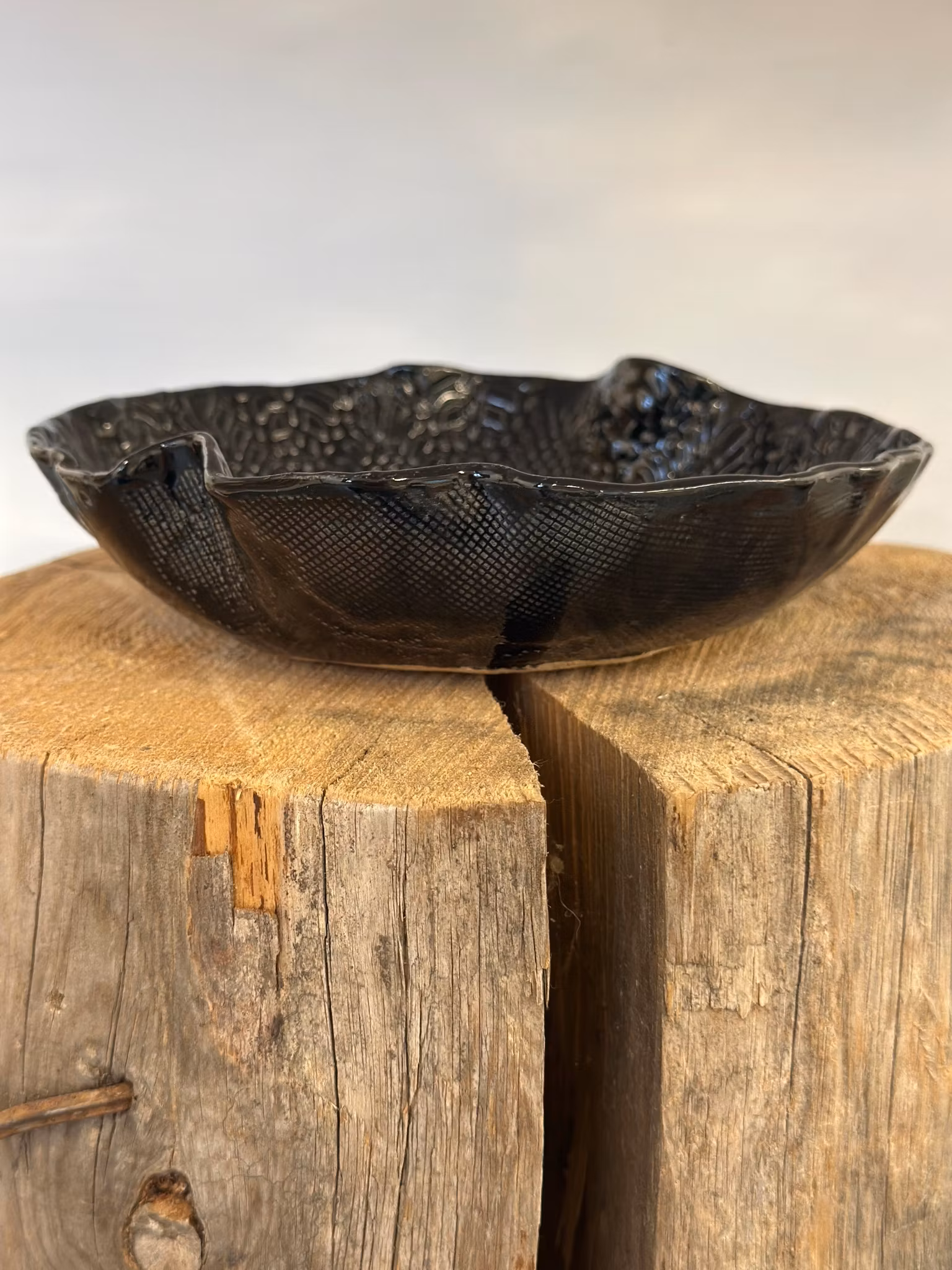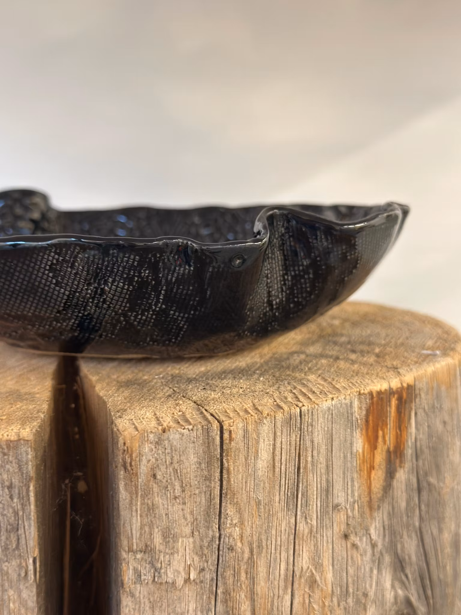 Liten skål med nydelig mønster med avtrykk av en liten heklet duk inni og en annen utenpå. . Så fin som den er eller fyll med noe å kose deg med.