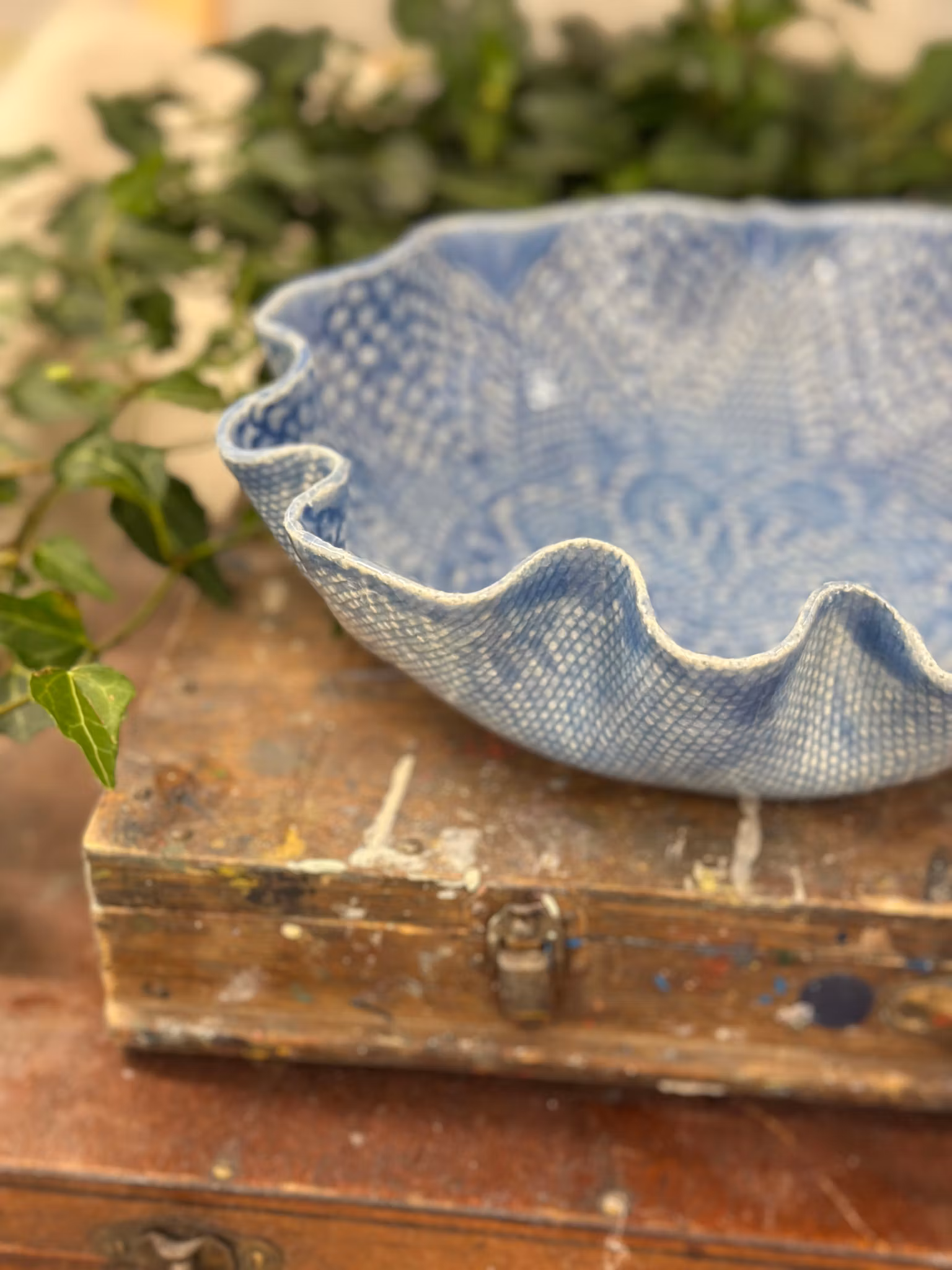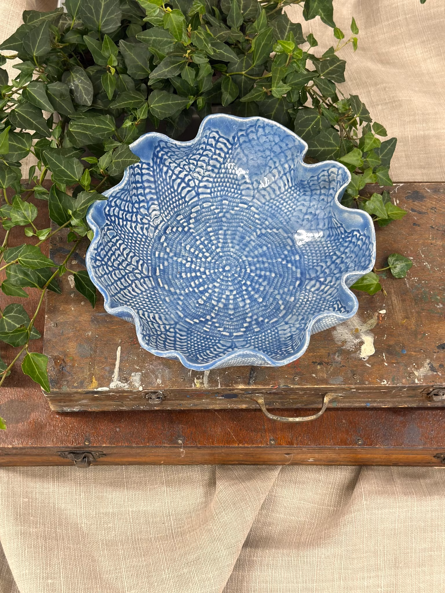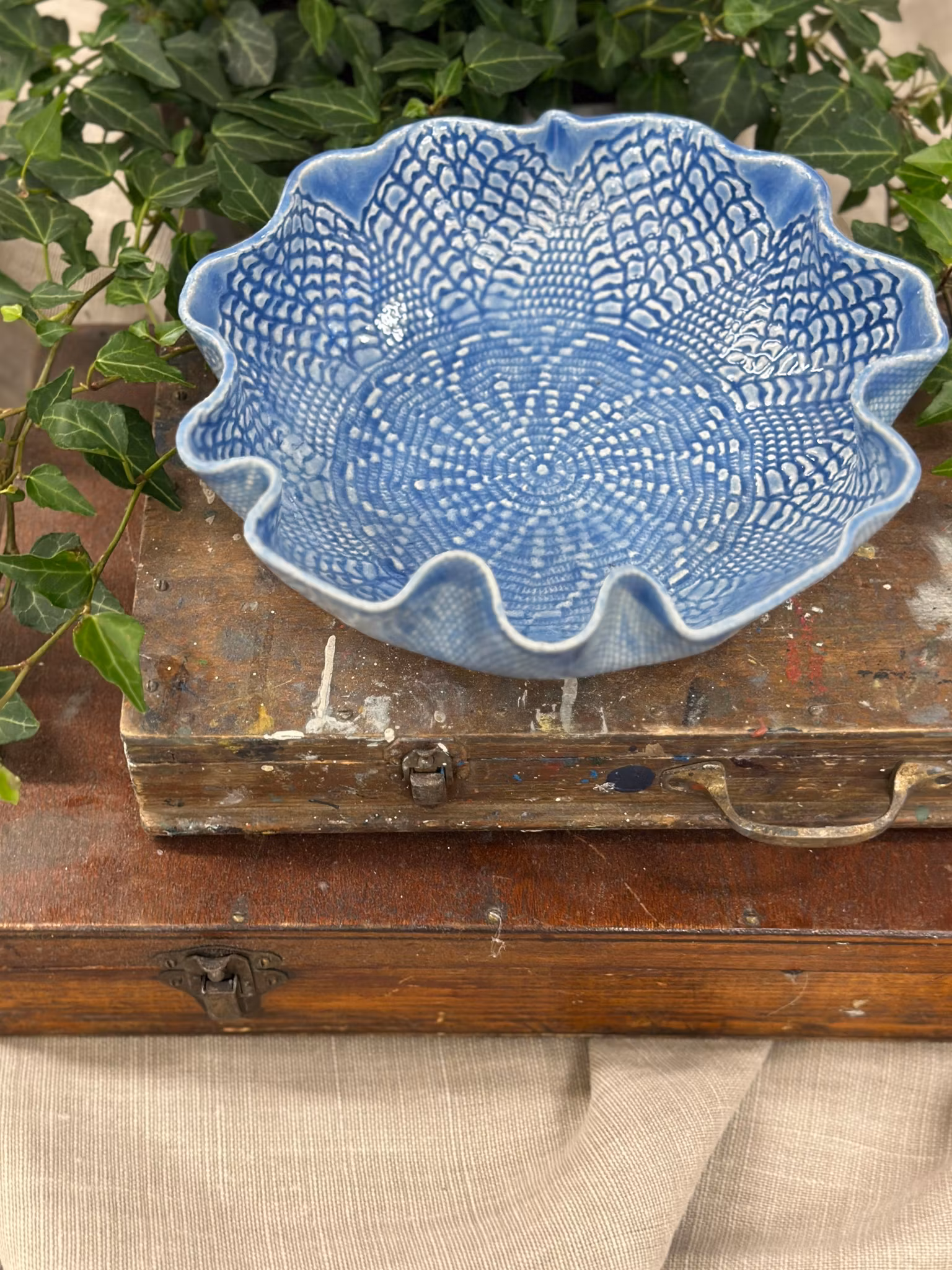 En litt mindre skål i lys blå med mønster av en liten hekleduk som passer perfekt i størrelsen til denne skålen. Fargen er litt lysere utenpå grunnet svakere mønster. Utenpå er det avtrykk av et sartere mønster fra en gammel gardin.