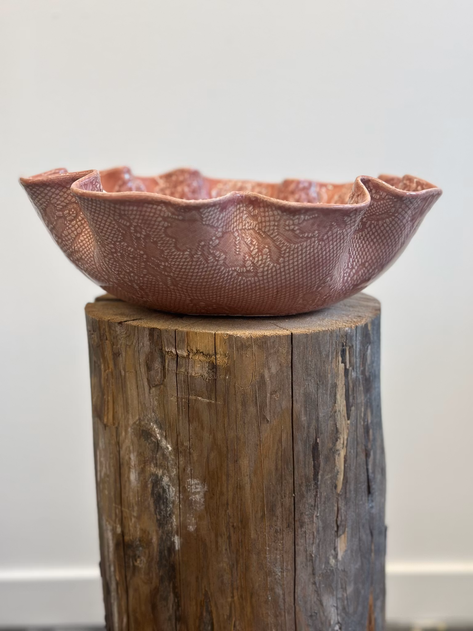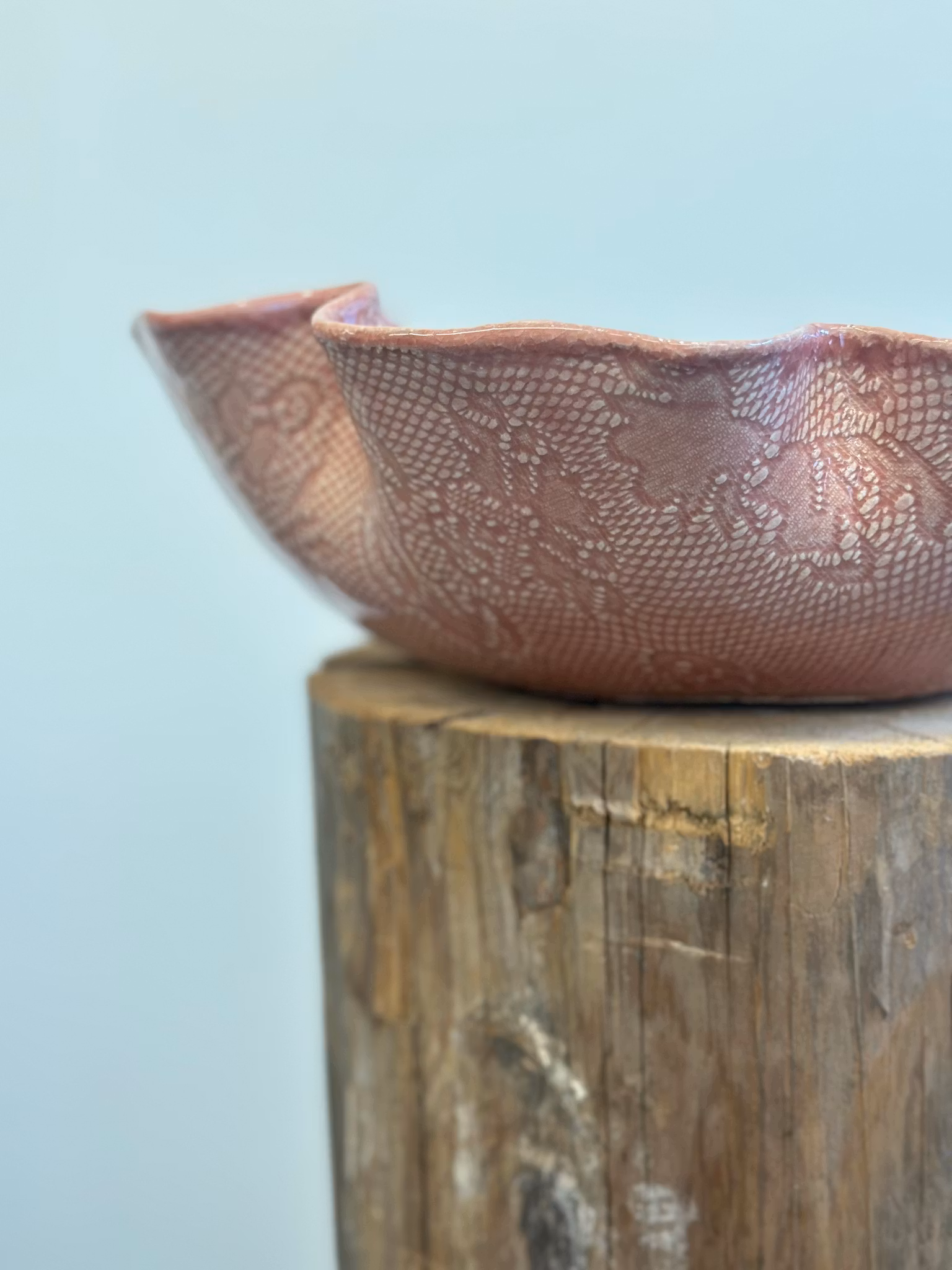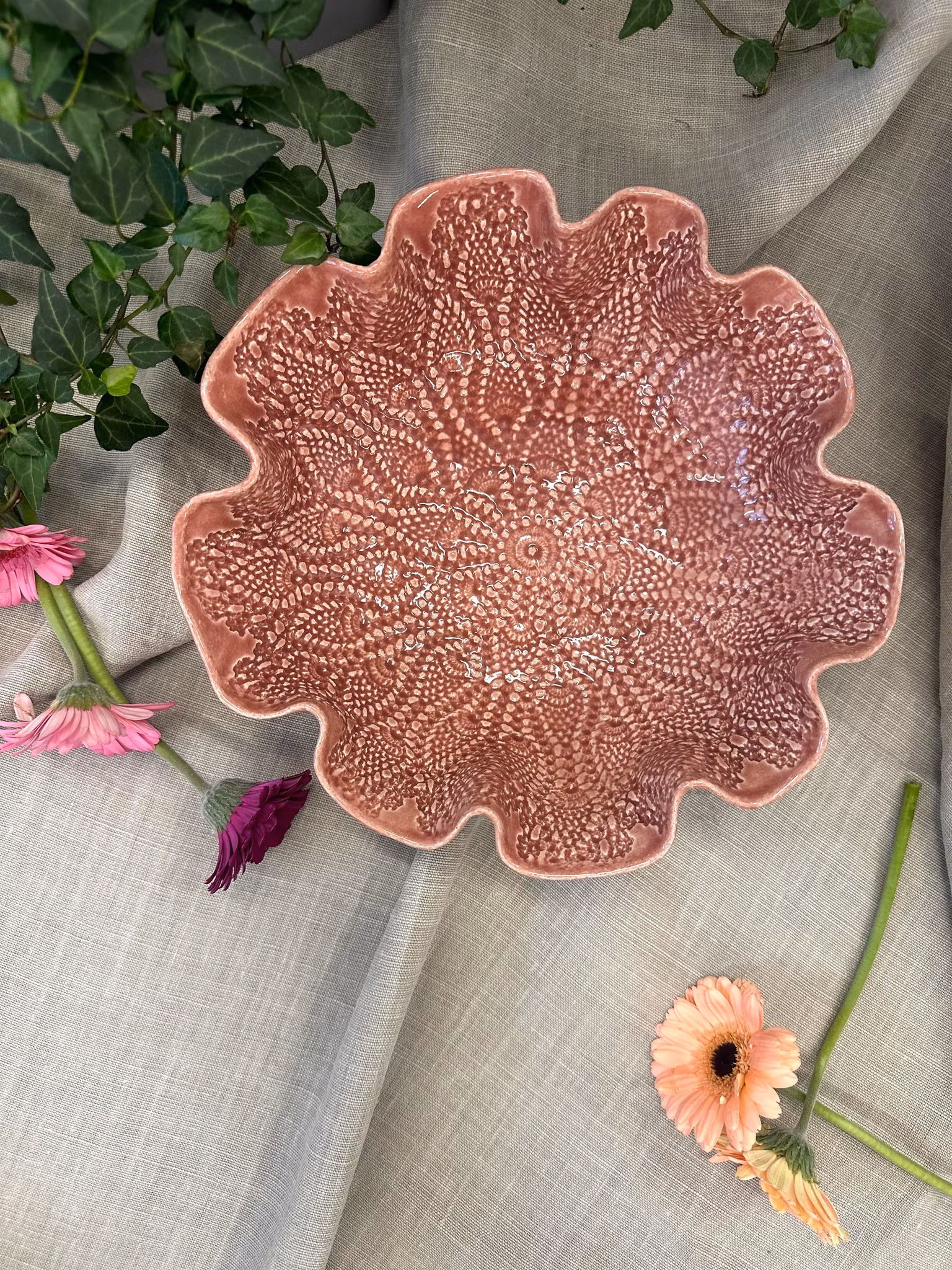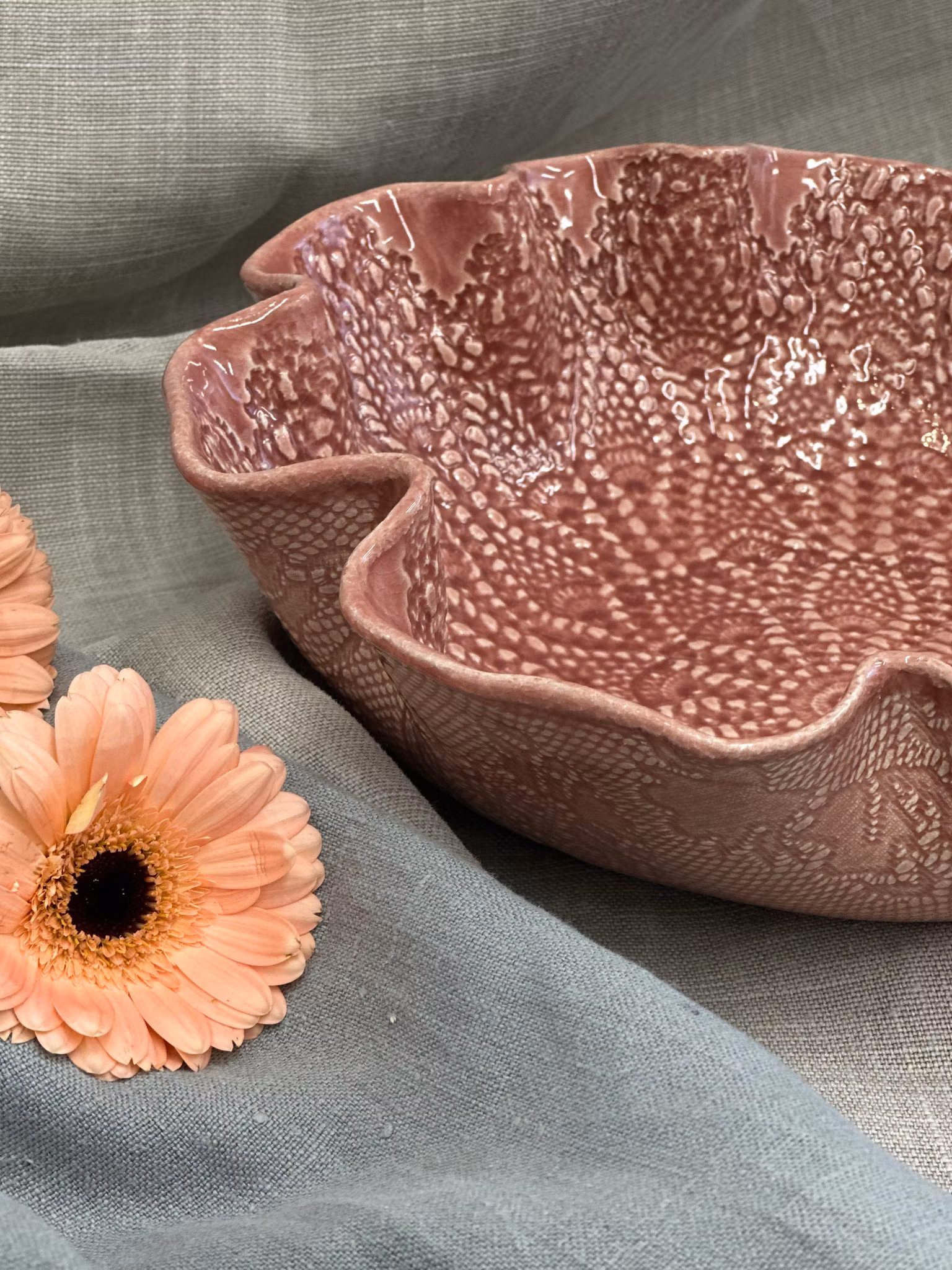 Lekker bolle i Dusty pink med ganske høy kant! Vakkert avtrykk fra en gammel hekleduk med små masker som gir et flott uttrykk inni. Utenpå er det mønster fra en gammel gardin.