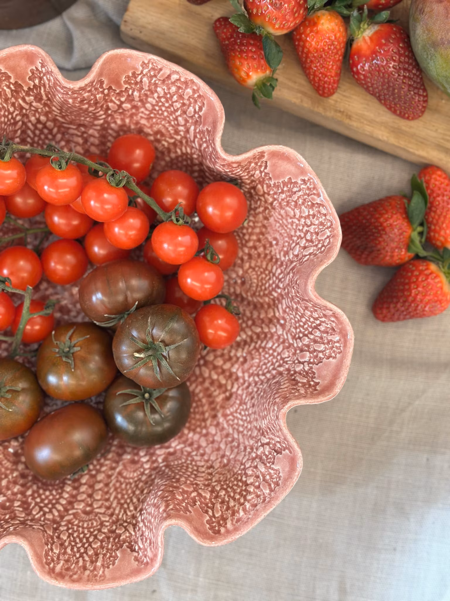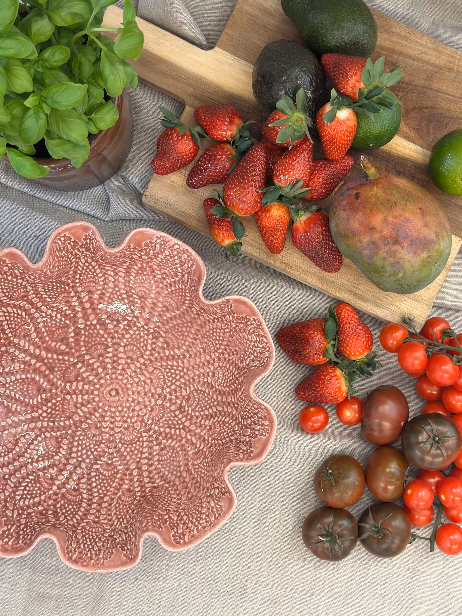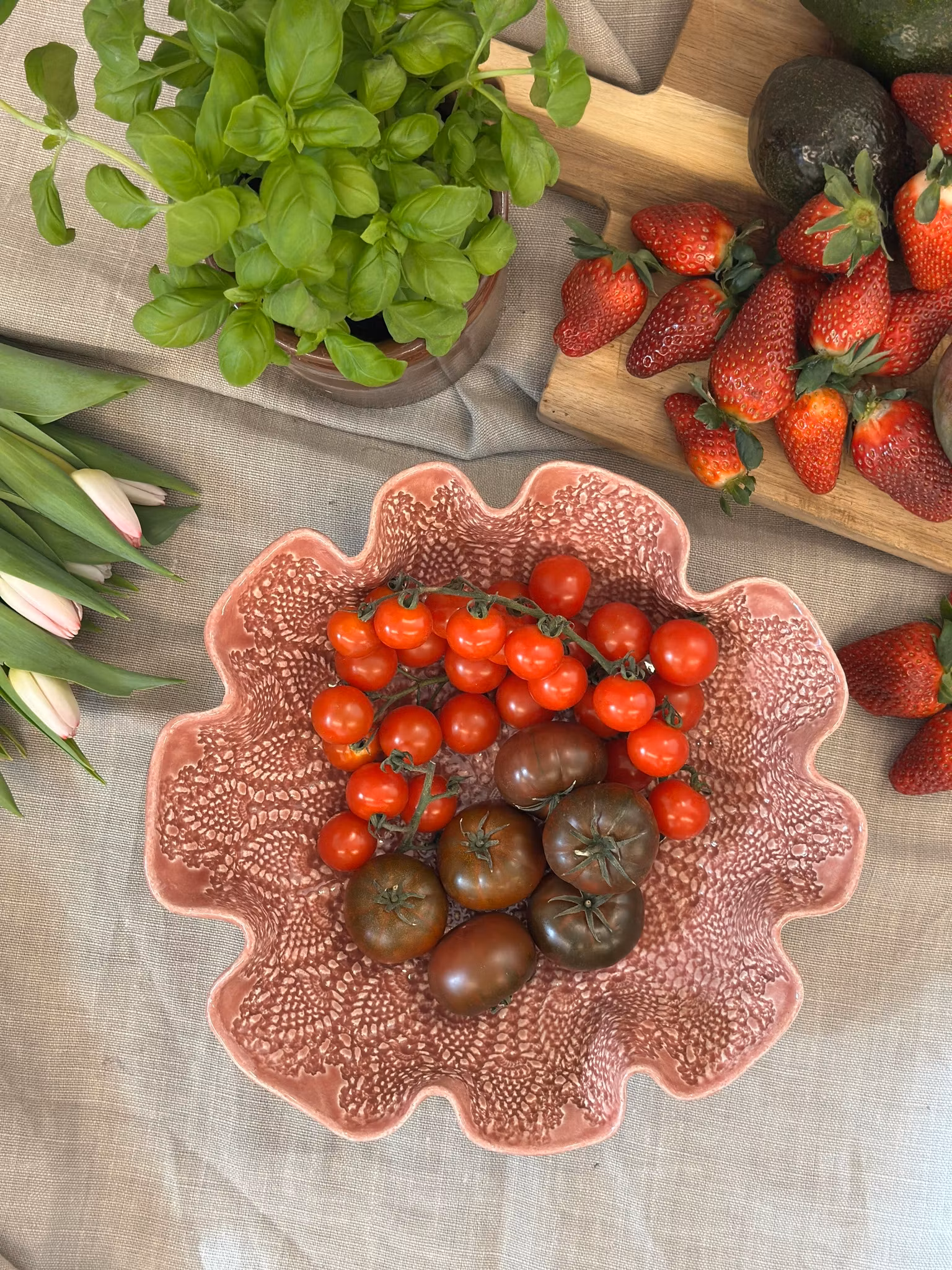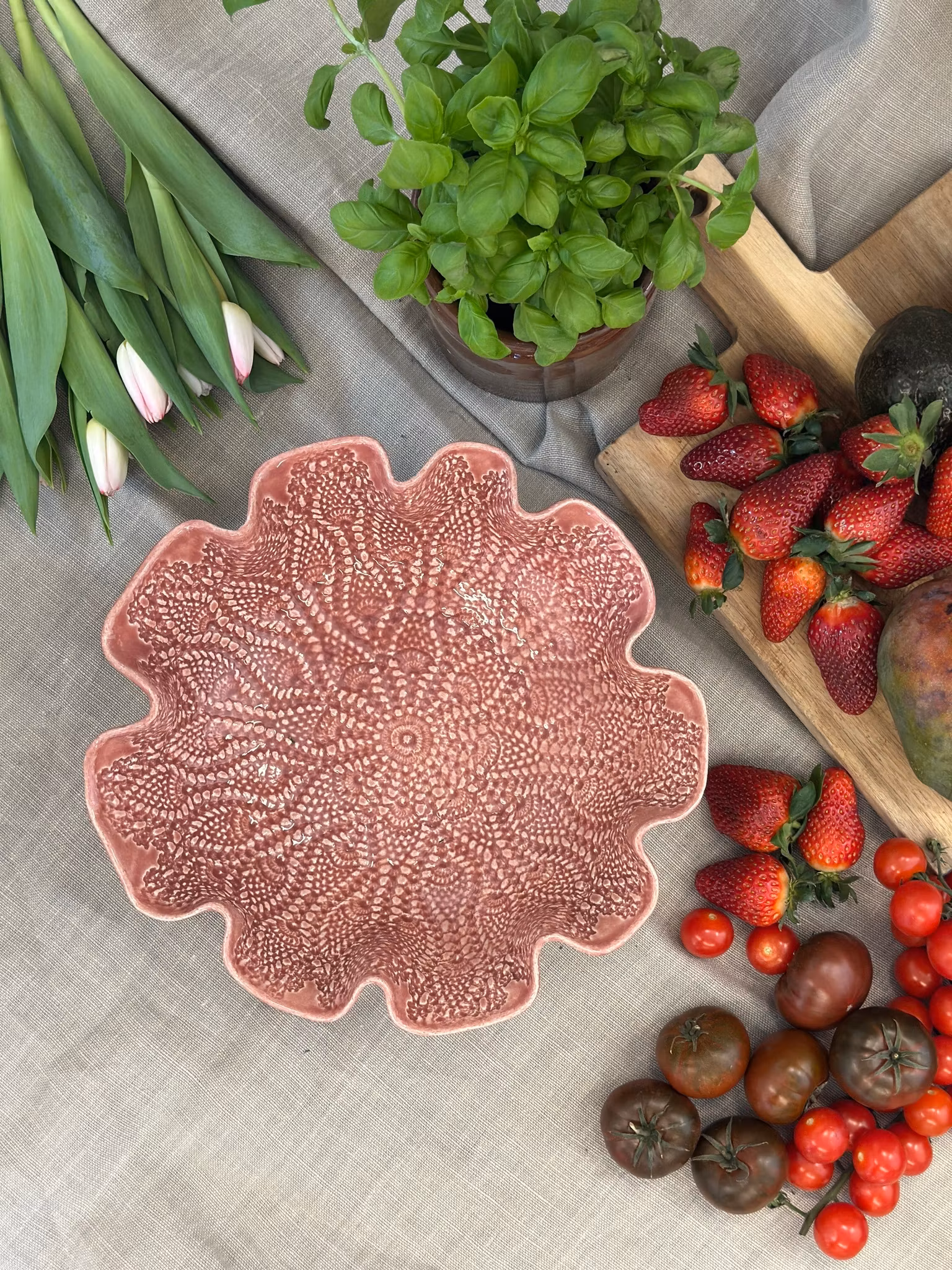 Lekker bolle i Dusty pink med ganske høy kant! Vakkert avtrykk fra en gammel hekleduk med små masker som gir et flott uttrykk inni. Utenpå er det mønster fra en gammel gardin.