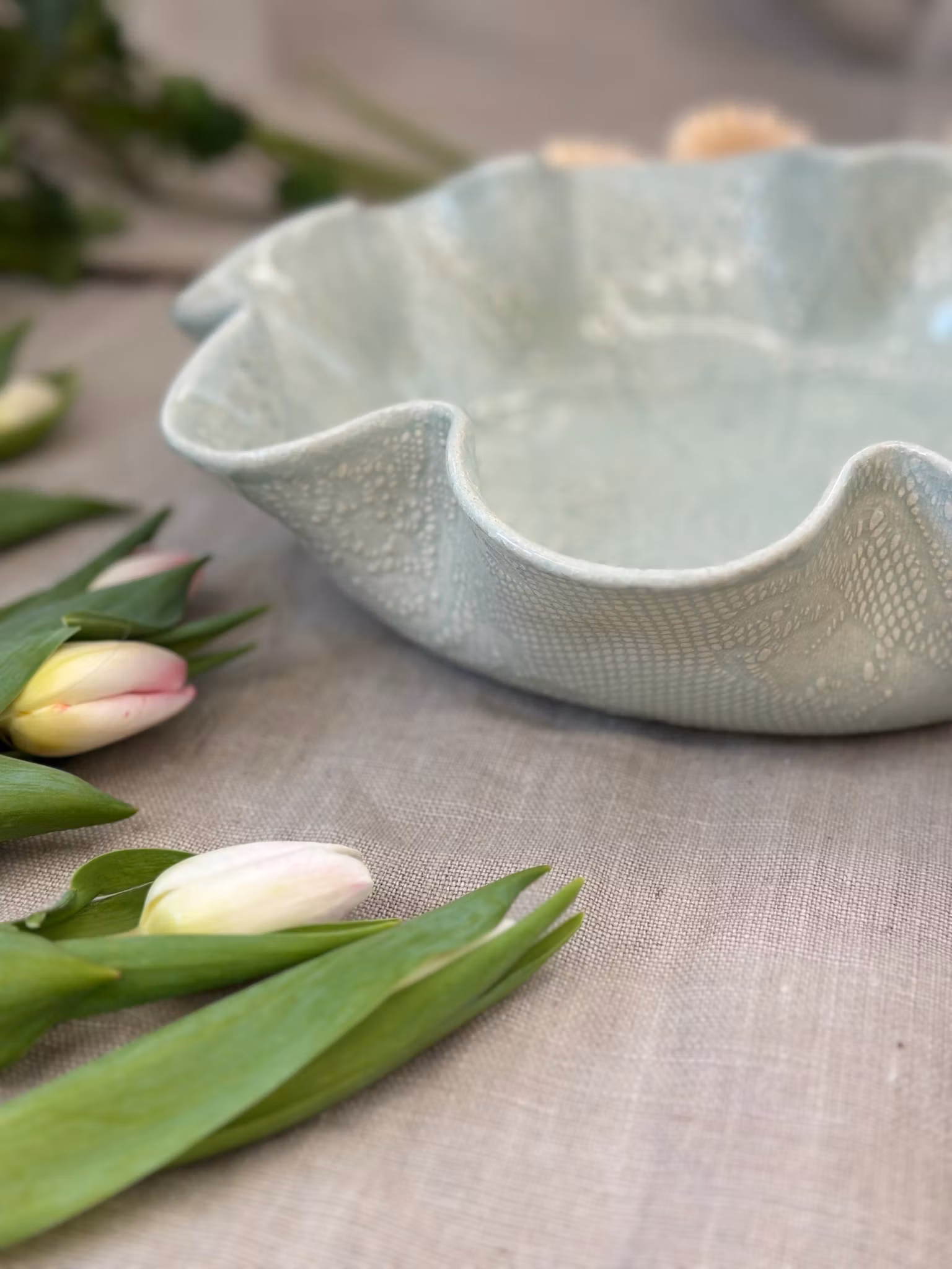 Nydelig fat med et avtrykk fra en sart hekleduk med små fine tegninger. Utenpå er det avtrykk av en gammel gardin.