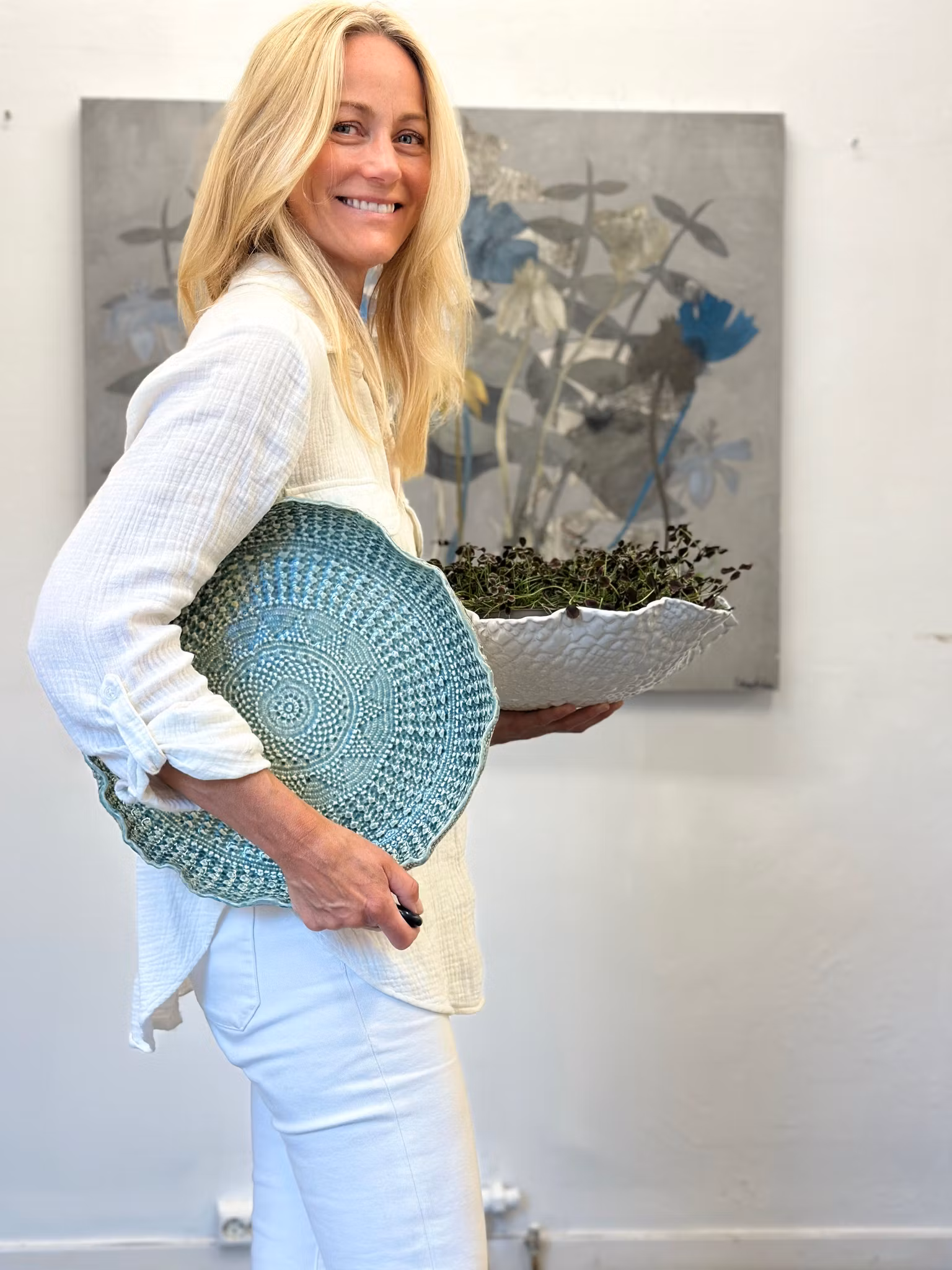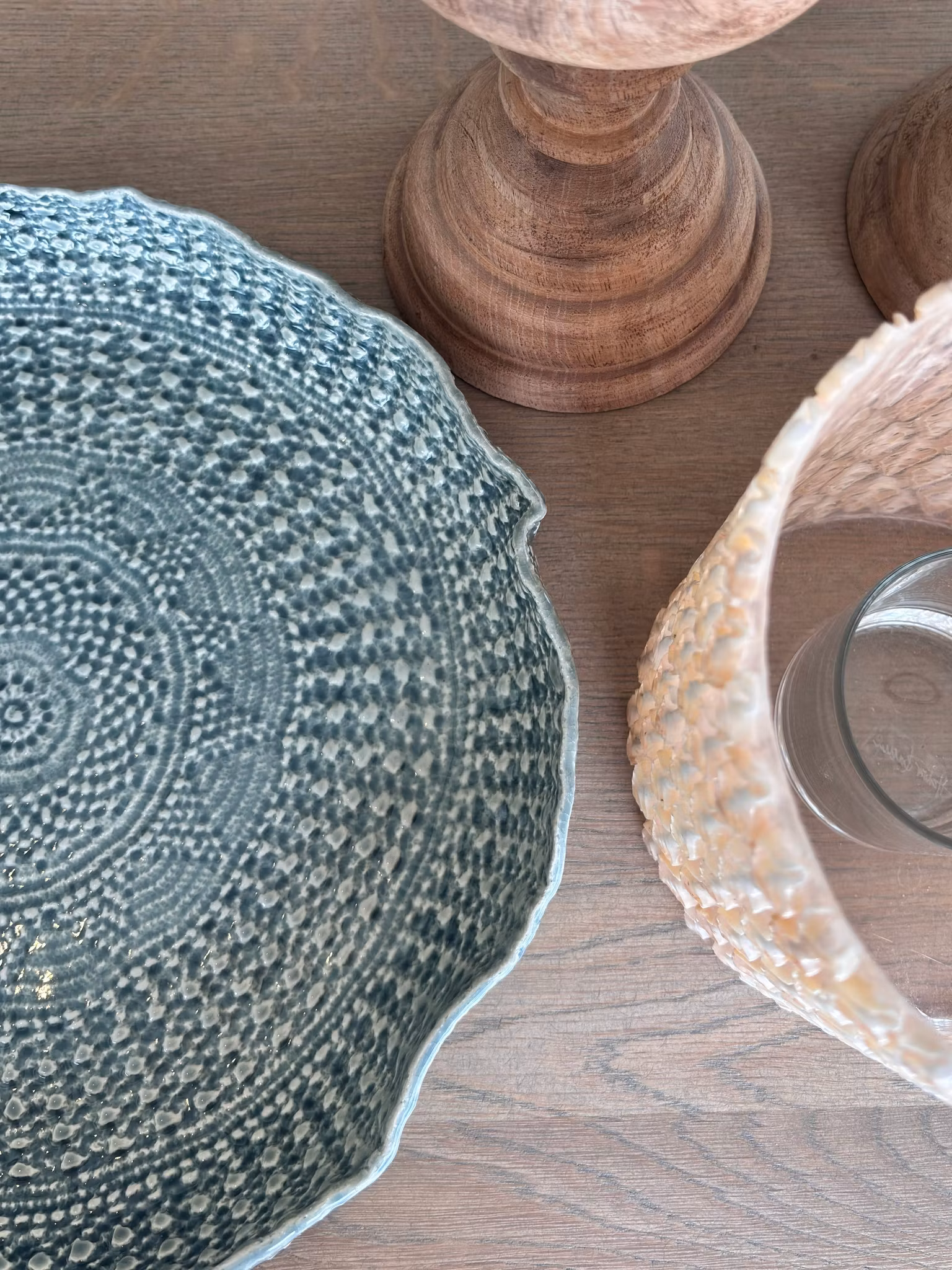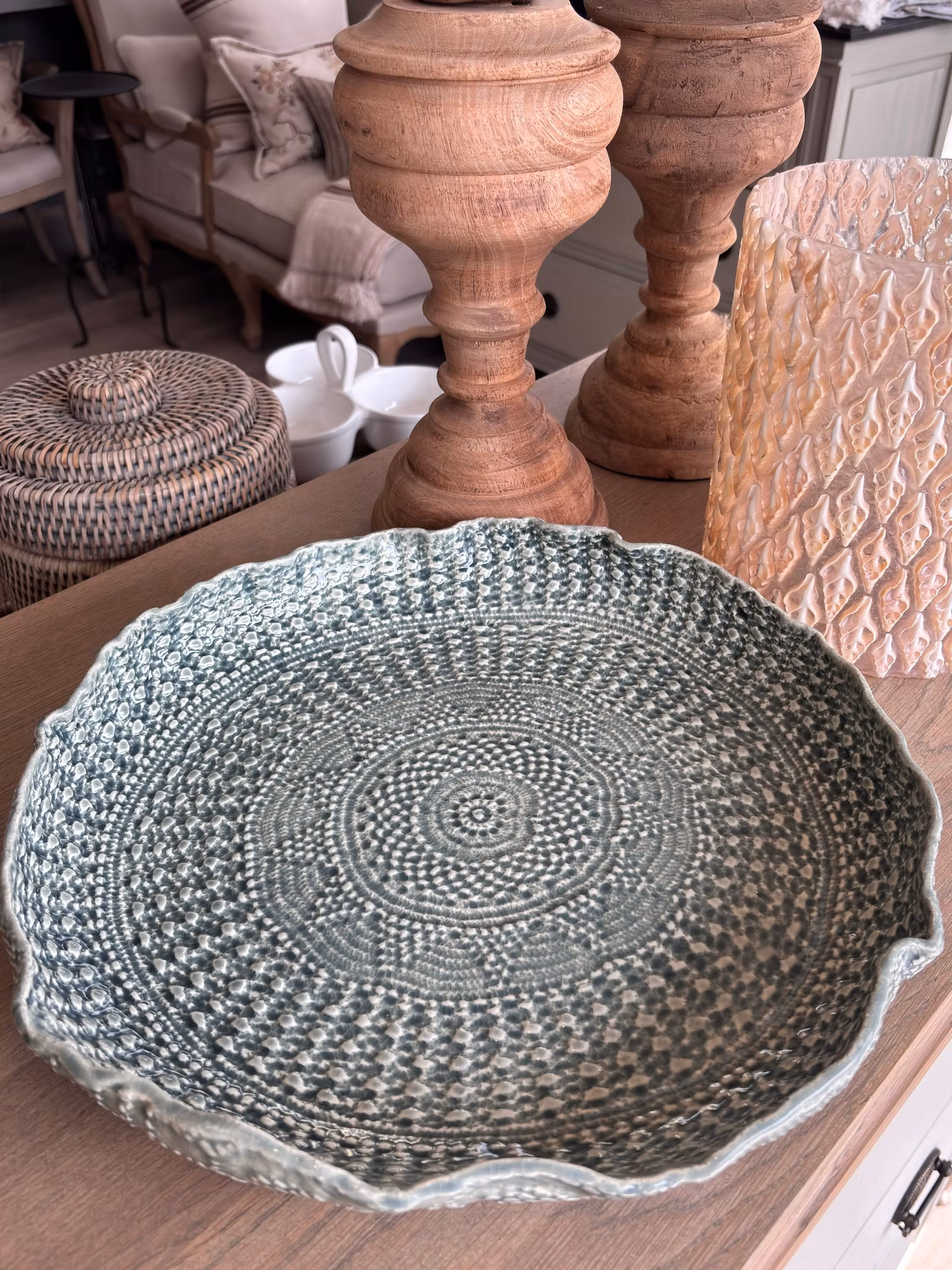 Nydelig mønster fra ny duk som gir dette fatet masse liv og vakker struktur, i en vakker turkis farge.