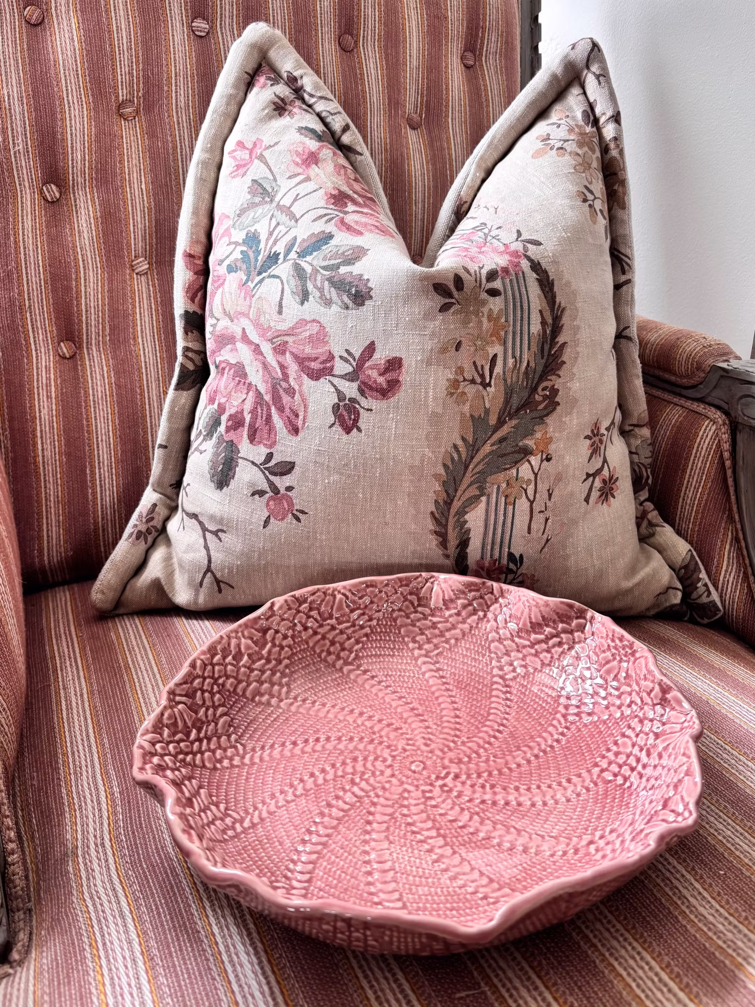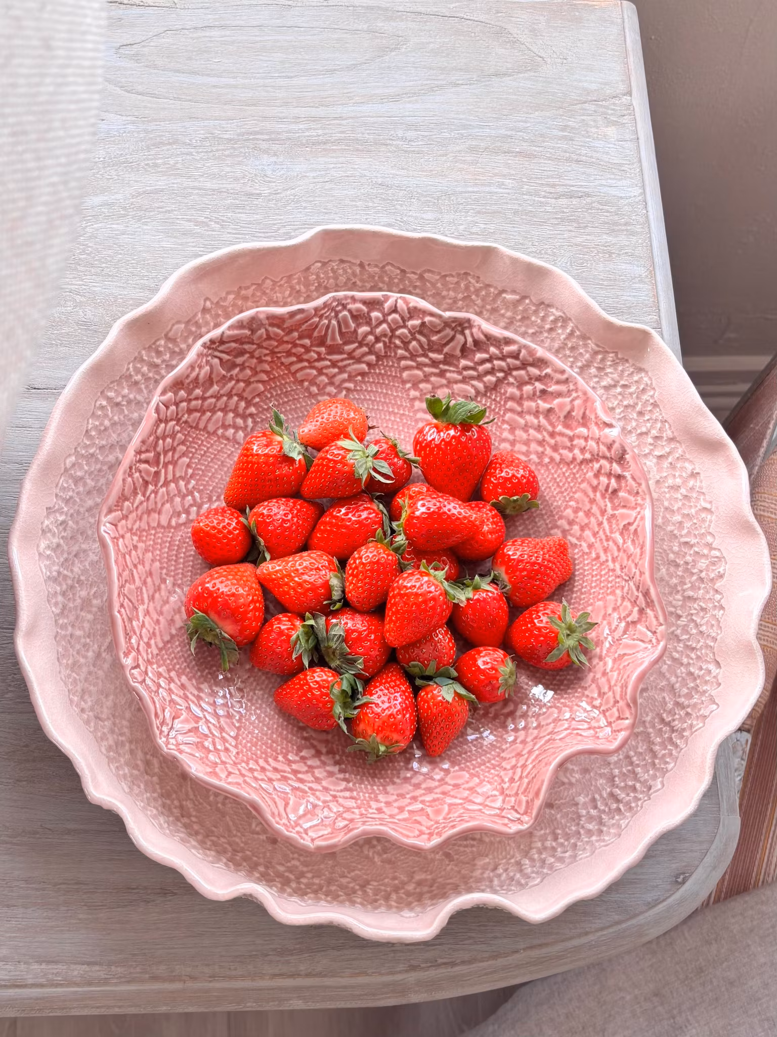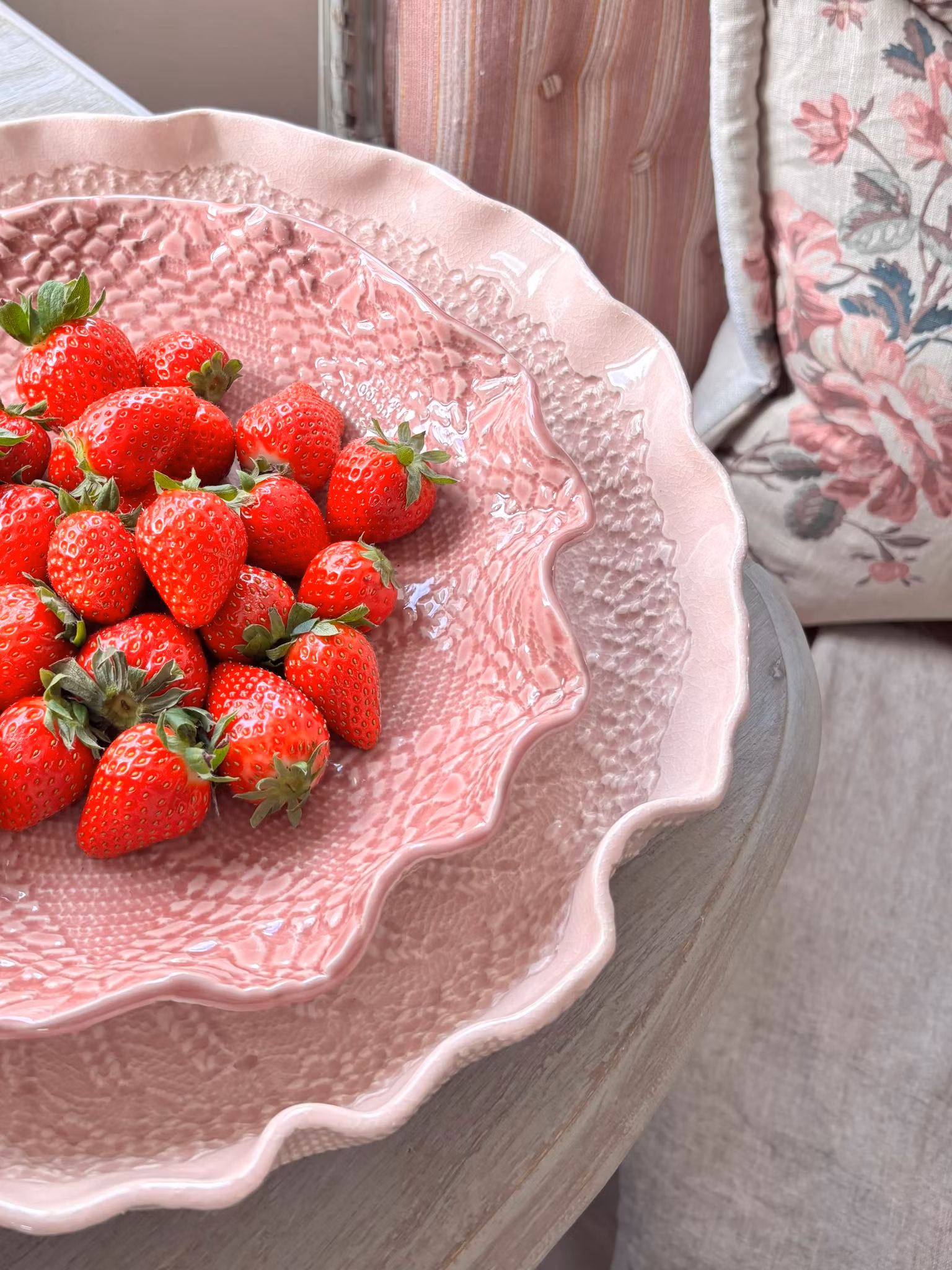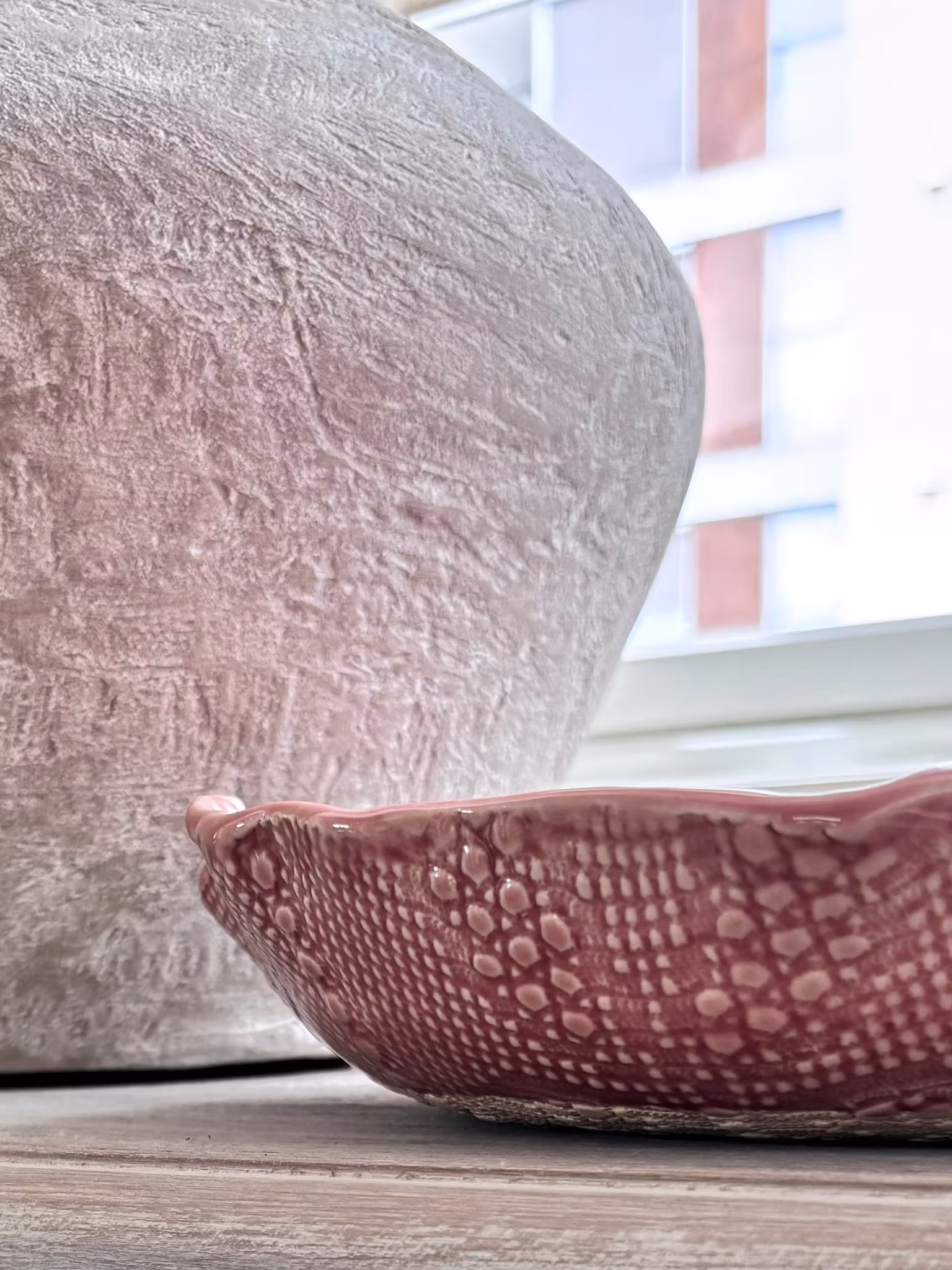 Vakkert medium fat i vakre dusty-pink. Fint og tydelig avtrykk fra duk på både innside og utside. Passer til dekor, mat og snacks.