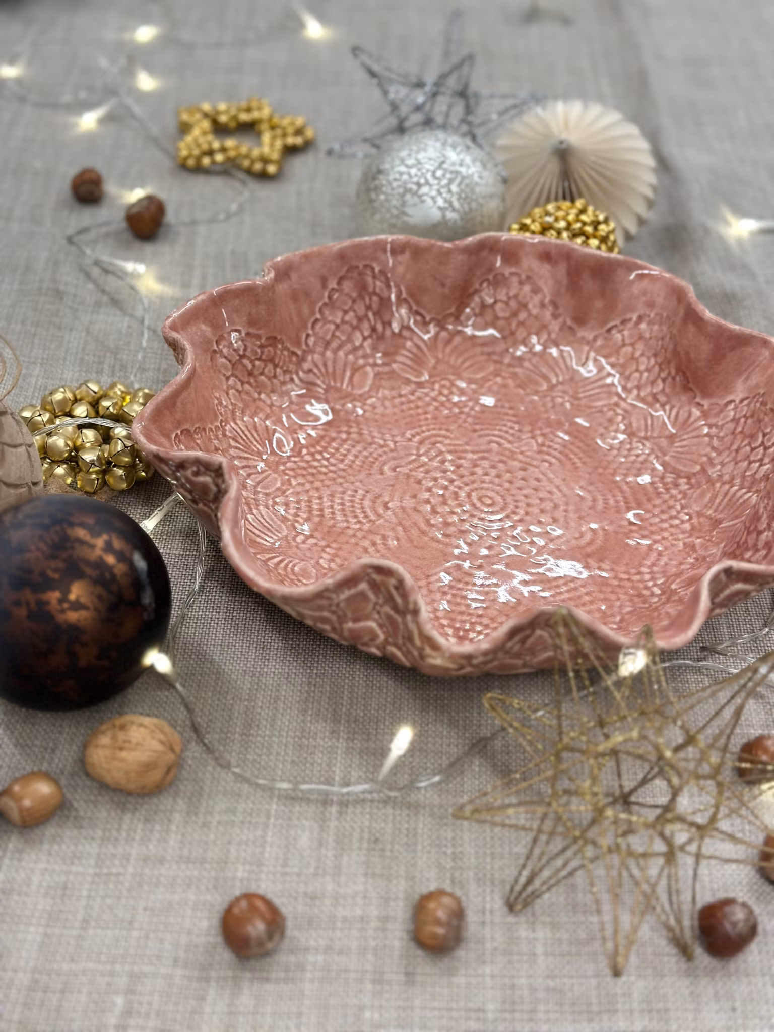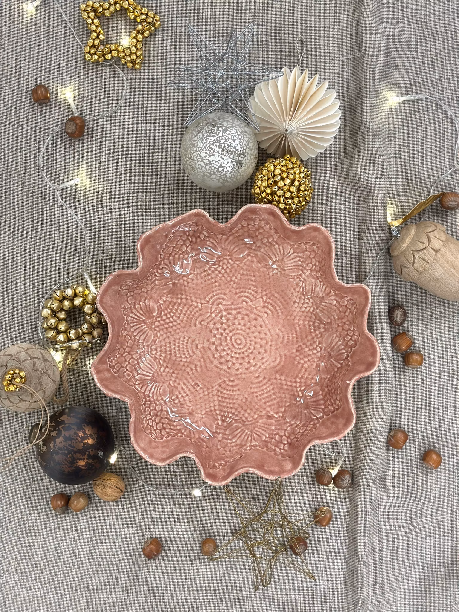 Et vakkert Medium fat med avtrykk av et en hekleduk inni som du ser hele med nydelige kapper. Leirekant øverst. Utenpå er det et avtrykk av et gammelt heklet sengeteppe.