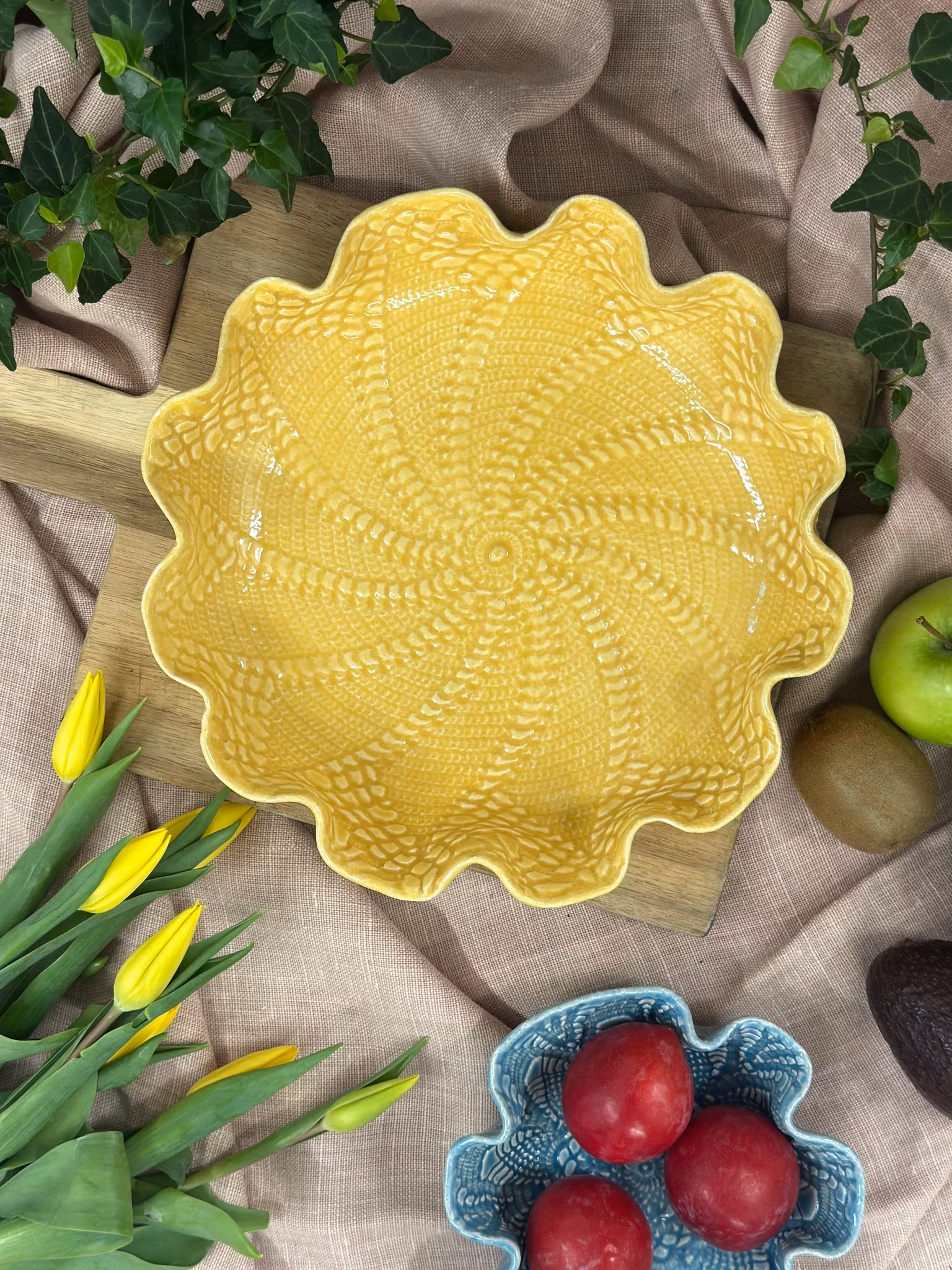 Et flott fat i nydelig gul med vidtemønster inni fra hekleduk. Utenpå er det avtrykk fra en gammel gardin.