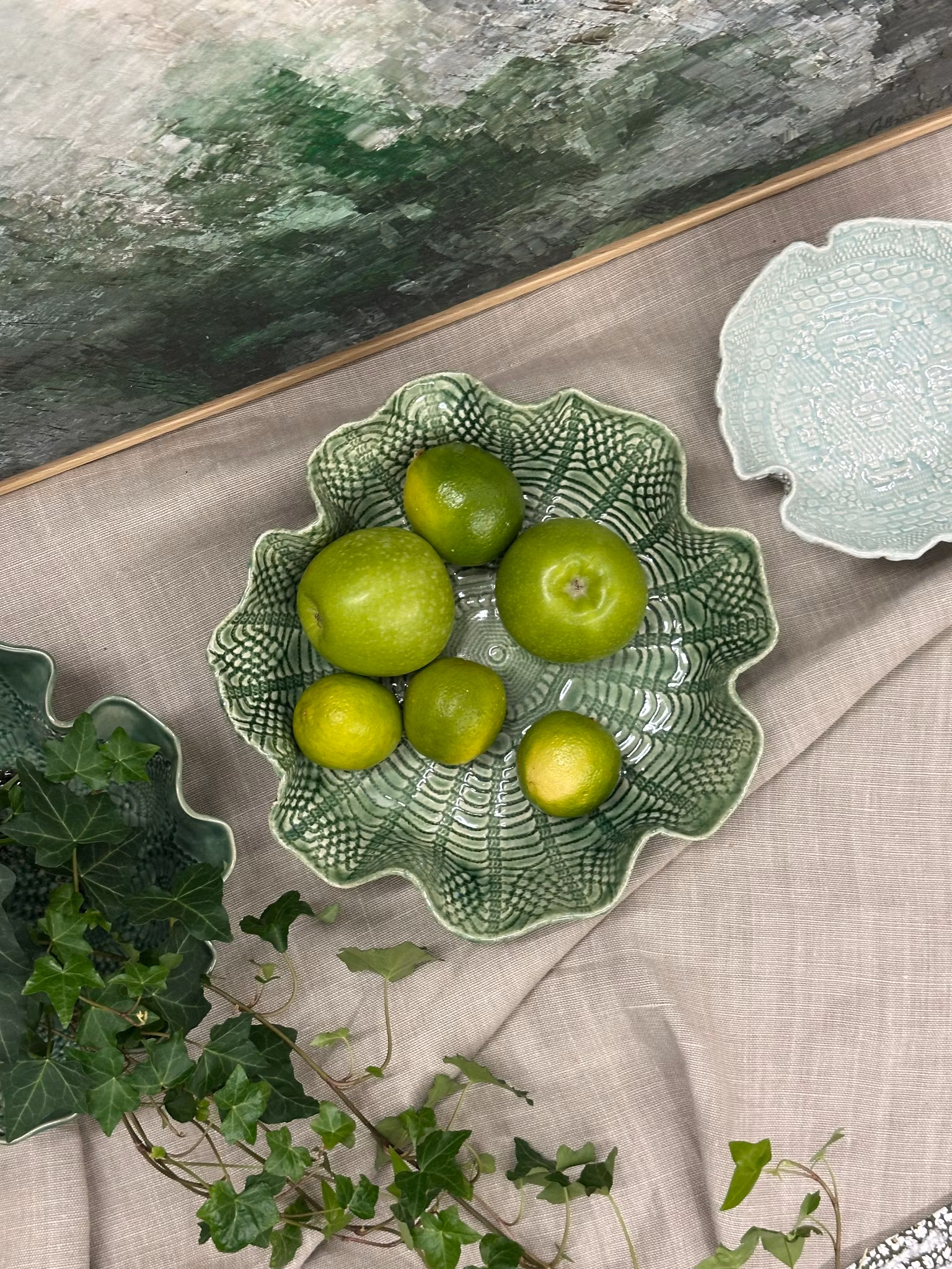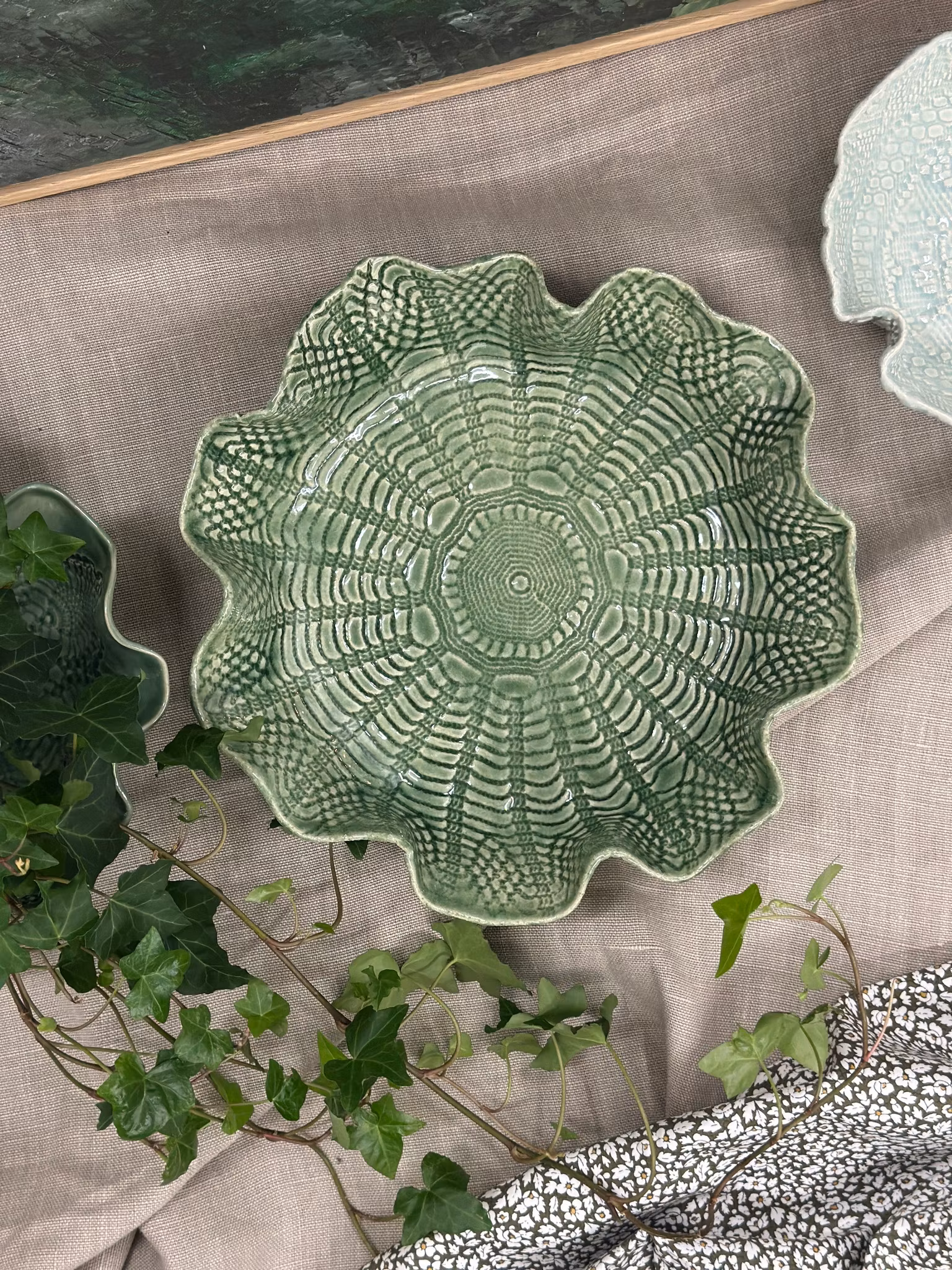 Veldig fint medium fat med et lekkert sentrert avtrykk av en hekleduk med er litt utypisk mønster. Utenpå er det sart avtrykk fra en gammel duk.