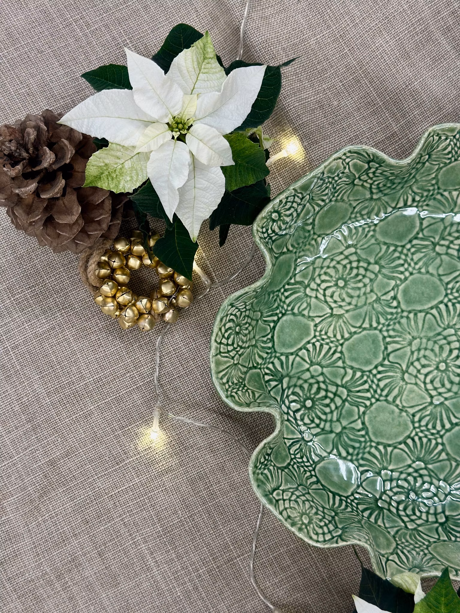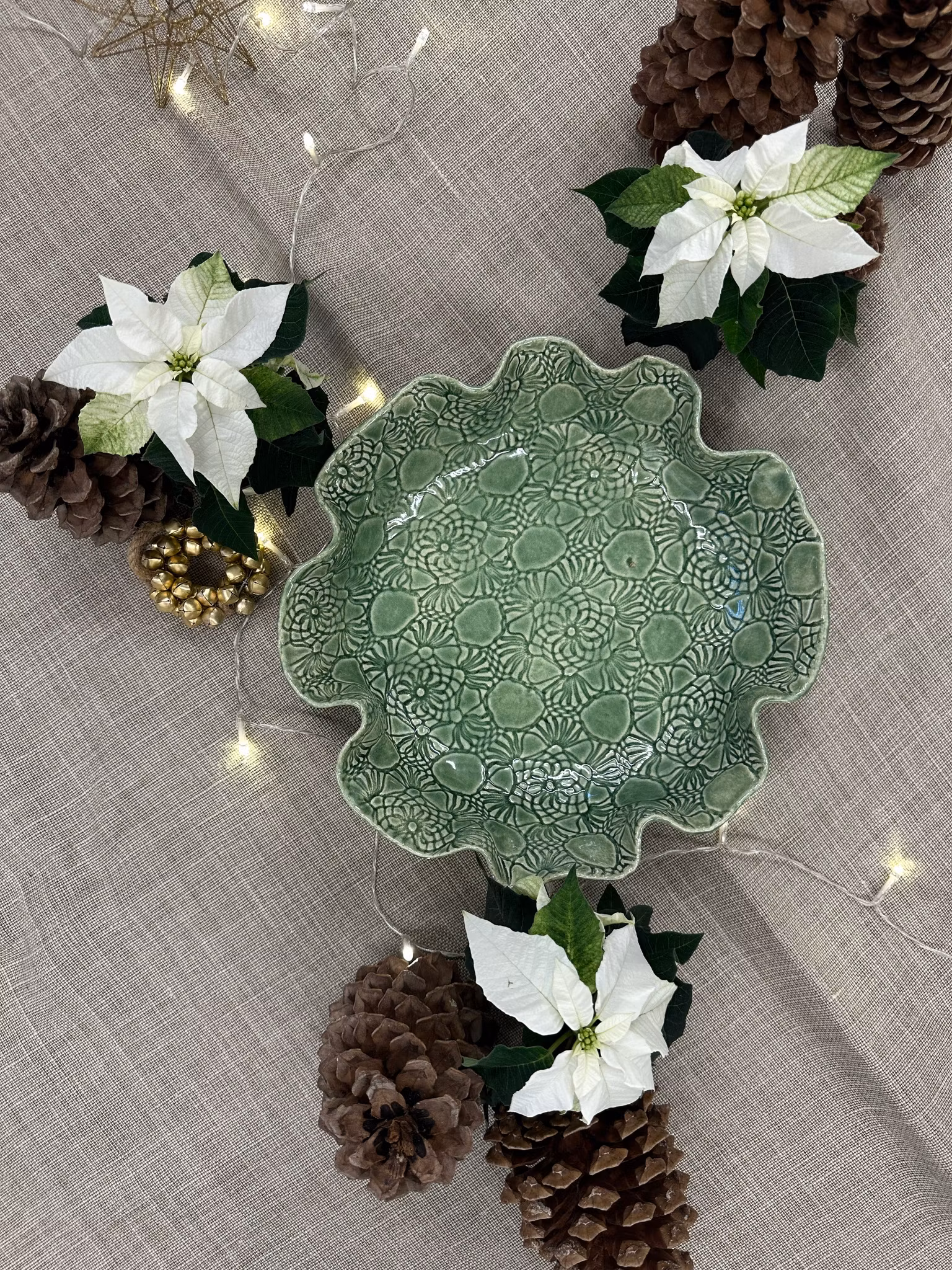Et vakkert Medium fat med avtrykk av et en kniplingsduk nni. Utenpå er det et avtrykk av en større duk.