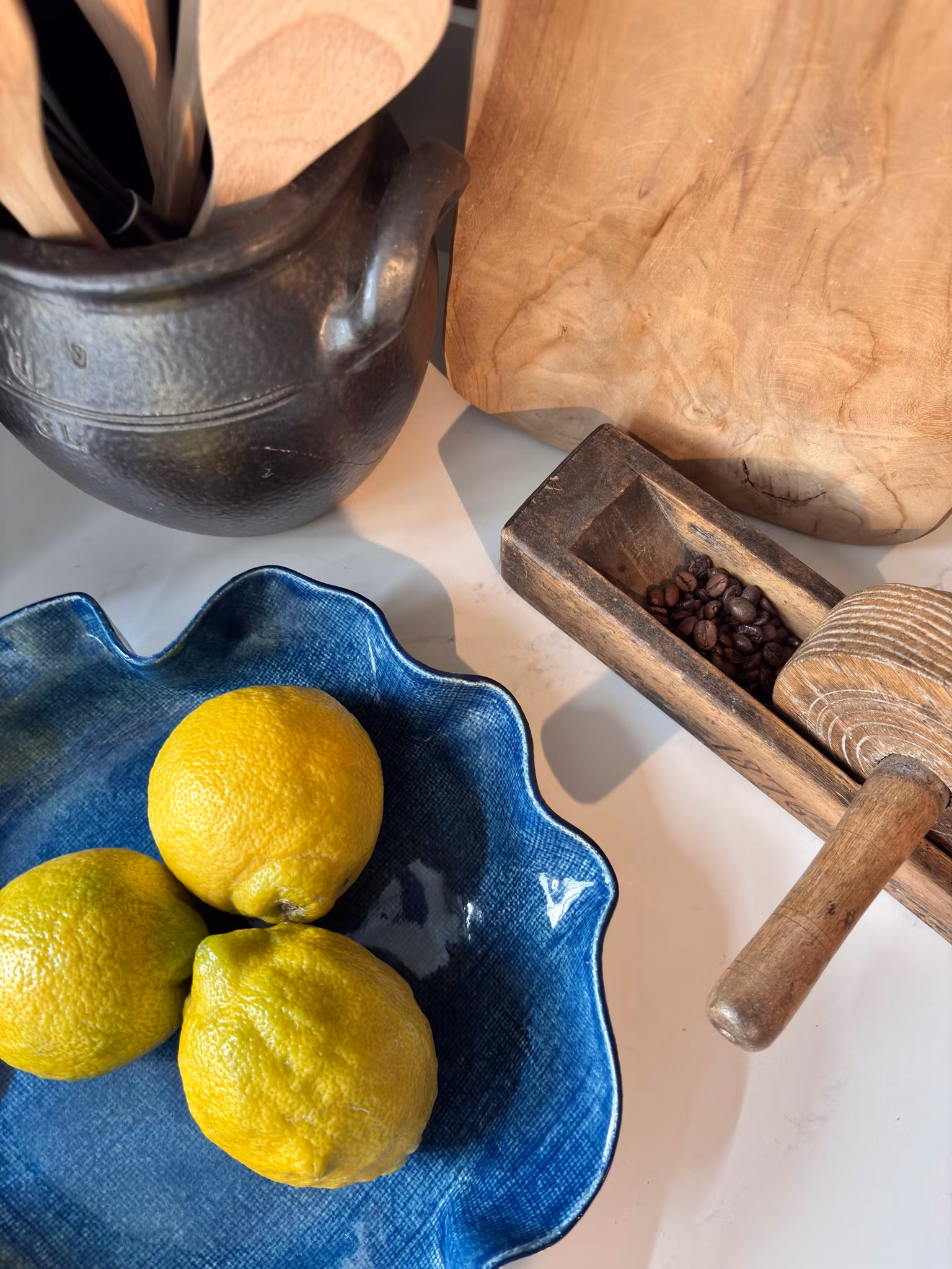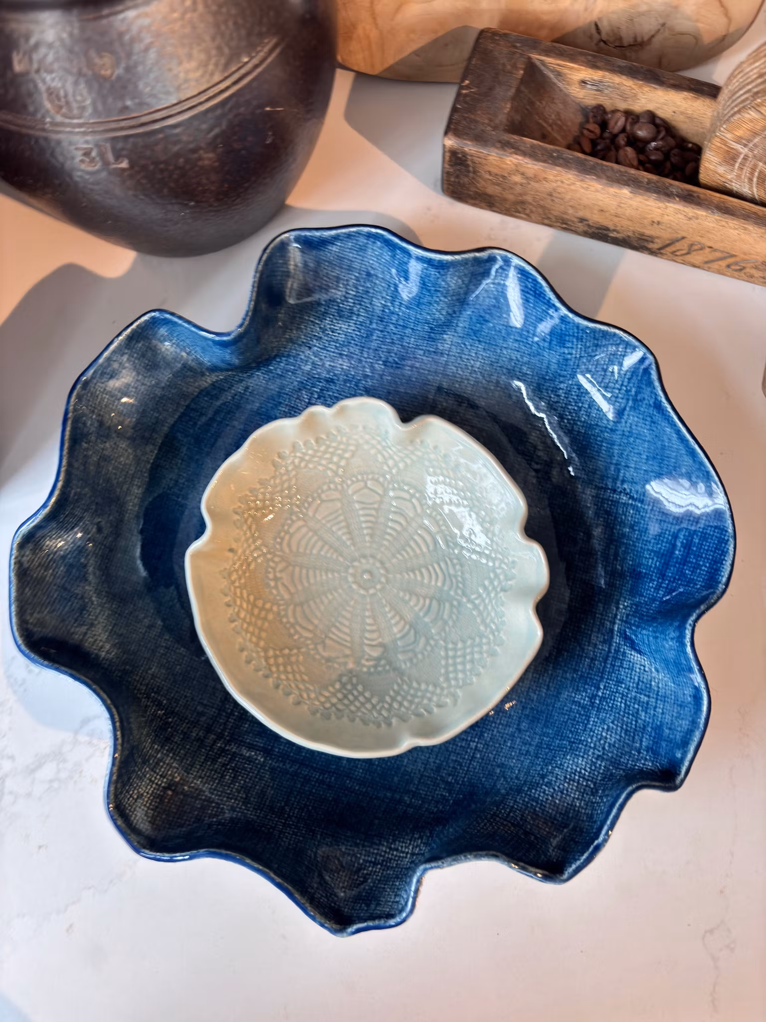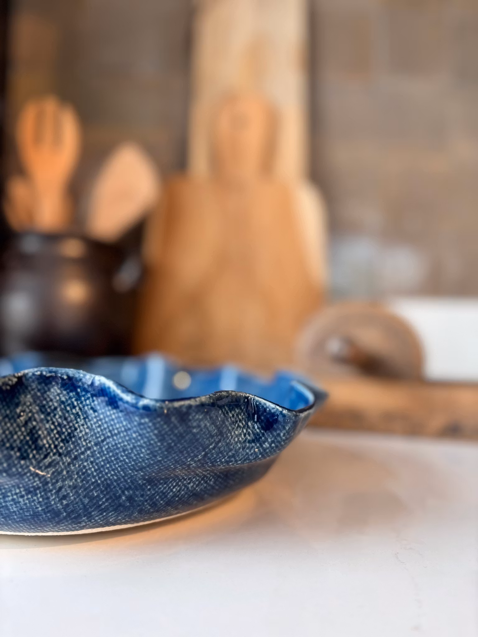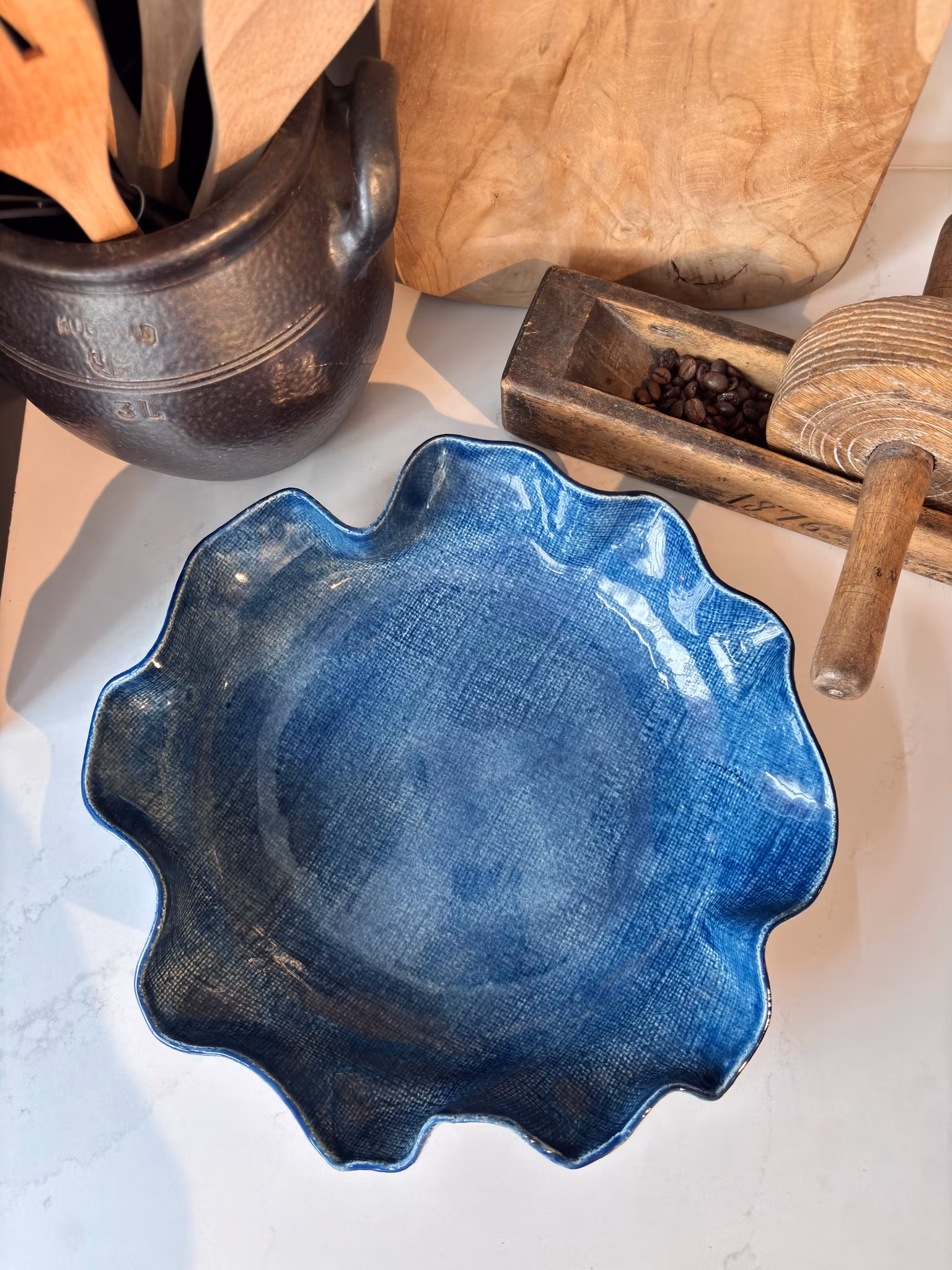 Nydelig medium fat med enkelt avtrykk av linstoff. Marineblå farge som gir fatet et utrykk av Ola-stoff. Perfekt til pynt og til servering.