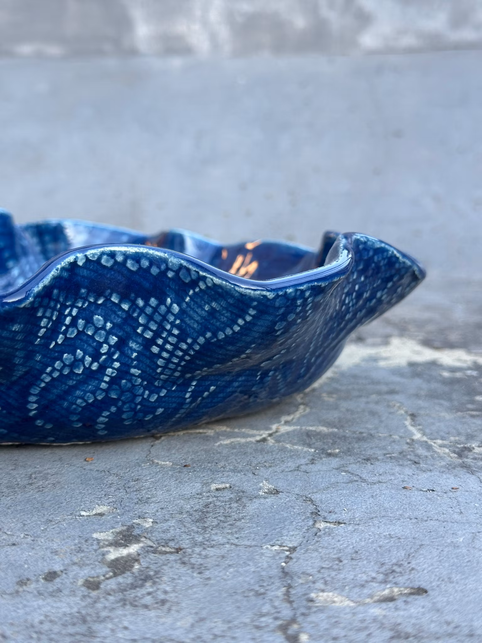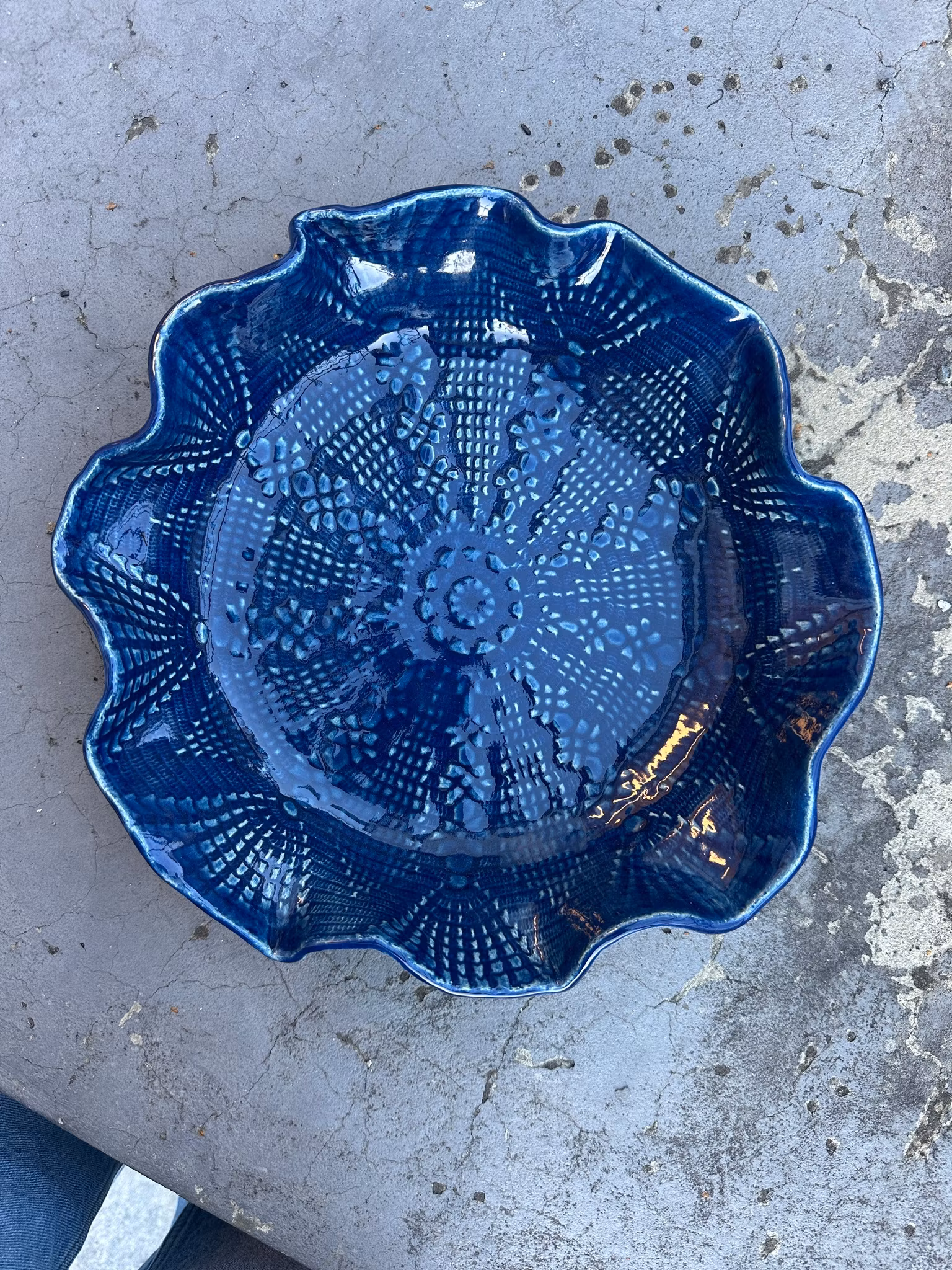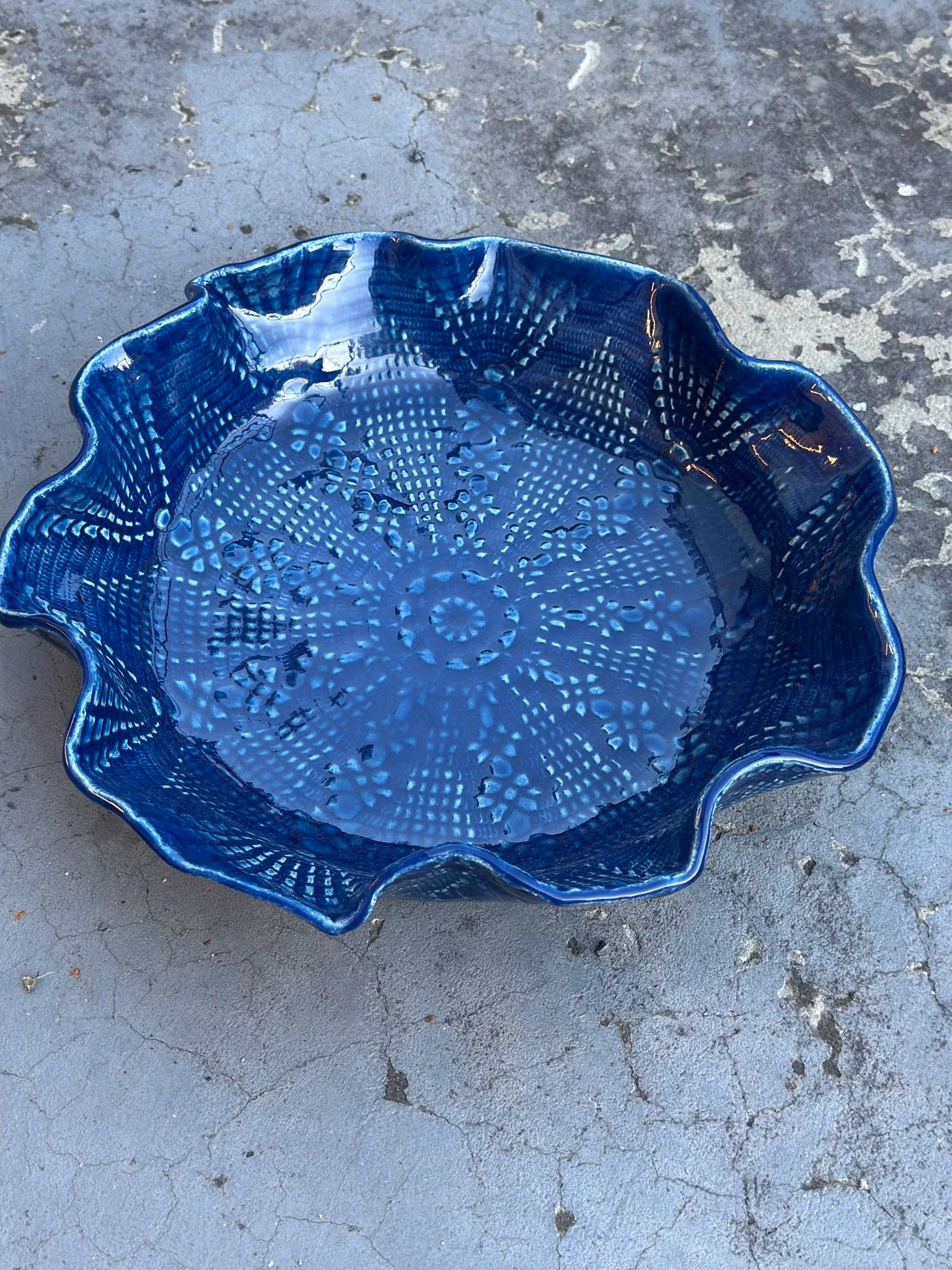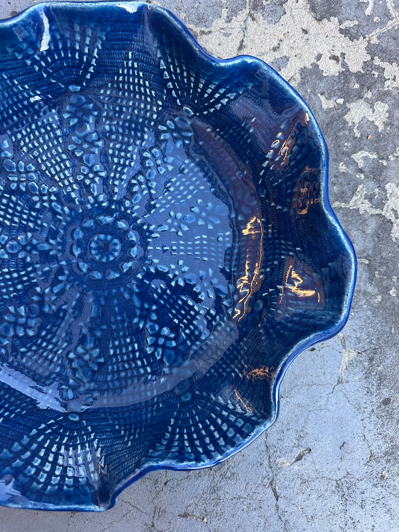 Medium størrelse fat med sentrert vakkert mønster fra en mindre hekleduk. Et roligere mønster utenpå