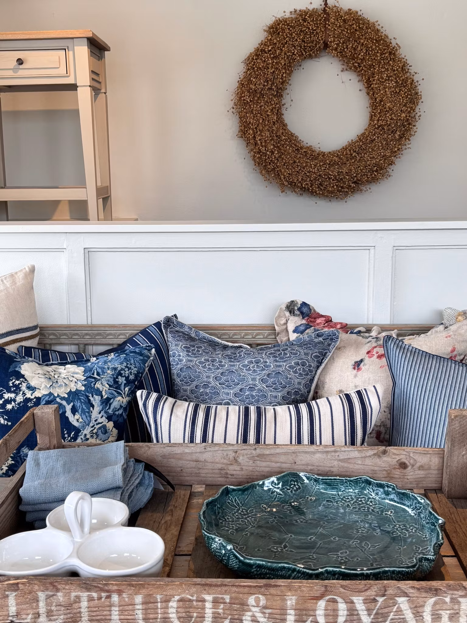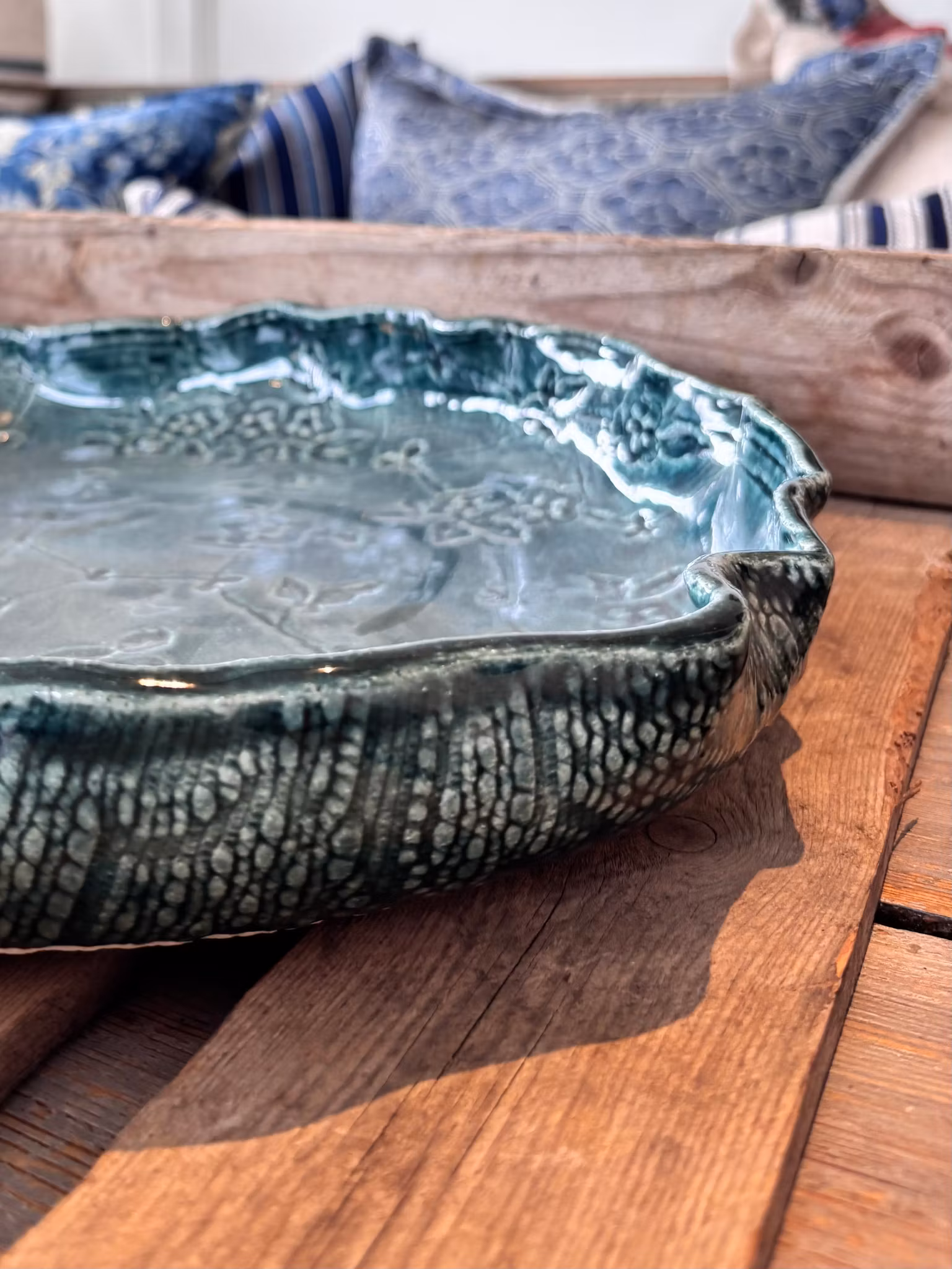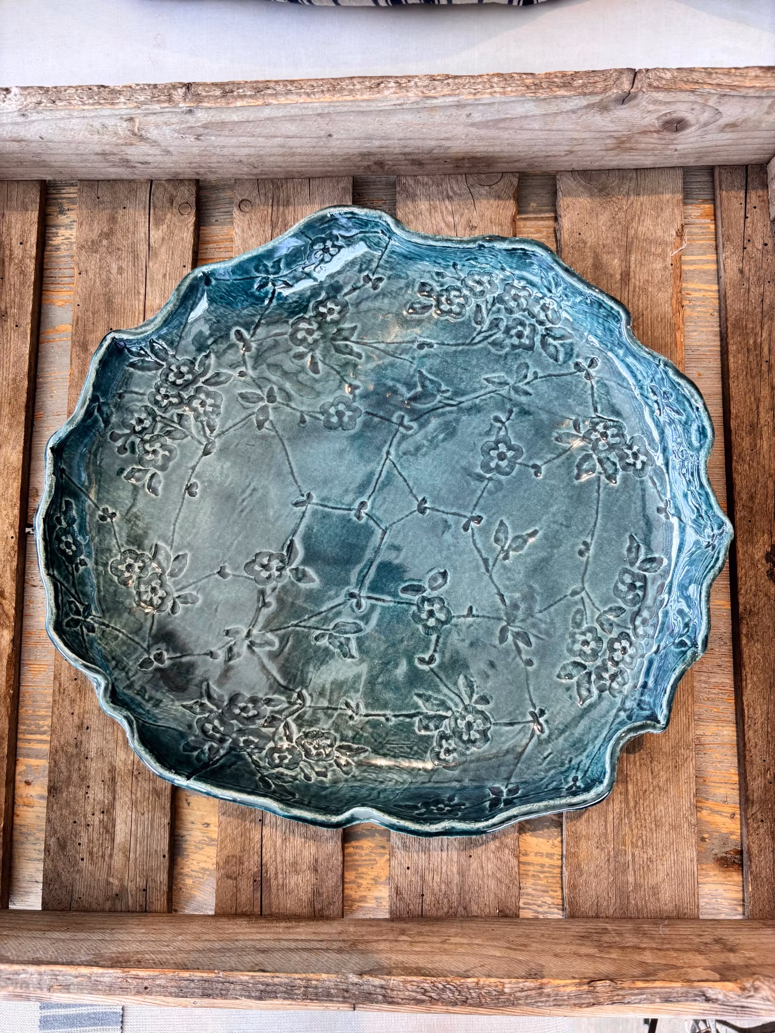 Vakkert mørkegrønt fat med avtrykk av blomstermønstret duk.