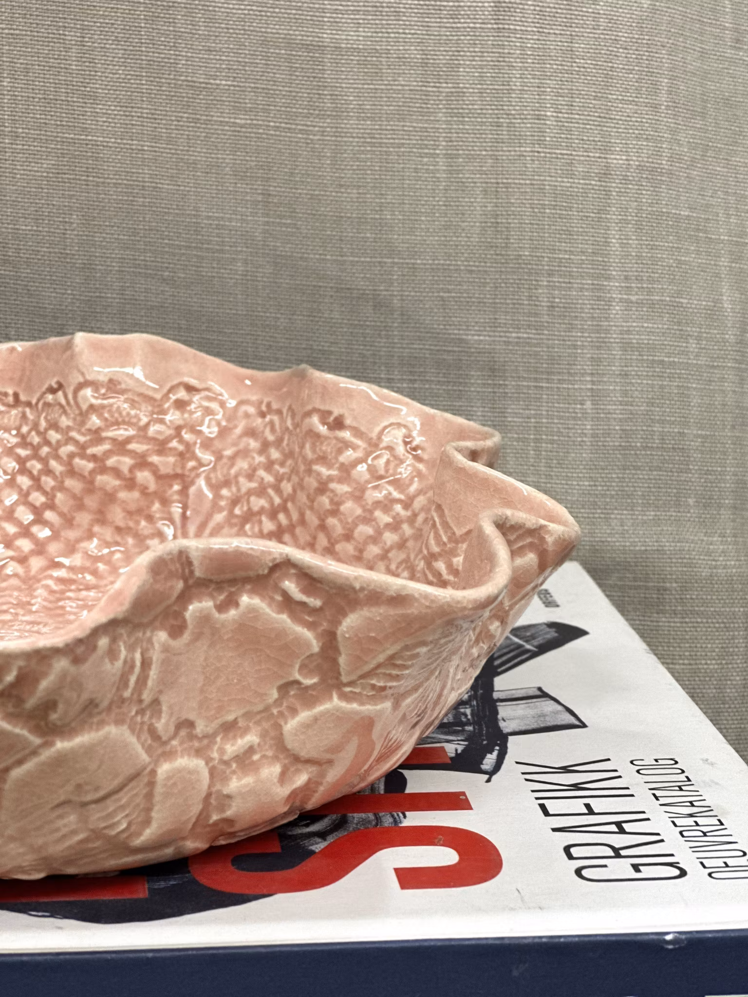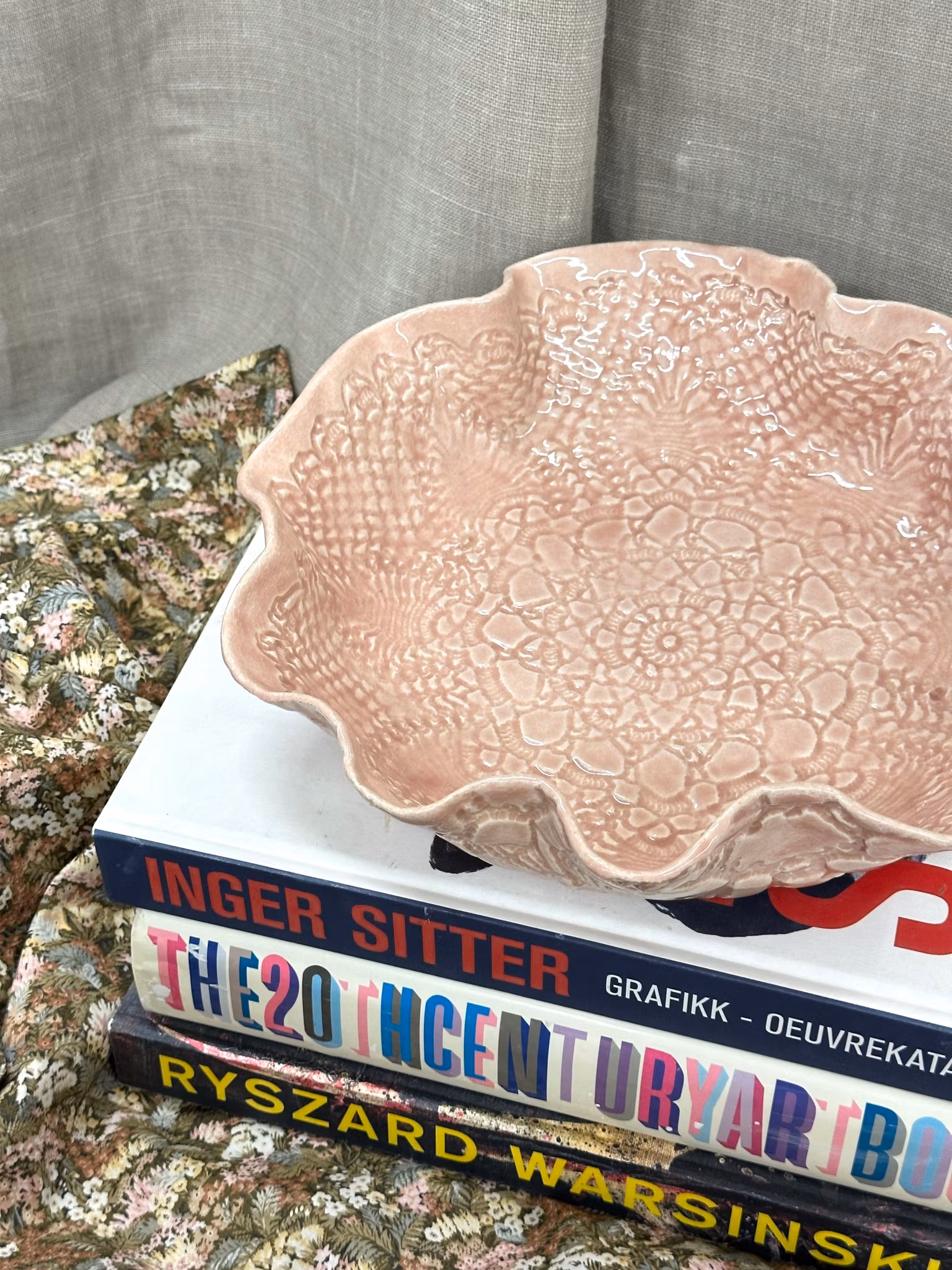 Nydelig medium størrelse fat i pudder. Mønsteret inni av en mindre heklet duk så du ser hele leirekant helt øverst. Utenpå mer grovere avtrykk fra et sengeteppe.