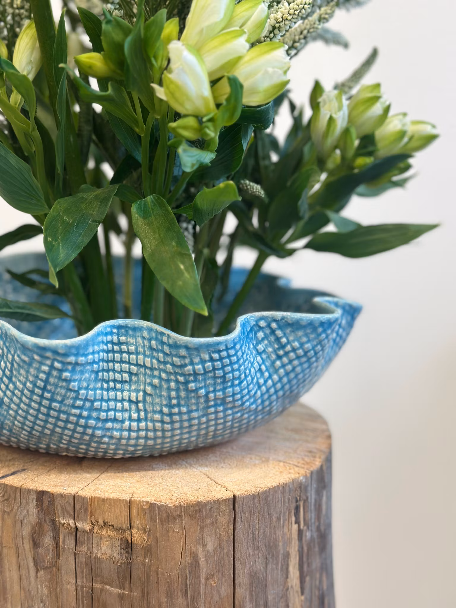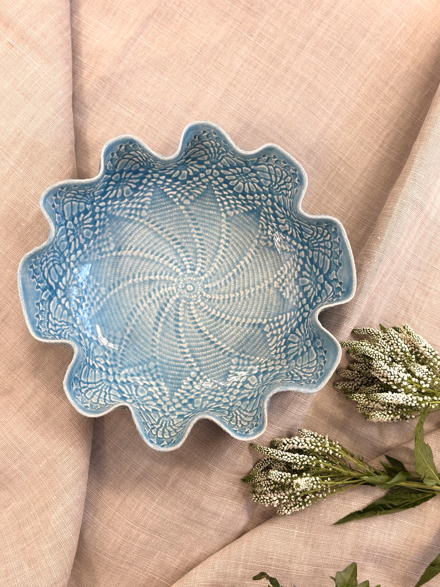 Nydelig skål i turkis med avtrykk fra en duk med vifteform inni! Utenpå er det mønster fra en gammel gardin.